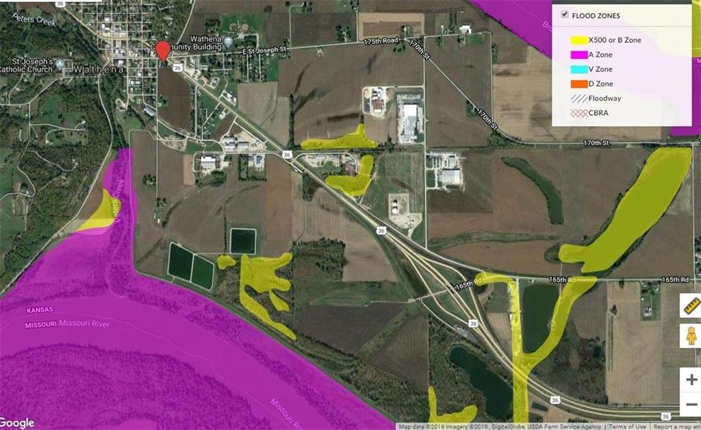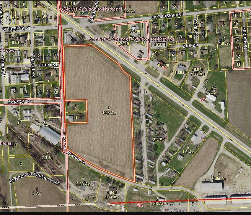15.8 acres currently zoned B-G, business, in Wathena, KS. Ideal for industrial use, seller will co-operate in re-zoning. Property can be divided as shown on the attached plat in photos. Site A - $2.00/SF. Site B - $1.25/SF. Site C - $1.00/SF