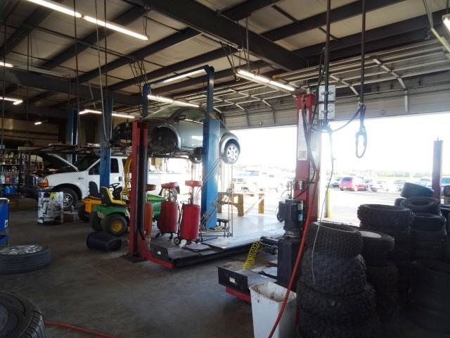 Full Operating Auto Repair Shop 1/2 City Block. Butler Bld all steel/Conklin Co white reflected roof. (6) 12' roll up doors, (2) 14' roll up doors, 3 phase power, 10x19 office space, 15x34 Show Room, (6) Lifts, (2) 12,000 lb. lifts, (2) 14,000 lb. lifts. Open front Alignment Machine & Rack. 1000 Gallon Buried Containment Tank drain in floor--separates oil & antifreeze. 24x40 Storage Rm. 50x105 Shop, 175 lbs. of constant air pressure from 2 tanks. Oil Changes, Breaks, Shocks, Struts, Tune-ups, Air Conditioning, Alignment. Winter Gas Furnace, Electric Air, Close to I 49. Located with easy access to highway. Full service/tire repair & purchase. Mechanic on duty, South & North Doors for great summer ventilation. Concrete parking, Storage loft, 2 bathrooms. 26' Inside clearance. Customer Service & Courtesy is #1