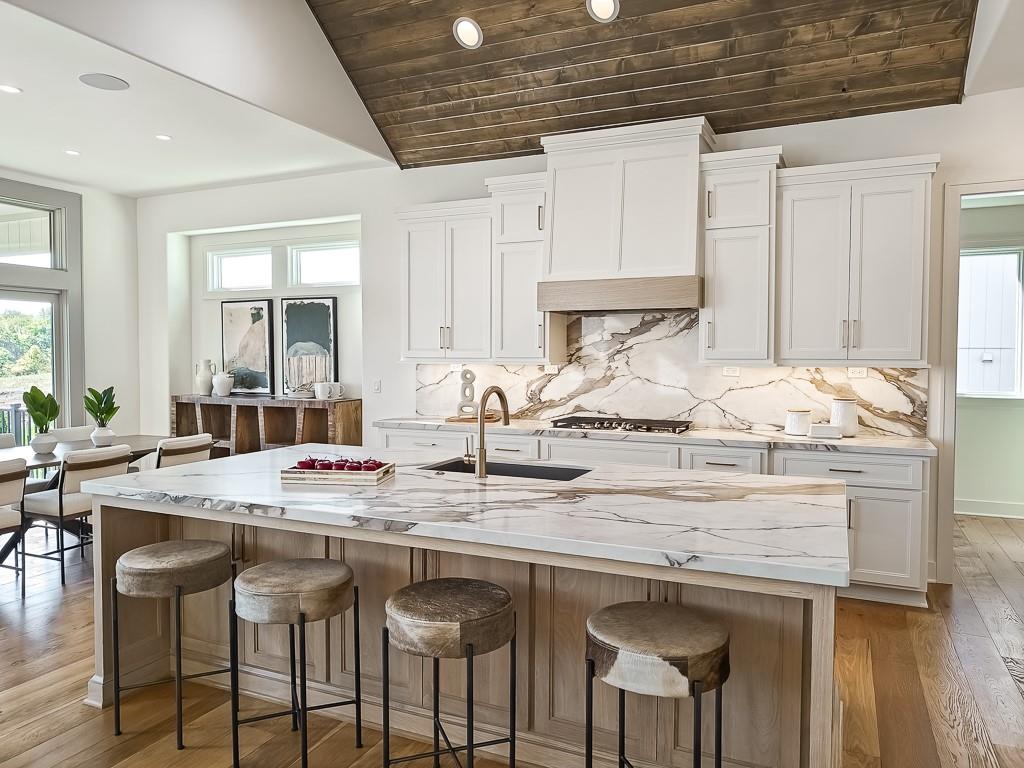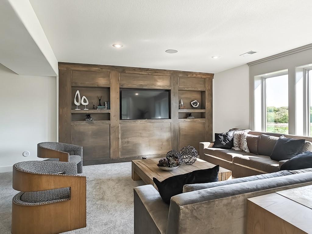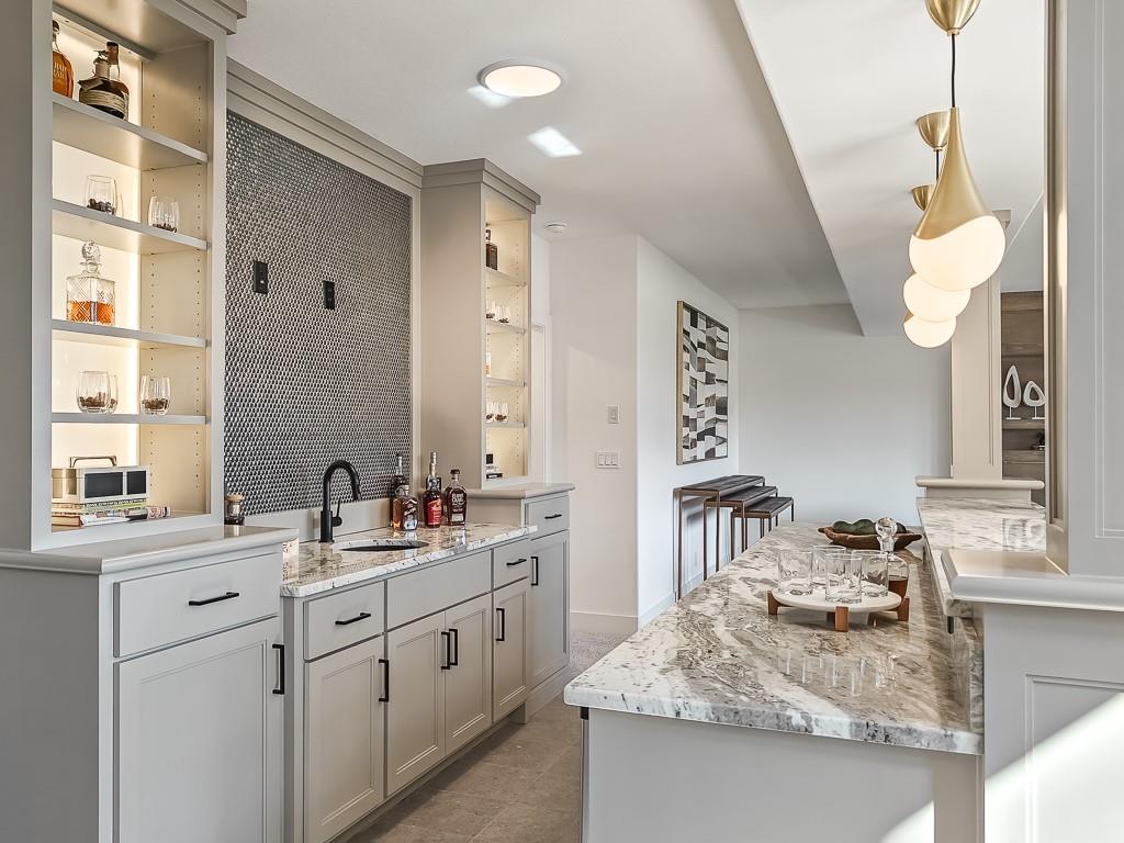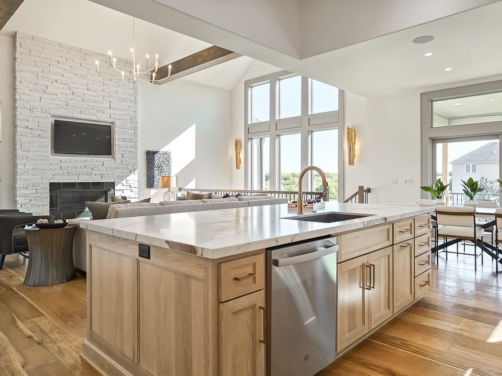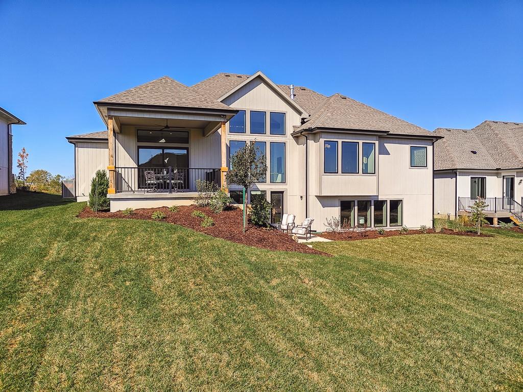Welcome to the gold award-winning Brookridge IV by the esteemed Don Julian Builders. This reverse 1.5-story model in Bristol Highlands Estates blends luxury with livability. Enter through double doors into a dramatic foyer and great room with 2-story windows, vaulted wood-beamed ceiling, and a striking stone fireplace to impress from the moment you step inside. The kitchen shines with an oversized island, 5-burner gas cooktop, custom hood, vaulted ceiling with skylights, and a massive walk-in pantry with prep space and second fridge. Just off the dining area, step onto the covered deck—perfect for morning coffee or unwind in the evening with a view. The main-level primary suite offers a spa bath with dual vanities, soaking tub, tiled shower, and a walk-in closet that connects to the laundry. Two more bedrooms, a full bath, and a powder room for guests round out the main floor. Downstairs, the finished walkout basement is built for fun with a media wall, rec room, game space, spectacular bar, plus 2 more bedrooms with private bathrooms that walks out to a patio for another outdoor entertaining space. Nestled in the rolling hills of Shawnee, Bristol Highlands offers stunning views and a peaceful setting. Enjoy top-rated De Soto schools, shopping, dining, and outdoor recreation with nearby parks, trails, Shawnee Mission Park, and multiple golf courses. It’s the perfect balance of convenience and natural beauty. THIS IS A MODEL - NOT FOR SALE on lot 13.