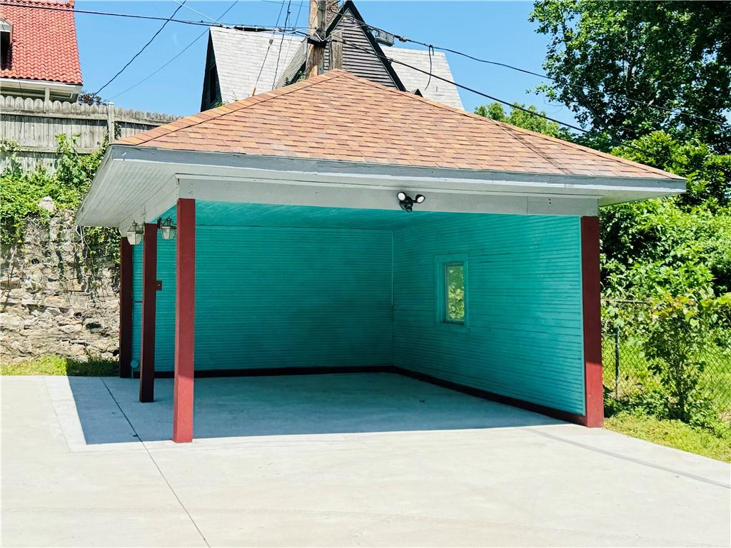 View of front of house with a carport, a front lawn, a garage, and an outdoor structure