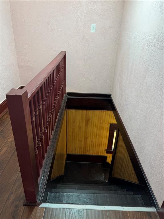 Stairs featuring wood walls and hardwood / wood-style flooring
