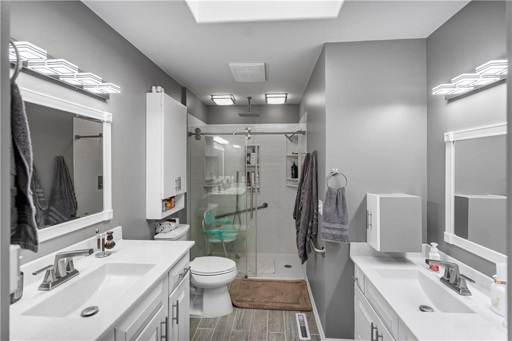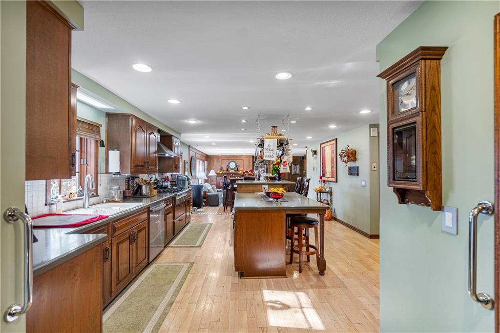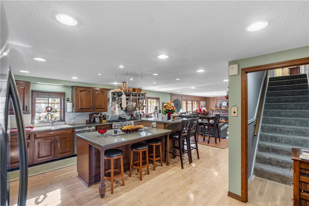 This home is located across from #16 tee box in the Independence Country Club. It has been very well maintained with plenty of updates and added features. Fully equipped gourmet kitchen with state-of-the-art stainless-steel appliances including a 36" cooktop, range hood, oven mounted in island, and pot filler above cooktop. Kitchen island seats dinner for eight along with a breakfast area that will seat up to six to eight. Kitchen has plenty of kitchen cabinets including a pull-out pantry. Large laundry with extra storage and utility sink right off of the kitchen. The music room located just off of the kitchen would make a great office, hobby area, or a 4th bedroom. There is also a half bath off the kitchen and laundry. Spacious formal/dining area. Kitchen/family room combo has a fireplace. Primary bedroom and bath are on the main floor and the bath is mobility accessible and is all new earlier this year. Double vanities, full shower with three shower heads including a rain shower head. Bath also has a skylight that is controlled with a remote. Upstairs features two spacious bedrooms, full bath that is recently updated, and a great living area for family time or office space. There are walk-in attics off each side of the upstairs living space including a cedar closet. Basement is large with a LOT of storage, workroom, work area, and a walk-out area with a garage door to store lawnmowers or golf carts. Additional storage outside for garden tools, etc. Full shutoff valves for gas and water are in the basement. Property is located on a large corner lot with a gorgeous view.