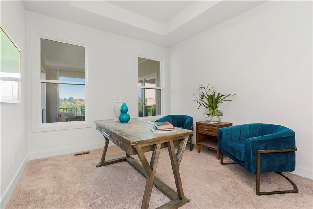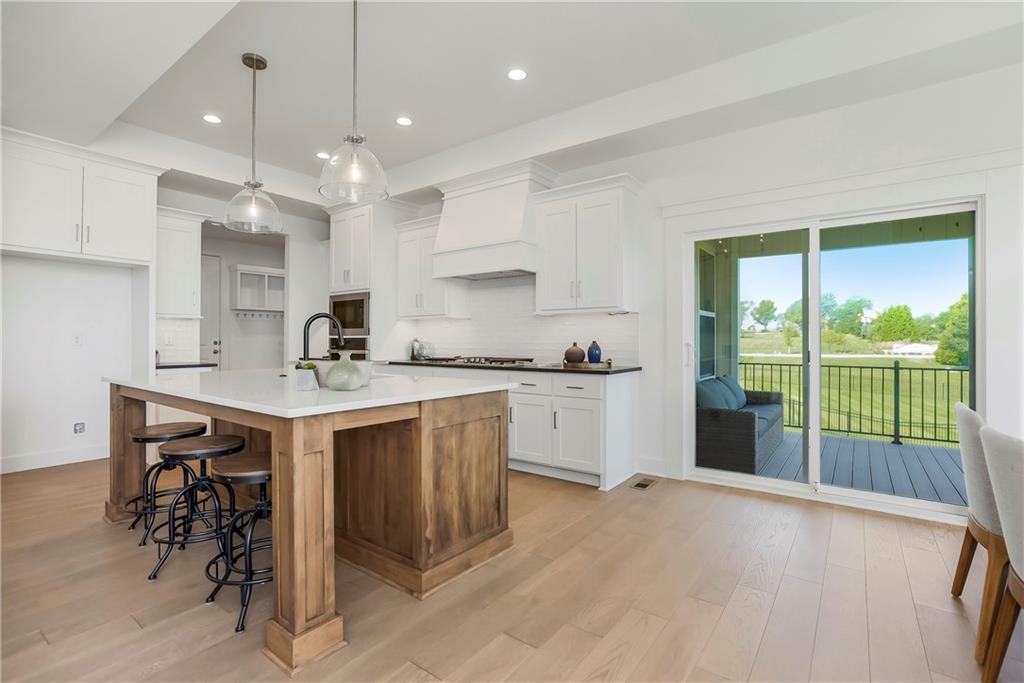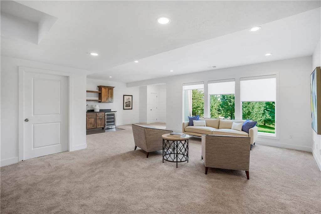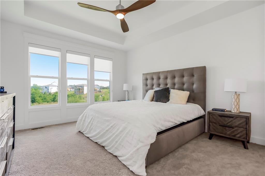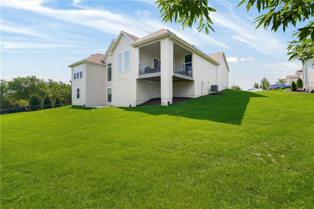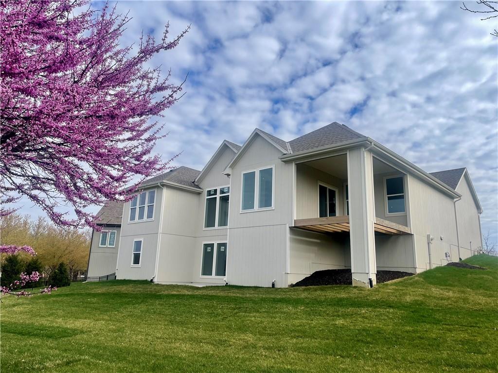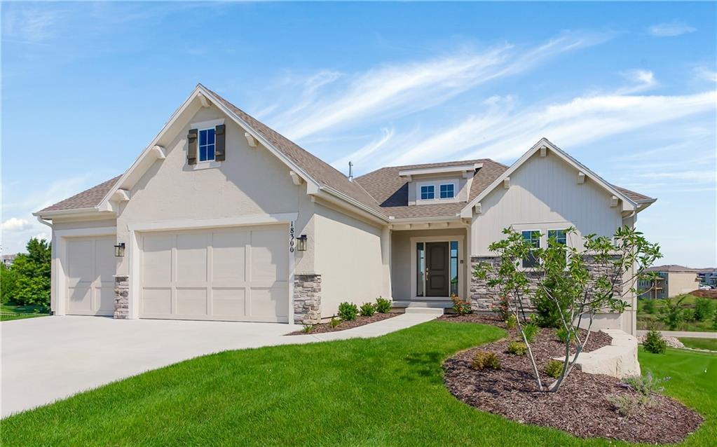 Price Improvement on this stunning reverse 1.5 story constructed by Rodrock Homes. Spectacular open floor plan with a vaulted ceiling in the great room, stone fireplace, and wall of windows across the back of the home, allowing an abundance of natural light in. The impressive kitchen features a large island, a walk-in pantry, and a drop zone off the garage. The guest bedroom is behind the kitchen and can be used for a functional study. The primary bedroom has a vaulted ceiling and a luxurious bathroom with dual vanities, a walk-in shower, and a huge closet with a built-in mirror. You will love the views from your covered lanai located off the dining area. The finished Lower Level has an abundance of natural light and a bar. There are two additional bedrooms and a full bath. This home is ideally located at the end of a cul-de-sac, creating a private retreat! Award-winning Blue Valley Schools are nearby. Riverstone Valley community amenities are scheduled to open summer of 2026.