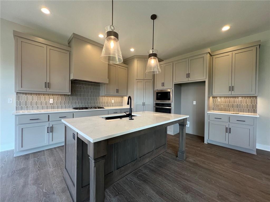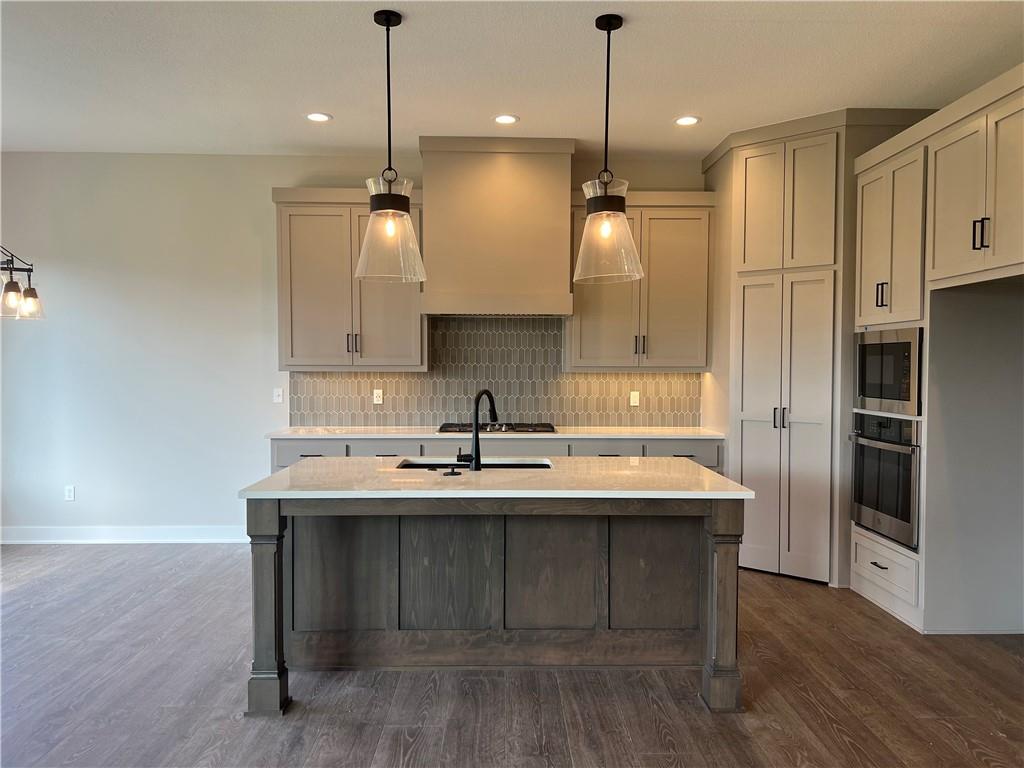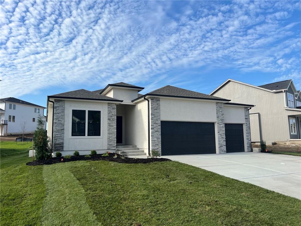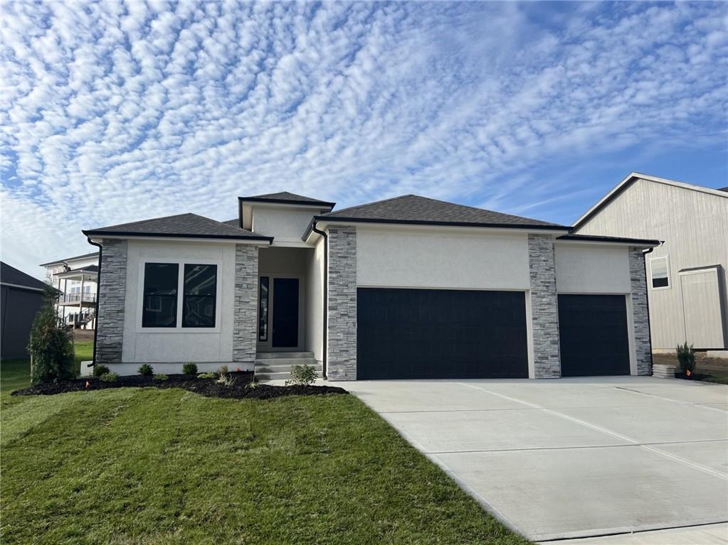MOVE-IN READY! Welcome to the Monterey reverse ranch with a true 5 CAR TANDEM GARAGE! This beautiful home offers an open concept living room, with a floor to ceiling fireplace, built in cabinets, and 10' ceilings in the great room! Then enjoy the adjoining designer kitchen with ample quartz countertops, tons of storage in custom, soft-close cabinetry, and upgraded laminate flooring. The large primary suite is highlighted by a luxurious bathroom with a his & hers vanity, huge 10' high shower, and spacious walk-in closet. And not only is there another full bedroom and bathroom on the main level, but the basement offers a giant rec room with custom wet bar and two additional bedrooms and a full bath. Inspired Homes also includes extra deep garages, 8’ garage & front doors, irrigation systems, garage openers, gas range cooking with built-in SS GE appliances, low-e Pella windows and doors, custom wood cabinetry, tray ceilings, and so much more! Also located in the peaceful and sought-after Hilltop Farms neighborhood in Olathe, this property offers a lifestyle characterized by both comfort and convenience. Residents can indulge in community amenities including a zero-entry pool and sun cabanas, a large "tot-lot" playground and gaga ball pit, pickle ball courts, basketball and volleyball courts, local walking trails, and expanses of green space to enjoy. All sports courts are currently in, with the pool & playground opening Spring of 2026! Notably, shopping destinations and restaurants are just a short drive away, providing residents with the opportunity to relish in the charm of a countryside atmosphere while benefiting from the practicality of urban living right in Hilltop Farms.