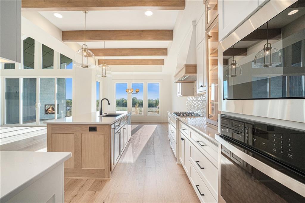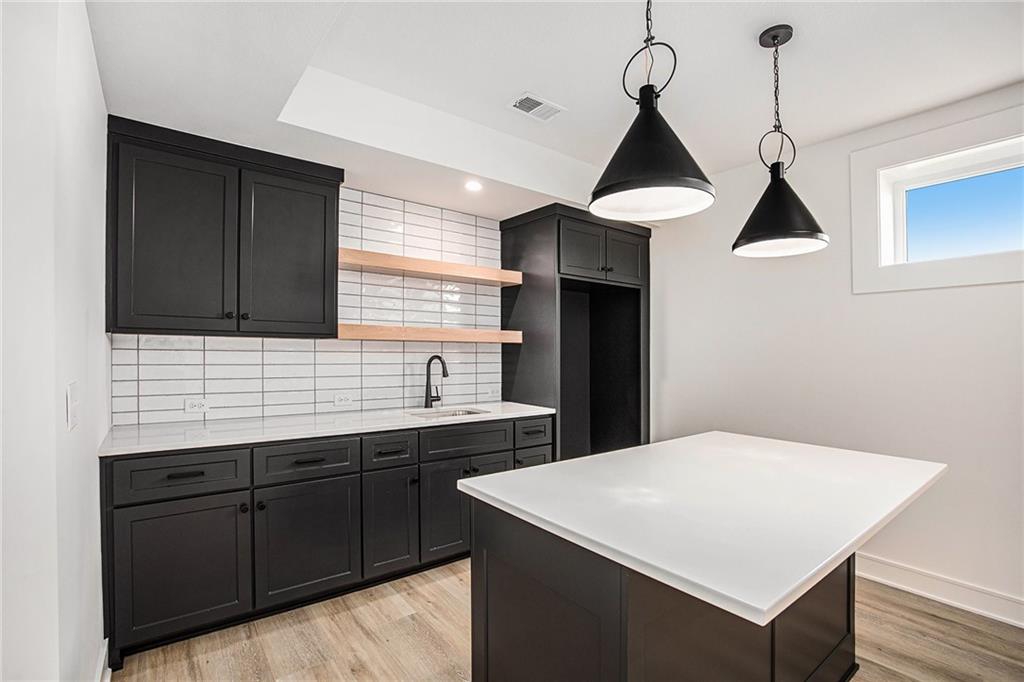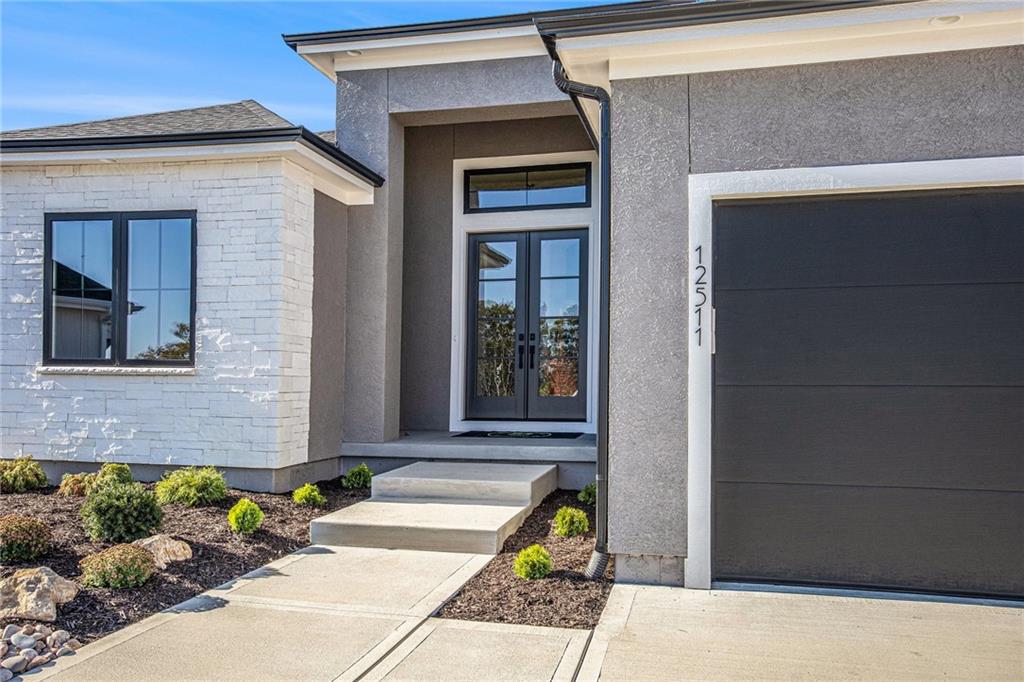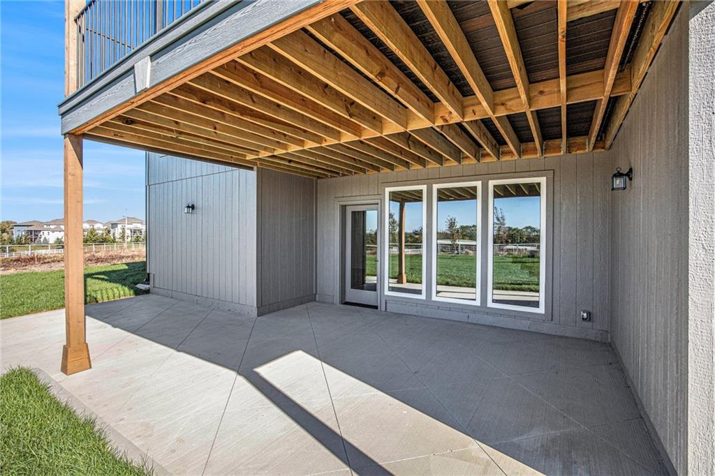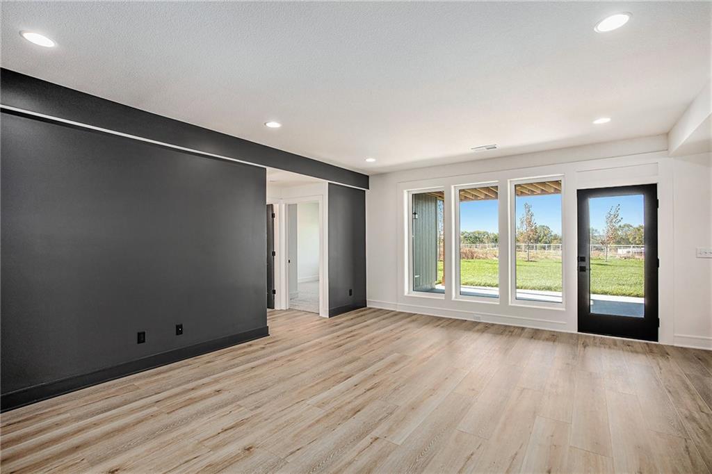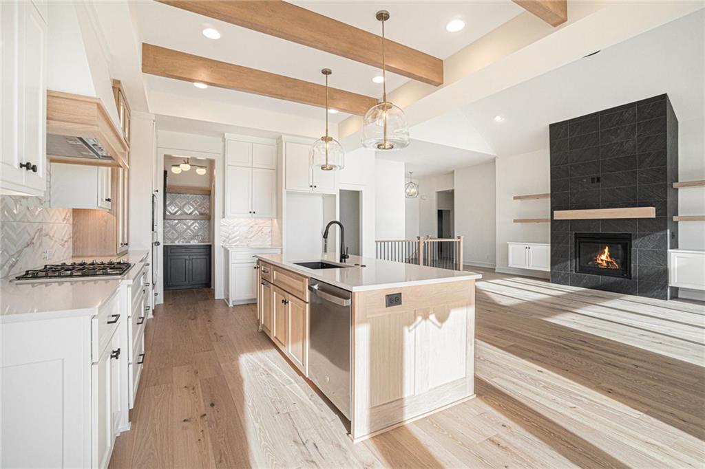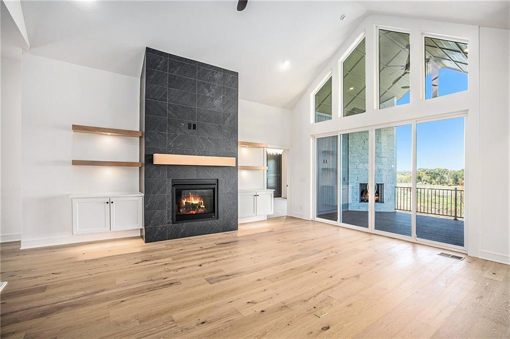 MOVE IN READY -"The Bayberry I" by JFE Construction, situated on Lot 90, is a Reverse 1 ½ Story residence featuring four bedrooms and three bathrooms. Upon entry through the impressive 8-foot double doors, residents are greeted by a spacious great room showcasing a vaulted ceiling, floor-to-ceiling fireplace, and expansive windows that create an open atmosphere. Large sliding doors seamlessly connect the great room to a covered deck equipped with a stone fireplace, offering an ideal space for entertaining. The kitchen is thoughtfully designed with a substantial island finished in quartz, stainless steel appliances, and a generous pantry that includes a built-in coffee bar. The primary ensuite features a free-standing soaker tub, double vanity, zero-entry shower, and a walk-in closet. A secondary bedroom or office is located on the main level. The finished lower level provides a family room, wet bar with island, two additional bedrooms, and a full bathroom. Enjoy access to the covered deck from the walkout lower level. Minutes from Blue Valley K-12 schools. Taxes are estimated. THIS HOME IS MOVE IN READY.