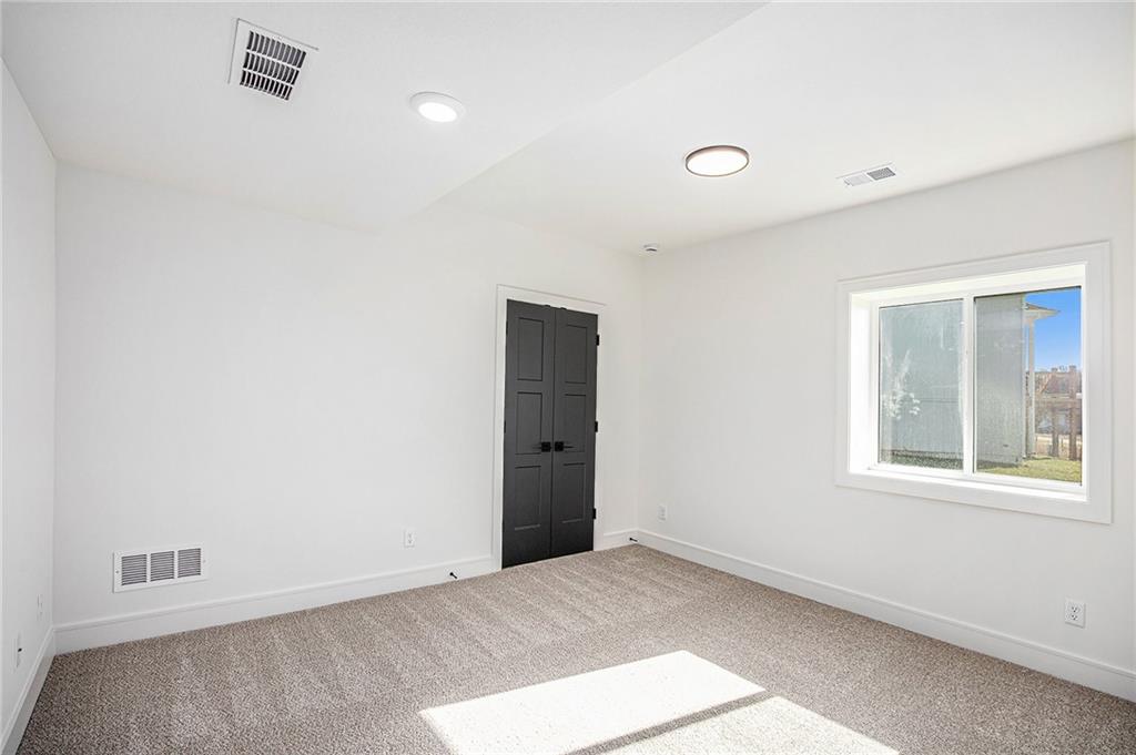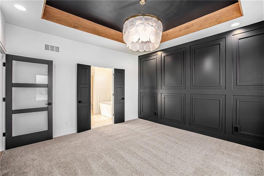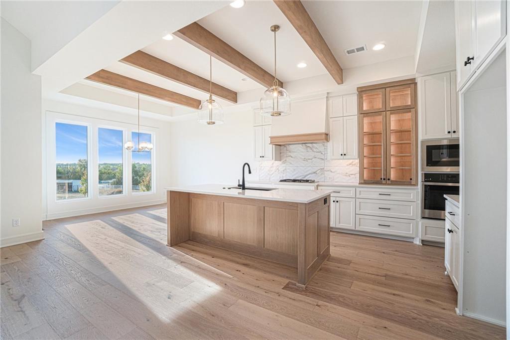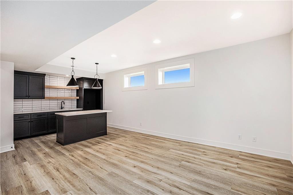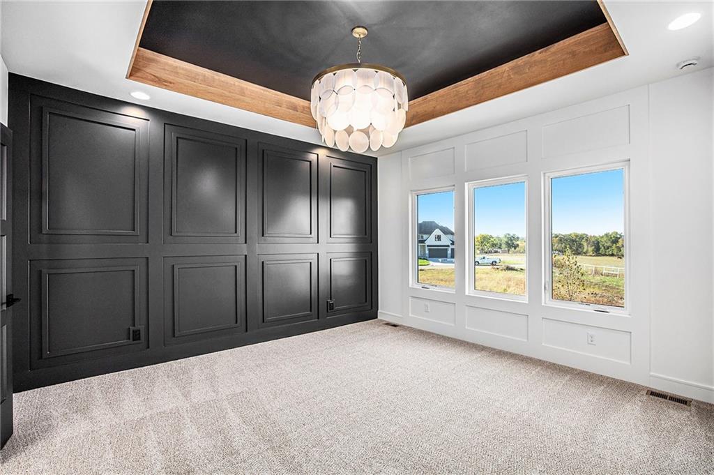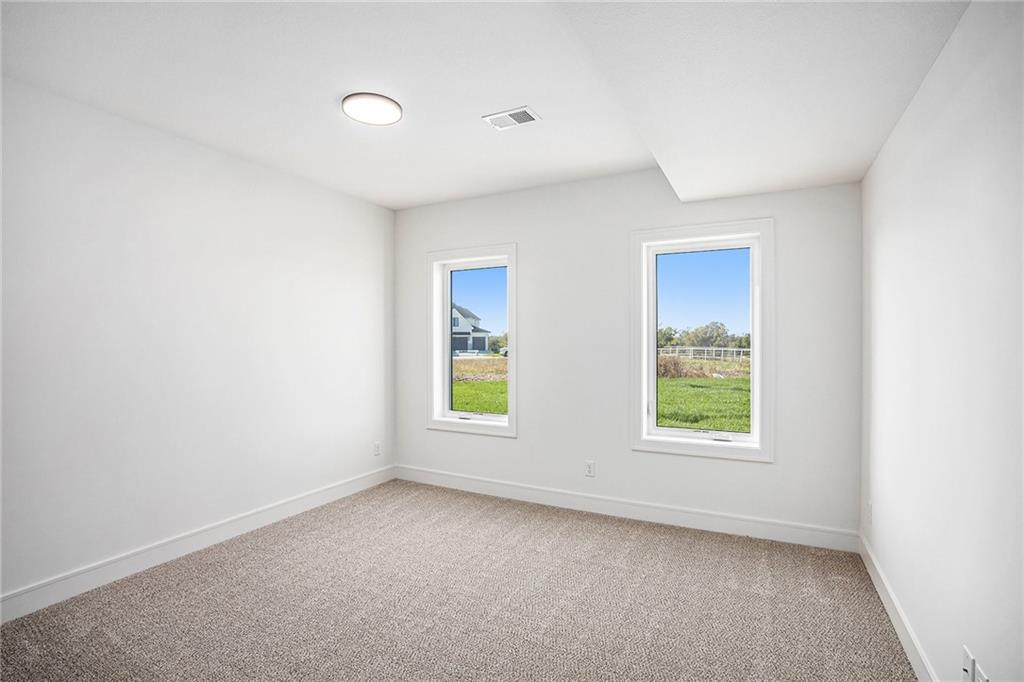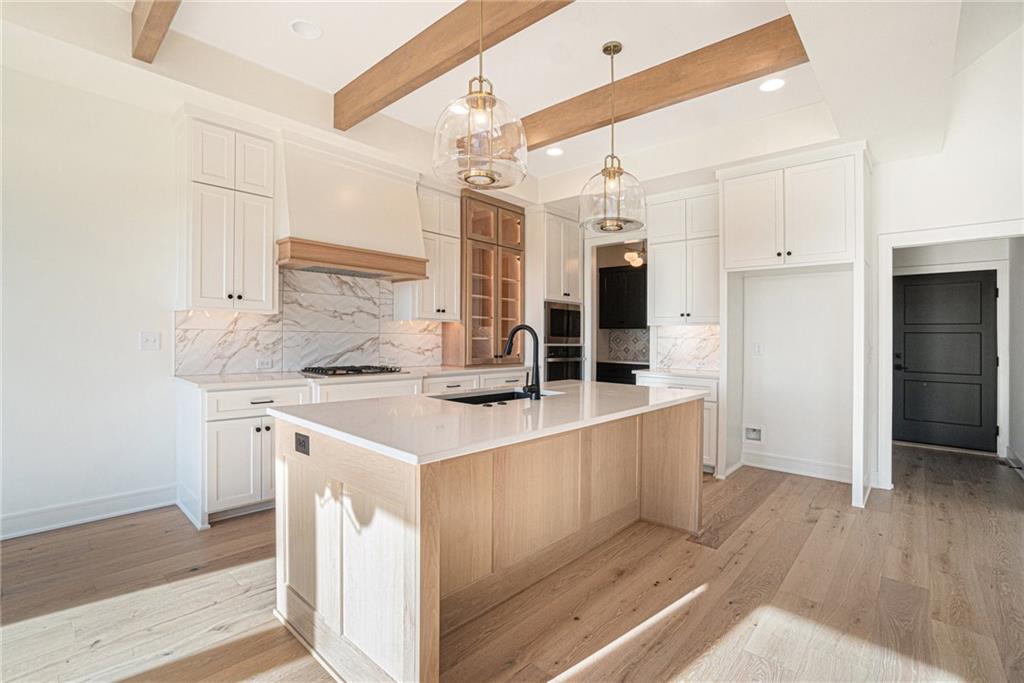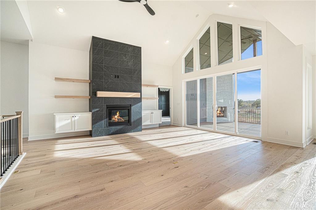 MOVE IN READY -"The Bayberry I" by JFE Construction, situated on Lot 90, is a Reverse 1 ½ Story residence featuring four bedrooms and three bathrooms. Upon entry through the impressive 8-foot double doors, residents are greeted by a spacious great room showcasing a vaulted ceiling, floor-to-ceiling fireplace, and expansive windows that create an open atmosphere. Large sliding doors seamlessly connect the great room to a covered deck equipped with a stone fireplace, offering an ideal space for entertaining. The kitchen is thoughtfully designed with a substantial island finished in quartz, stainless steel appliances, and a generous pantry that includes a built-in coffee bar. The primary ensuite features a free-standing soaker tub, double vanity, zero-entry shower, and a walk-in closet. A secondary bedroom or office is located on the main level. The finished lower level provides a family room, wet bar with island, two additional bedrooms, and a full bathroom. Enjoy access to the covered deck from the walkout lower level. Minutes from Blue Valley K-12 schools. Taxes are estimated. THIS HOME IS MOVE IN READY.