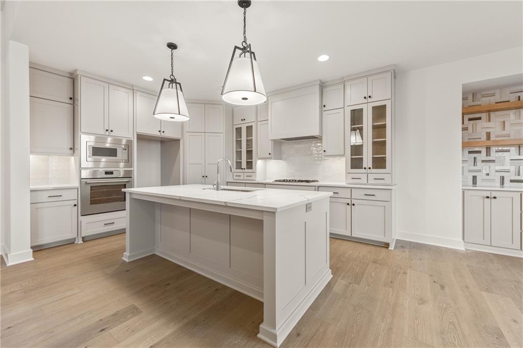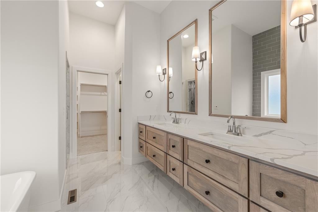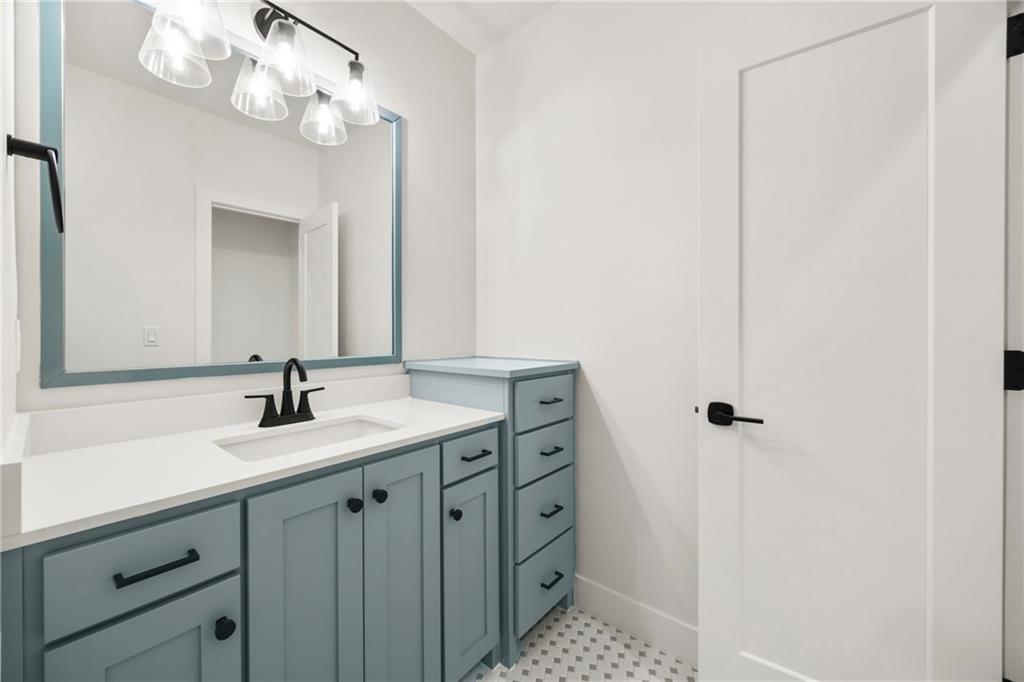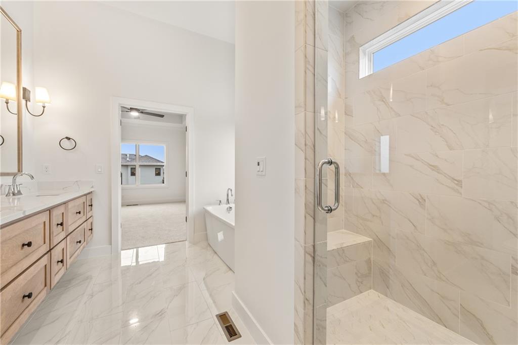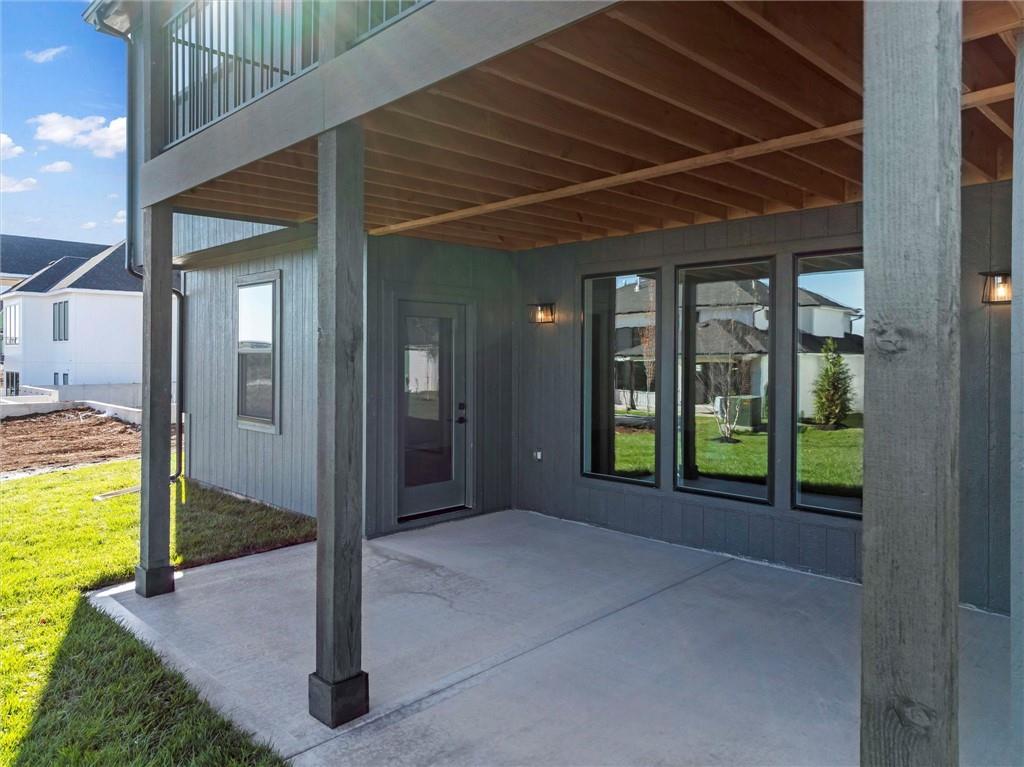 MOVE IN READY! The modern Riviera REVERSE by SAB Homes located on lot 184 in a cul-de-sac with a full finished walkout basement. You will love this new modern twist to a classic reverse floorplan at just over 3000 square-foot. with spectacular curb appeal featuring high peaks, vertical accent siding, metal accent roof, blackened bronzed windows, and super dark charcoal paint with red brick trim. Stunning! This home also features an ideal plan floor plan with a main floor primary suite and an office/ second bedroom with access to the covered 16' x 12' deck from the dining room and bedroom. Enjoy the finished walkout lower level with two more bedrooms, large family room with LVT flooring, parallel wet bar and a door to the backyard, plus plenty of room for storage. Perfect outdoor space under a 16' x 12' covered patio with full sod front and back, sprinkler system and front landscaping package included. This home is loaded with upgrades; gas cooktop, quartz countertops, decorative bath mirrors, Maxx Lounge freestanding tub, bump out in the dining area for hutch or china cabinet, boot bench at garage entry, large windows, floor to ceiling tile fireplace with accent ceiling trim in great room, vertical shiplap accent wall in the office with 3 ceiling beams, wainscoting at entry and stairwell and light wood flooring. Century Farms has a spectacular club house with a farmhouse twist ideal for neighborhood gatherings or private parties with reading loft and a fitness center. There are plenty of neighborhood activities with a fire-pit, two pickle-ball courts and a basketball hoop, kids play area, wildflower walkways and a community garden. Century Farms is conveniently located near the brand new Bluhawk shopping center, Heritage Park, the Johnson County Trail system and the Overland Park Arboretum. Come join the fun in Century Farms, a unique one of a kind upscale new home community in Overland Park. BLUE VALLEY SCHOOLS