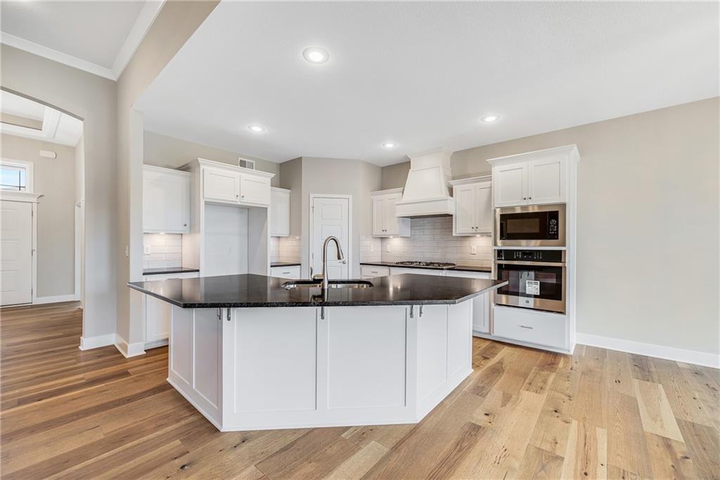 The Alpine by Hoffmann Custom Homes is a Reverse 1.5-story with an open, modern layout. The main floor features stylish, mid-toned hardwood engineered floors, a kitchen with black granite countertops, stainless appliances, gas cooktop, built-in oven, and under-cabinet lighting. A warm, neutral stone fireplace with creamy white enameled wood trim accents anchors the great room, which opens to a covered deck for outdoor living. The primary suite includes a spacious walk-in closet and a private ensuite bath, finished with a beautifully coordinated tile. The lower level offers two bedrooms, a full bath, a large rec room with a granite wet bar, and walkout access to an oversized covered patio, green space, and two storage rooms. Crafted with durable 2x6 exterior wall construction, pre-wired for easy solar panel installation, a 10-year structural warranty, EV charging receptacle, and thoughtful energy-efficient upgrades for long-term confidence. The home is fully complete; photos represent the property as built.