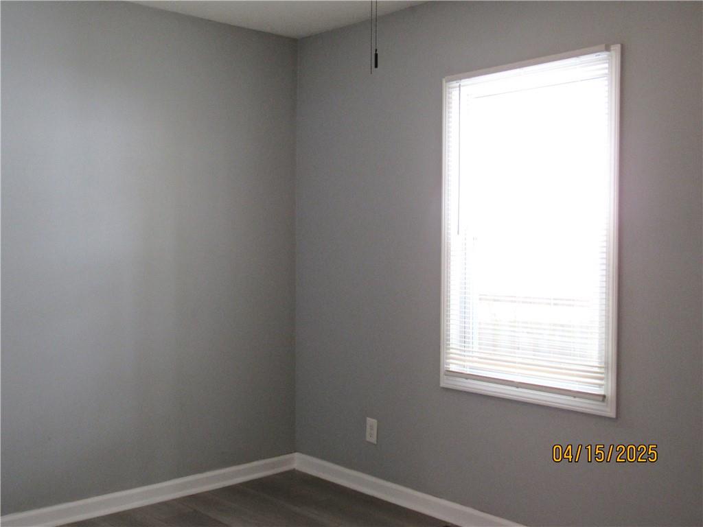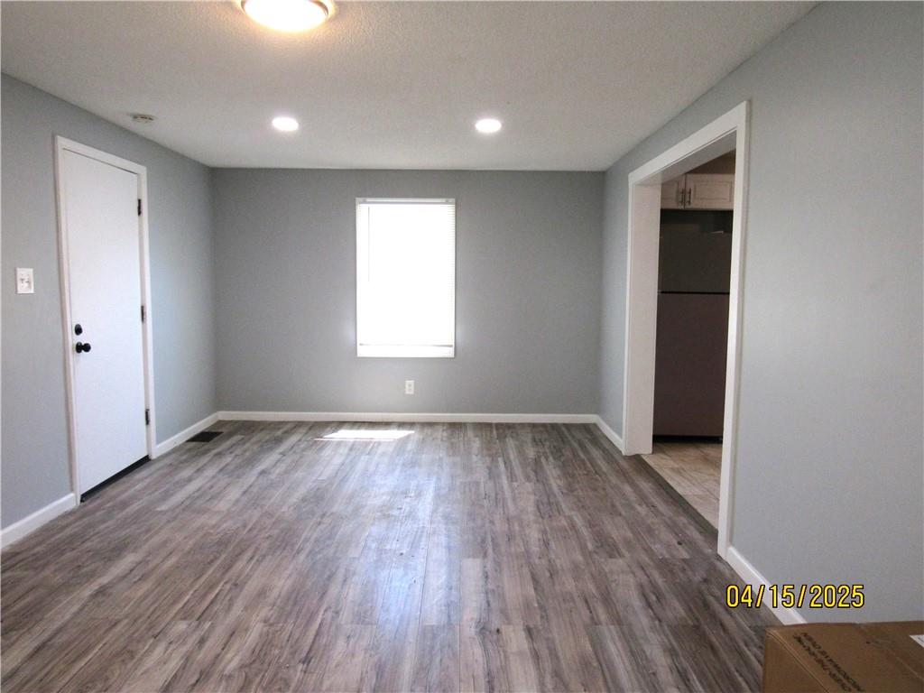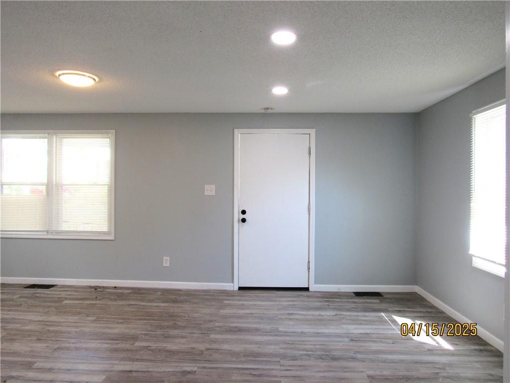Empty room with plenty of natural light, baseboards, wood finished floors, and recessed lighting