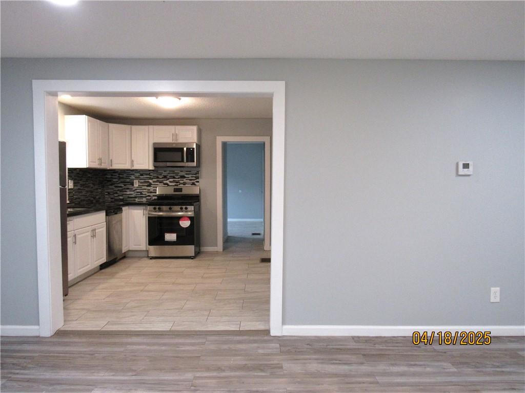 Kitchen with dark countertops, decorative backsplash, white cabinets, baseboards, and appliances with stainless steel finishes