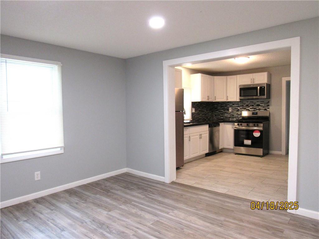 Kitchen with stainless steel appliances, dark countertops, light wood-type flooring, decorative backsplash, and white cabinetry