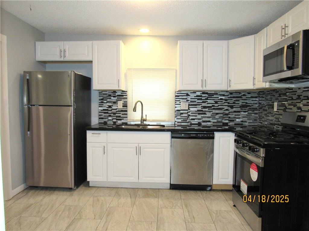 Kitchen featuring tasteful backsplash, appliances with stainless steel finishes, white cabinetry, and a sink