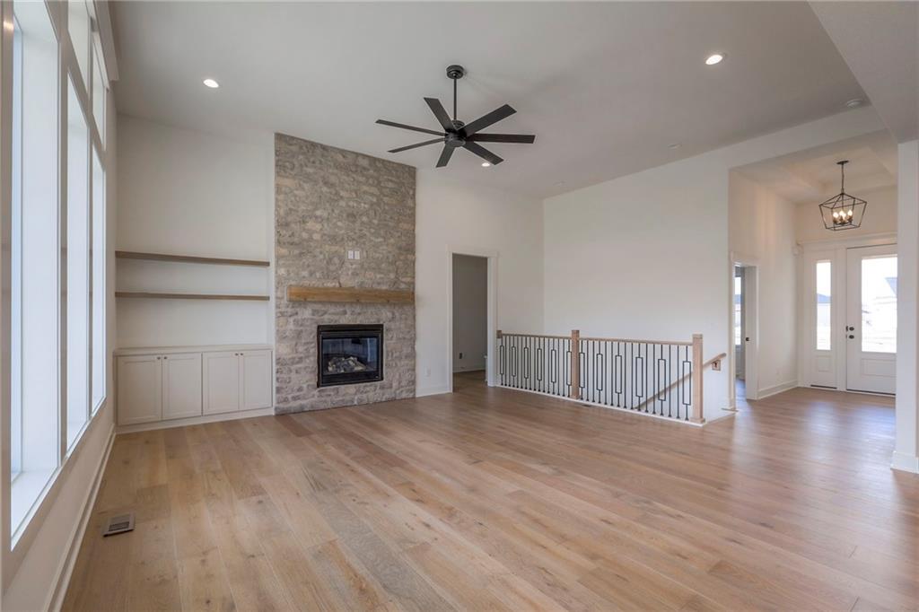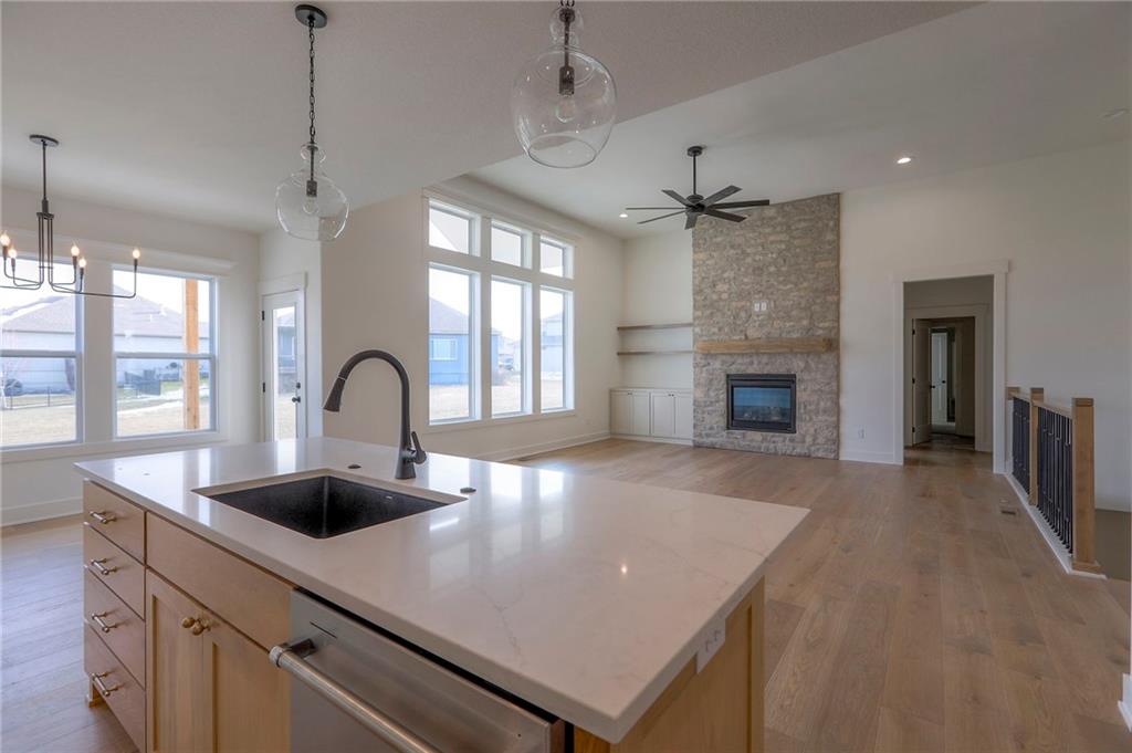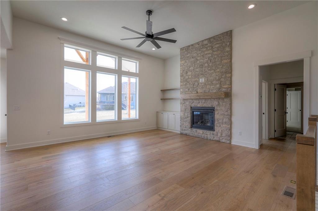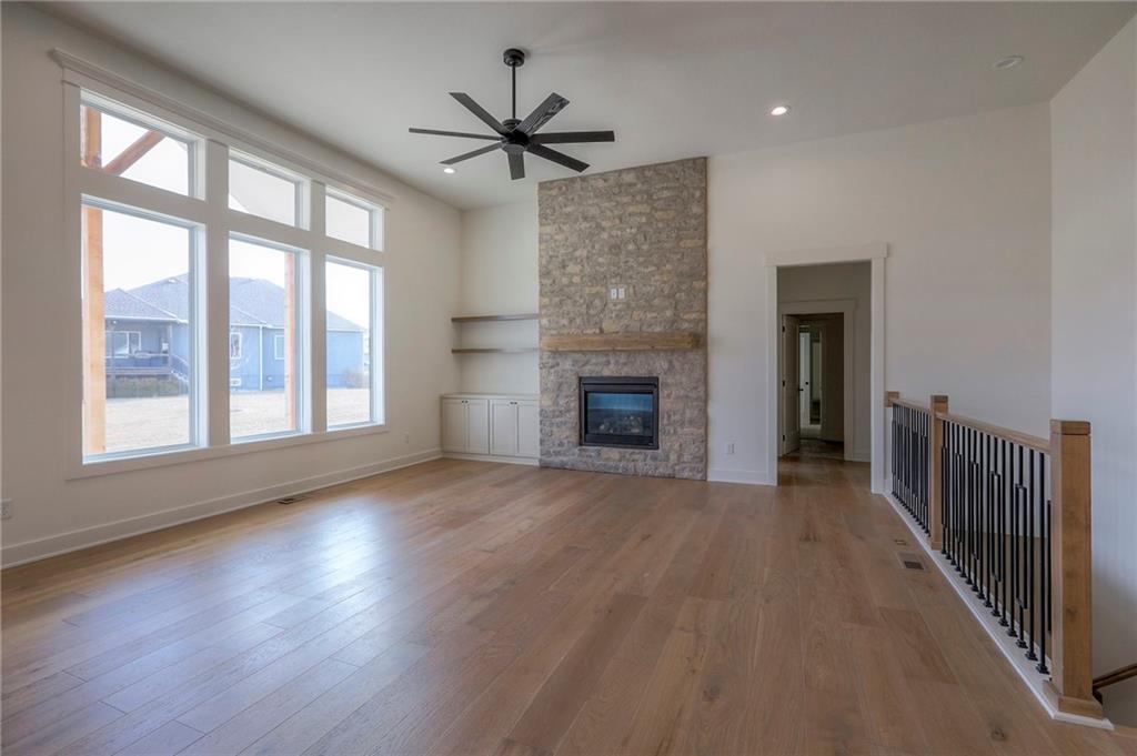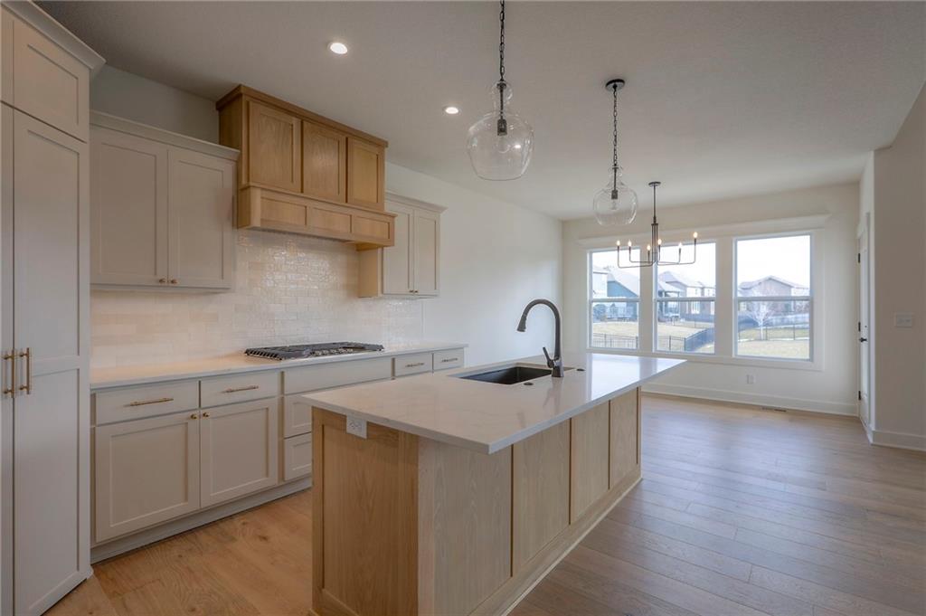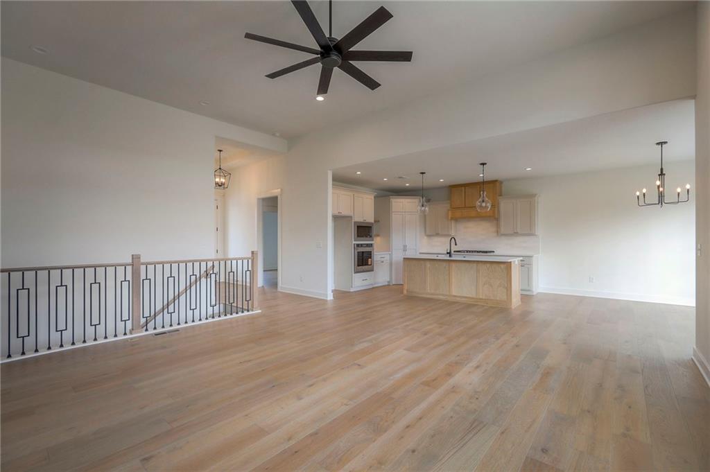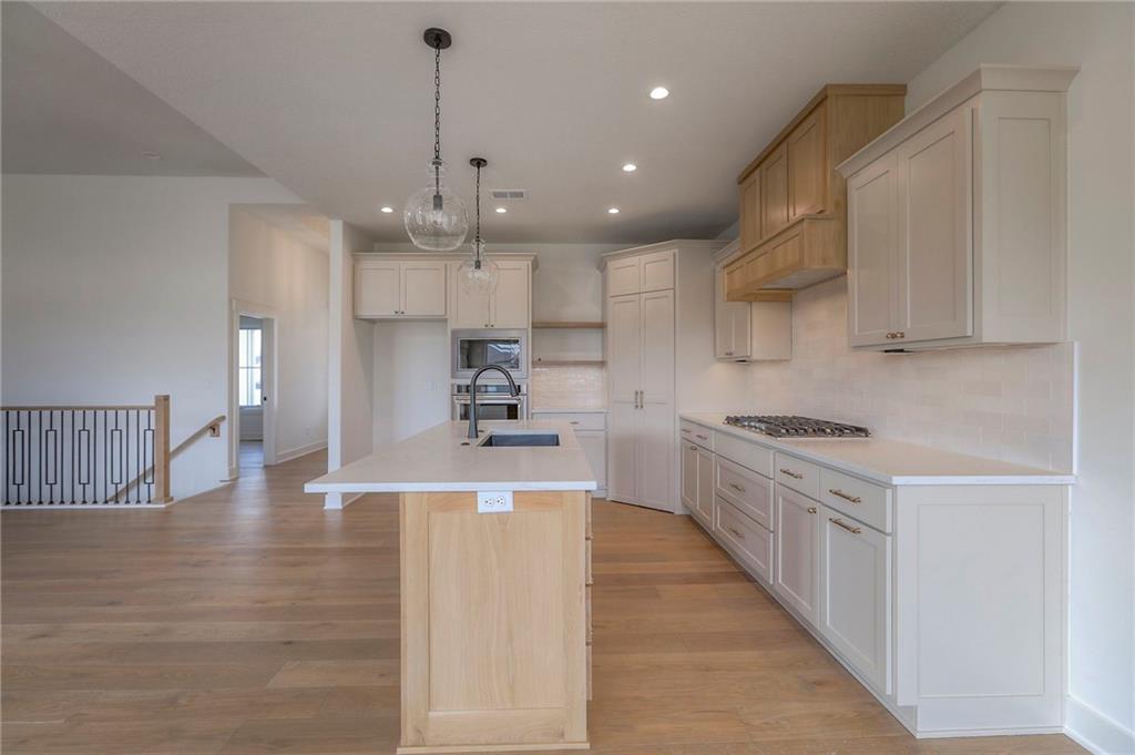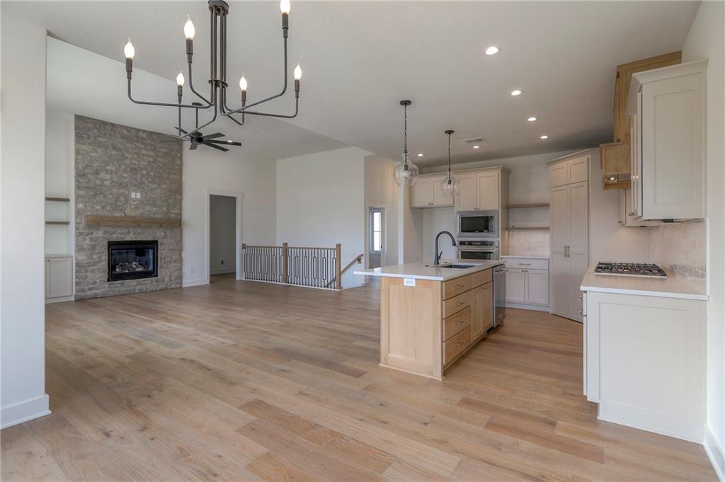 MOVE IN READY! New 5 Bedroom ranch w/ 3 bathrooms up and 2 bedrooms down. Hardwood floors throughout the main level. Open kitchen/family room with 12' ceiling. Master bath features split sinks with soaker tub & shower with rainfall head. Large master closet with easy access to laundry. Kitchen features custom cabinets, quartz tops, 6 burner gas cooktop, Kitchen Aid appliances and walk in pantry. All tile wet areas. Large culdesac site, covered patio, sprinklers.