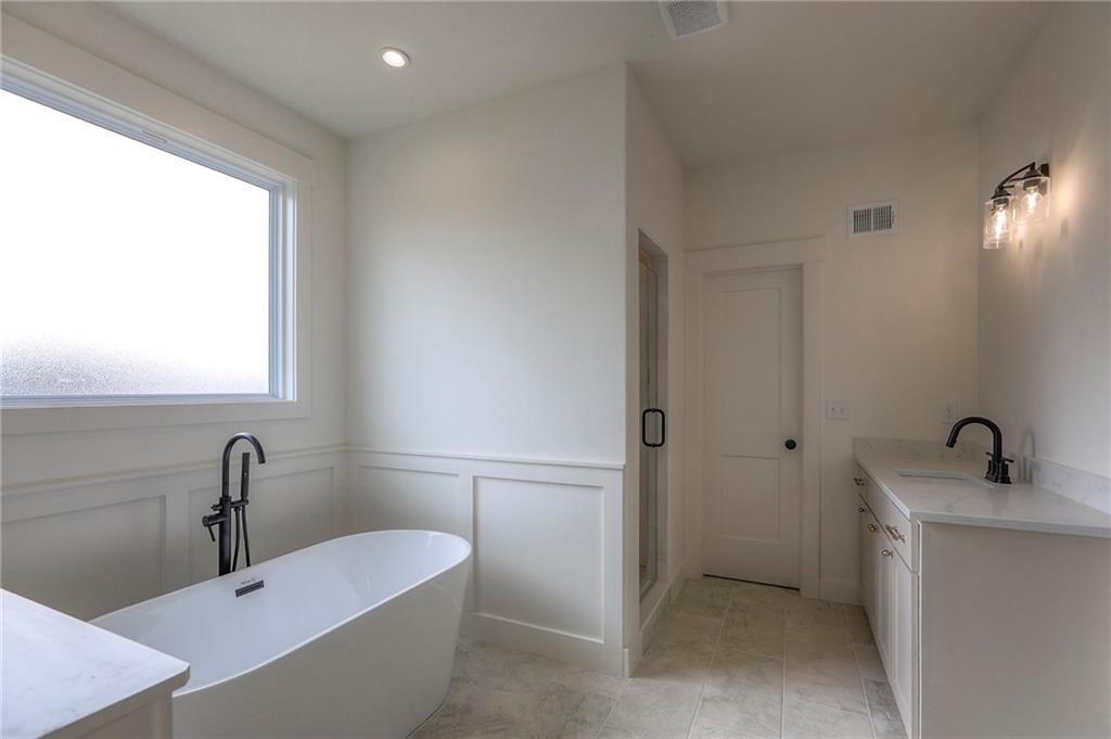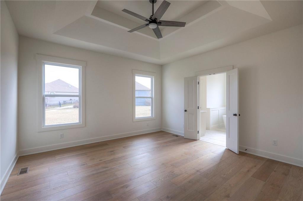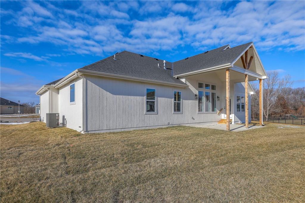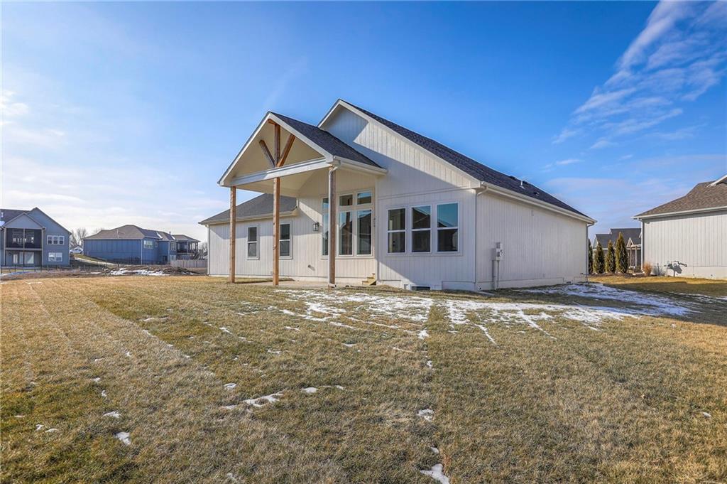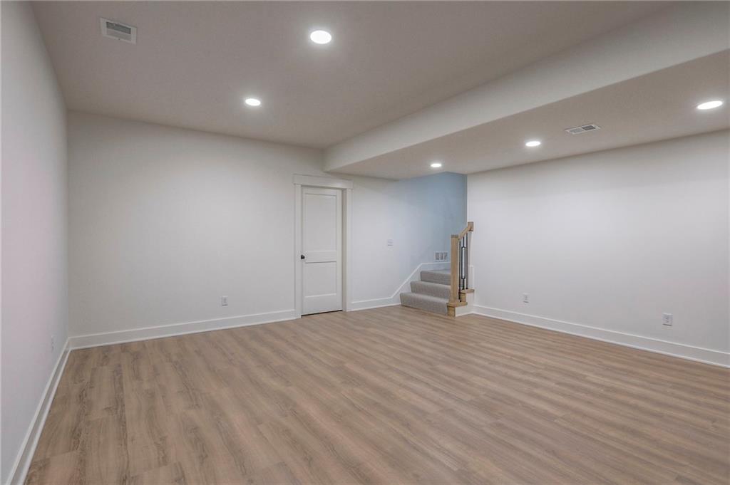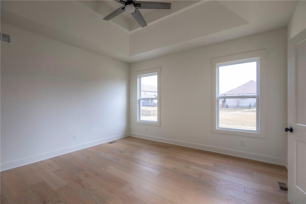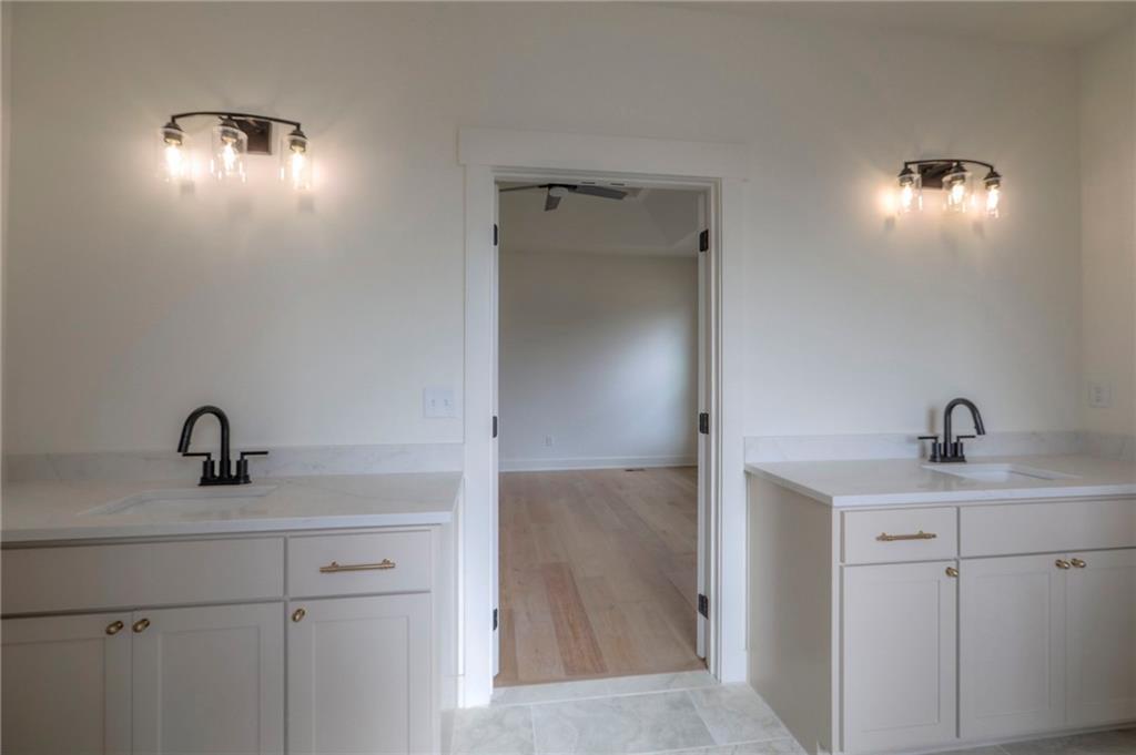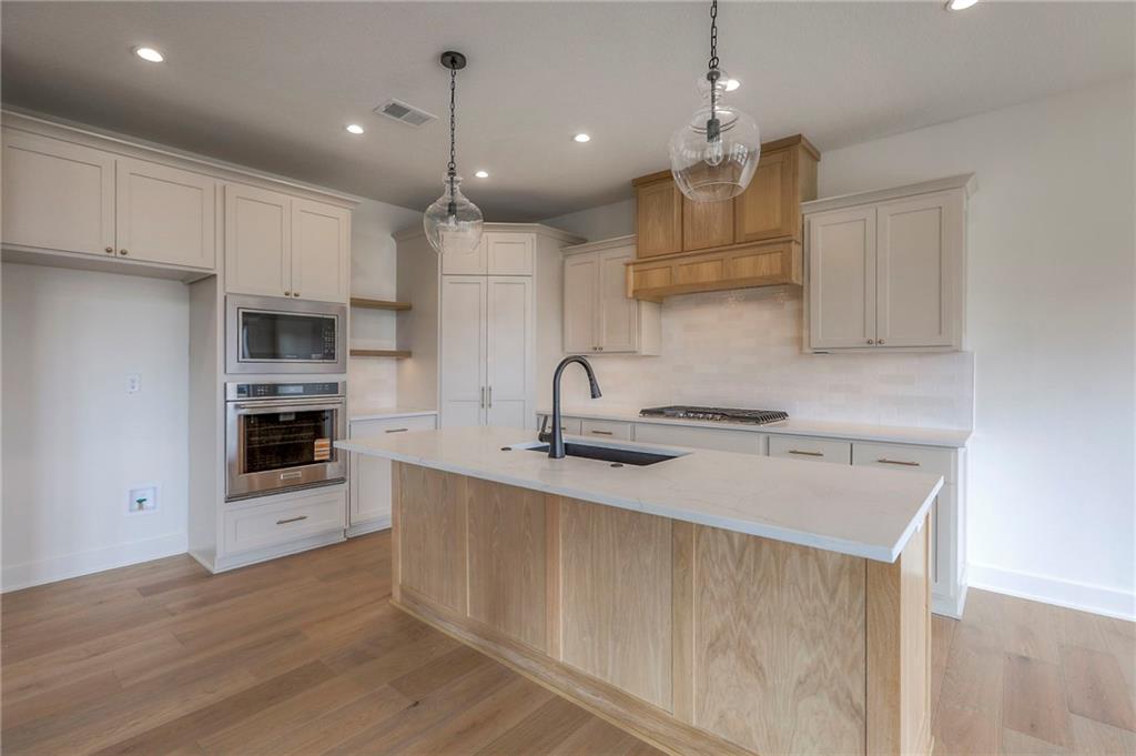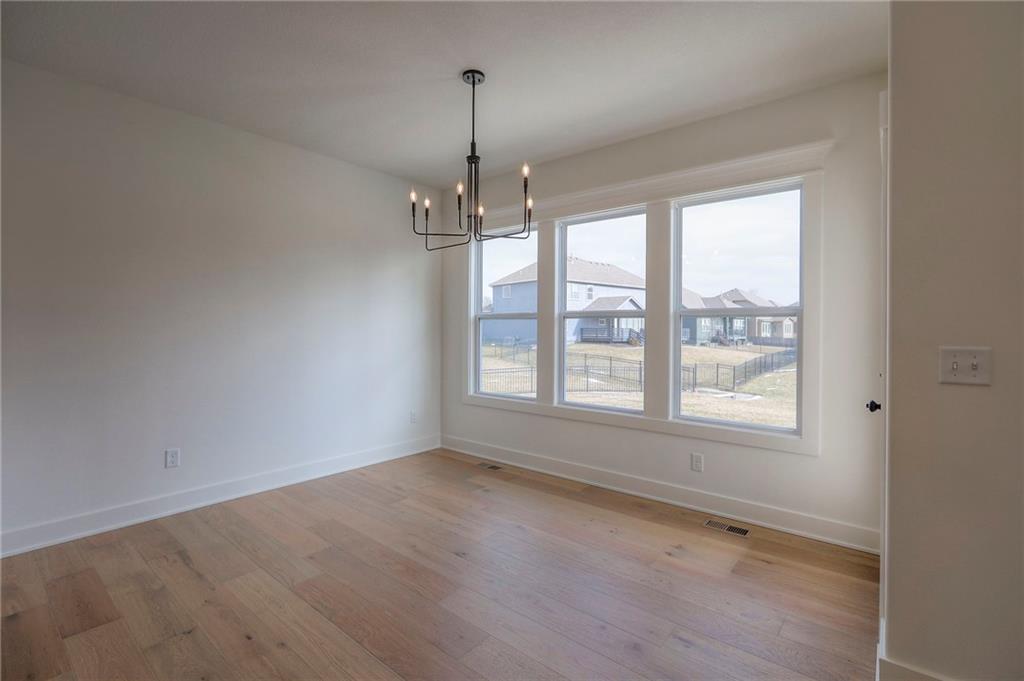 MOVE IN READY! New 5 Bedroom ranch w/ 3 bathrooms up and 2 bedrooms down. Hardwood floors throughout the main level. Open kitchen/family room with 12' ceiling. Master bath features split sinks with soaker tub & shower with rainfall head. Large master closet with easy access to laundry. Kitchen features custom cabinets, quartz tops, 6 burner gas cooktop, Kitchen Aid appliances and walk in pantry. All tile wet areas. Large culdesac site, covered patio, sprinklers.