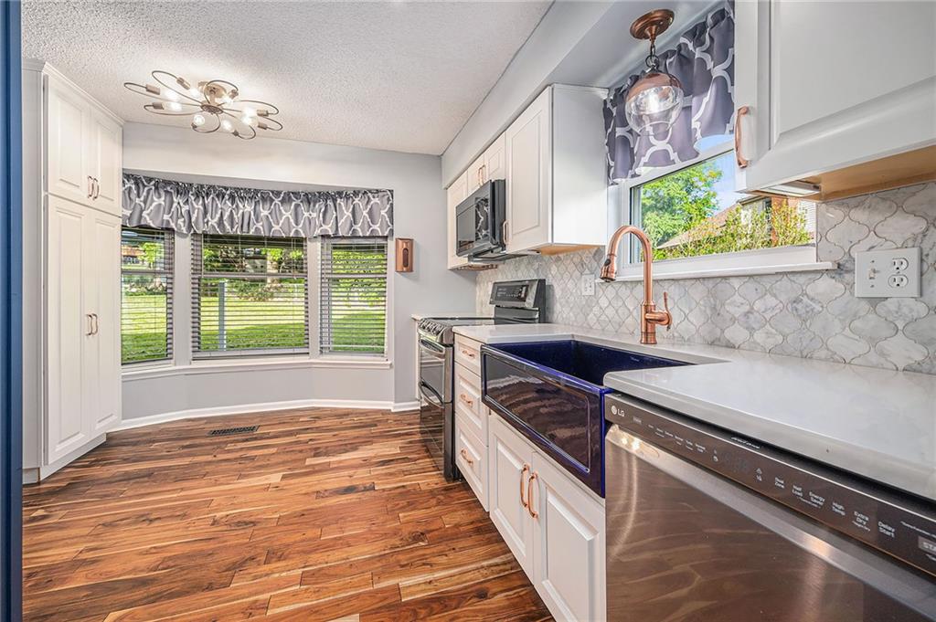 This beautifully updated 4-bedroom, 2-bath home offers a perfect blend of modern touches and everyday functionality. Located on a fenced-in corner lot in a quiet, well-established Kansas City neighborhood, you'll enjoy the best of both worlds: peaceful suburban living with convenient access to local amenities, shops, and schools. Inside, you'll find a spacious layout with multiple living areas and a partially finished basement complete with a wet bar, ideal for entertaining or relaxing. The kitchen has been upgraded with custom cabinetry and hardwood flooring, while the standout master en-suite features dual vanities, a large onyx shower, heated tile floors, and generous space for comfort and privacy. Additional highlights include: A high-efficiency HVAC system, Dual-pane vinyl windows, Architectural shingle roof, and Durable vinyl siding. With room to stretch out and stylish upgrades throughout, this home is truly move-in ready.