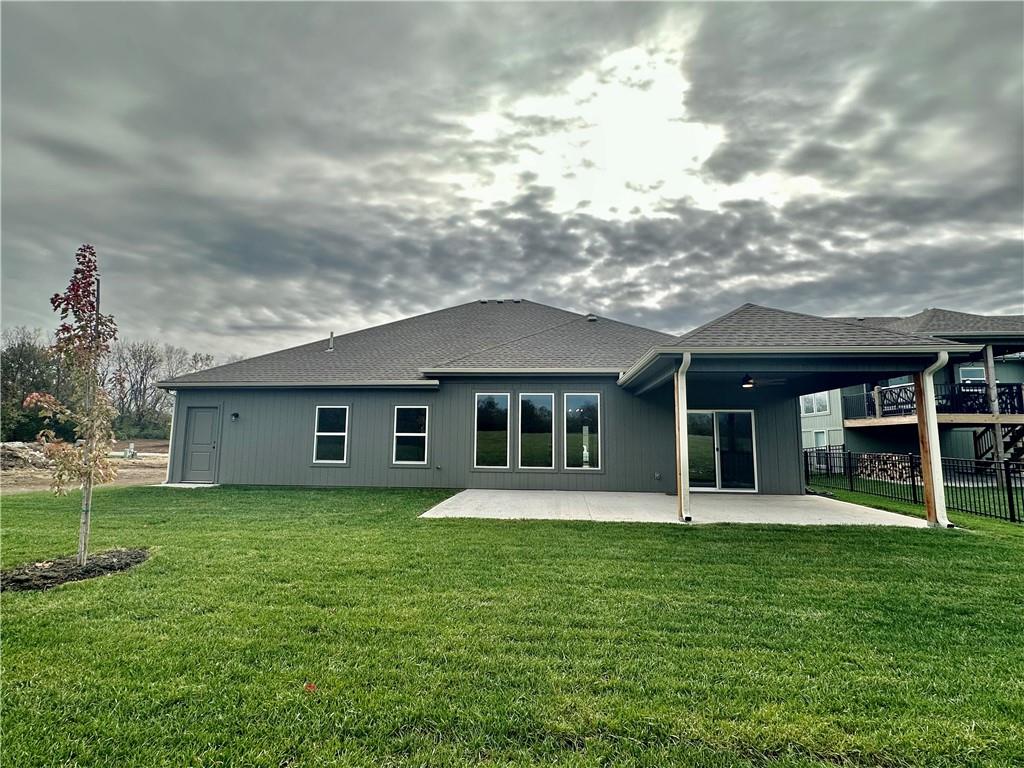 Stunning new construction 3 bedroom, 2 bath, true ranch home in Peculiar, MO. Open concept floor plan! Granite counters throughout, a large kitchen island, SS appliances, custom cabinets, luxury vinyl plank in the kitchen, great room, & dining area & high ceilings are just a few of the stand out features in this home. A large covered patio allows for nice evenings relaxing outside. The master suite includes custom mill work - a box vault ceiling feature, accent wall, tiled walk-in shower and a double vanity. This house is a SLAB ON GRADE - NO basement - 3rd car garage runs the length of house for additional storage space. Photos are from a previously sold model and may reflect some upgrades.