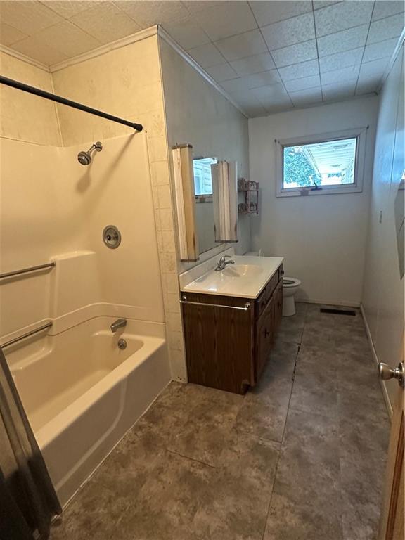 Bathroom with vanity, shower / washtub combination, and ornamental molding