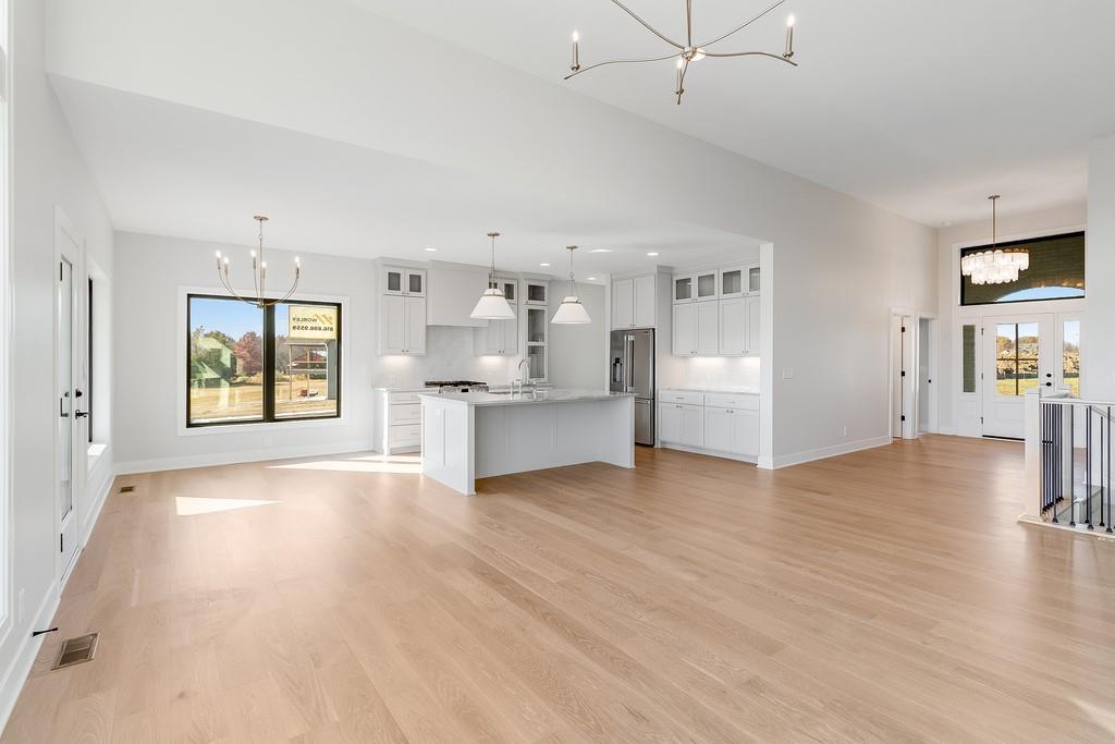 Discover the perfect blend of luxury, function, and craftsmanship in this stunning reverse 1.5-story home by Worley Construction, located on a spacious 1/2-acre lot in The Estates at Knoll Creek—a premier Raymore community with a walking trail and a neighborhood fishing pond. This thoughtfully designed home offers 4 bedrooms, 3 bathrooms, and 2,787 finished square feet filled with custom finishes and quality materials. The open-concept main level features hardwood floors, a spacious great room with a stone fireplace, and a gourmet kitchen with quartz countertops, custom cabinetry, a walk-in prep pantry, and a wood vent hood. The primary suite includes a spa-like bath with a walk-in tiled shower, dual vanities, and a generous walk-in closet that connects directly to the laundry room. The finished walkout lower level adds two more bedrooms, a full bath, a large rec room with a full wet bar, and a rare bonus: a basement garage bay—ideal for storing lawn equipment, tools, or creating the perfect workshop or hobby space. Enjoy outdoor living on the covered composite deck overlooking the treed green space. With upscale design, flexible living spaces, and a quiet, scenic neighborhood, this home offers the lifestyle today’s buyers are looking for.