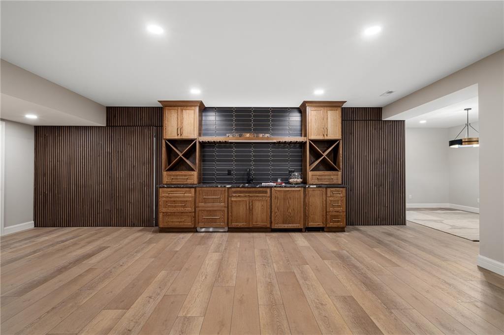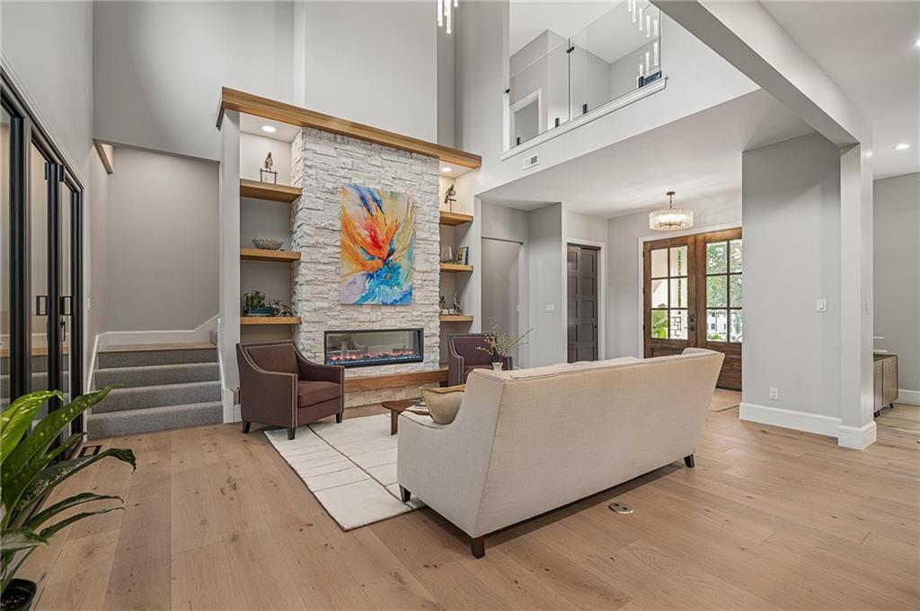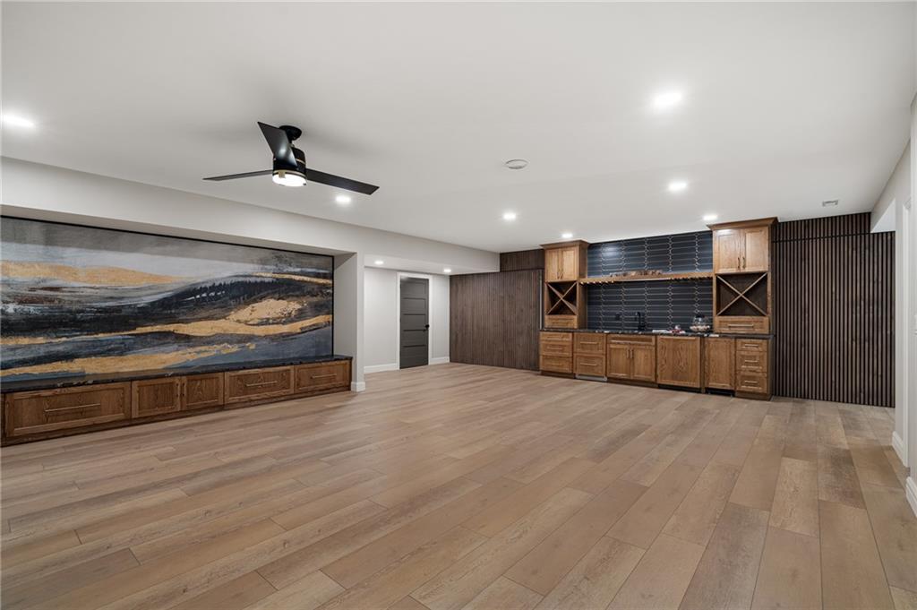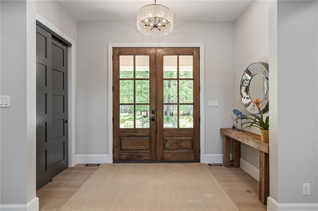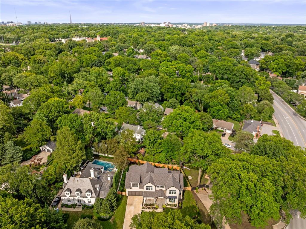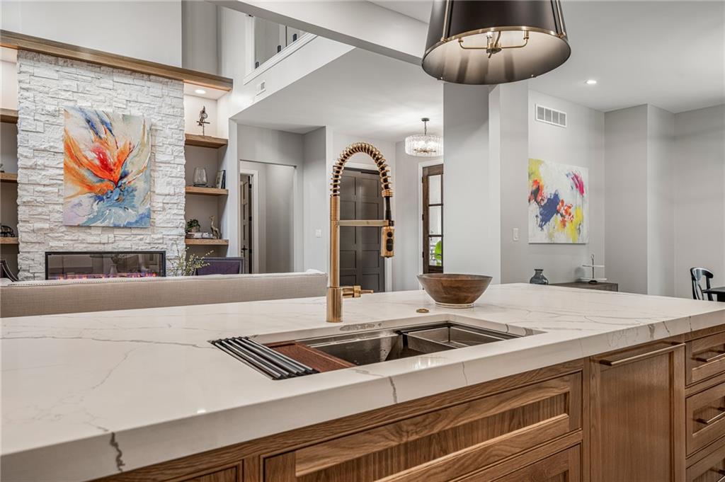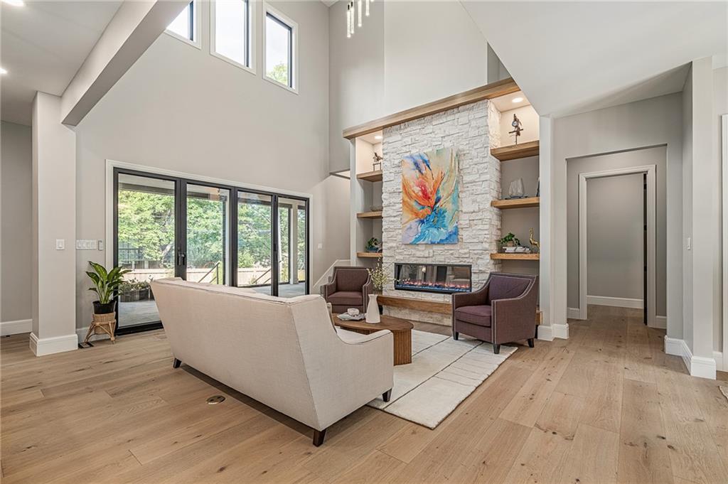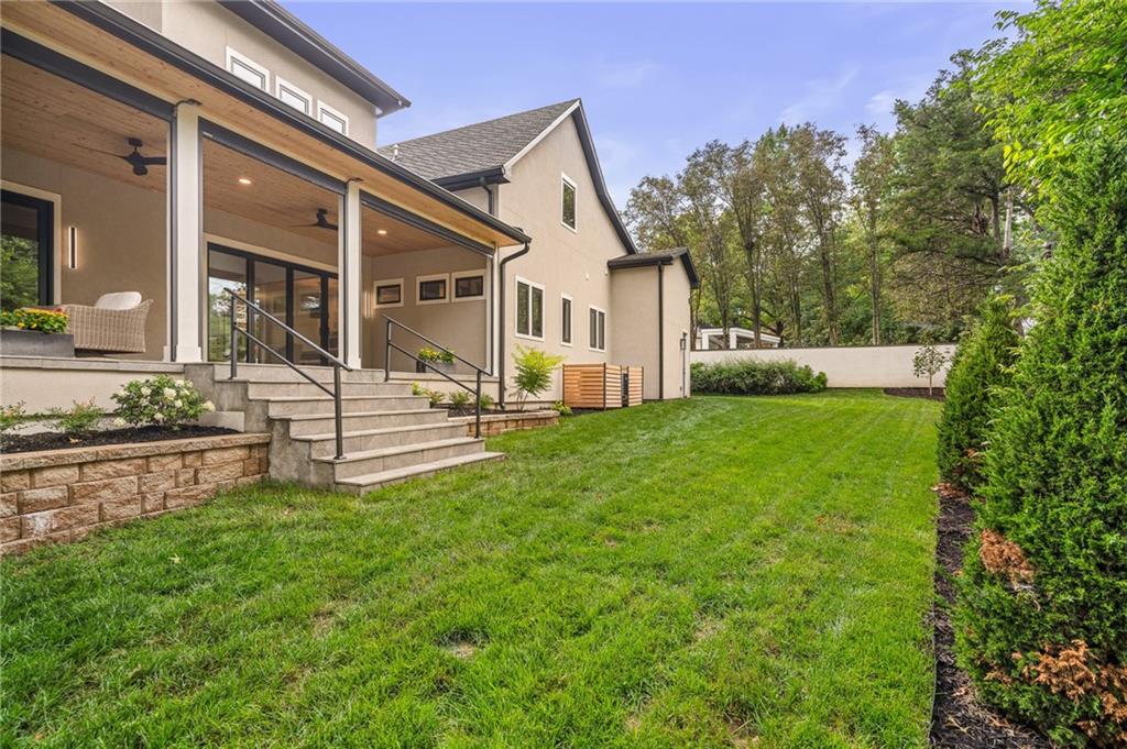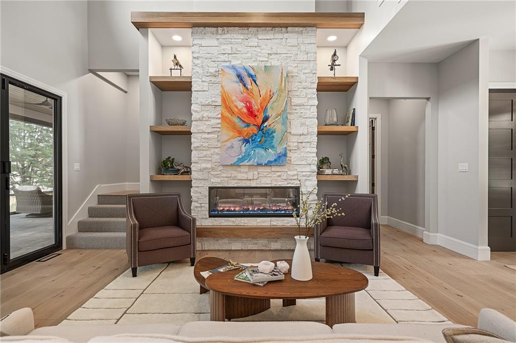 This 6-bed, 4 full plus 2 half bath, luxury home has exceptional quality and exclusive features. It seamlessly blends elegance, comfort, and intelligent design. From the stately front porch with self-watering planters, to the grand double door entrance, every detail reflects timeless sophistication. Inside, you will see the wide, open space with lofty ceilings, engineered white oak floors, and full glass, bifold, accordion doors that open to a covered lanai with a gas fireplace and twin waterfalls creating a seamless indoor-outdoor flow. Ceiling fans cool the warm days; lush landscaping is kept pristine by a full irrigation system. The magnificent Chefs kitchen has high quality, custom cabinetry, quartz counters, statement backsplash, hidden spice and utensil drawers, and a walk-in pantry with coffee bar and microwave. A stylish mudroom serves as a staging space for catered events. The kitchen flows into the dining area and vaulted living room, anchored by a dramatic stone, electric fireplace. A chic powder room adds guest comfort. The main level primary suite offers lanai access and a spa-like bath with jetted tub, walk-in shower, and dual quartz vanities—“hers” has custom storage for styling tools. Upstairs you are greeted by a spacious loft with a great view, three bedrooms, two baths, and a huge flex room that can be a home office, studio, or guest suite. You will fall in love with the whimsical and functional laundry room that gives a nod to Kansas City’s historic Nelly Don and the practicality of spacious storage, a convenient sink, and a huge island for laundry or crafts. The lower level is an entertainer’s dream! It is certainly a high-end mancave, wired for multiple TVs-no game left behind-plus wet bar, and two more bedrooms! It has a secret bonus room as well that can be a home theatre, golf simulator, or home gym. Thoughtfully designed and beautifully executed, this once-in-a-lifetime home delivers the ultimate in comfort, luxury, and lifestyle