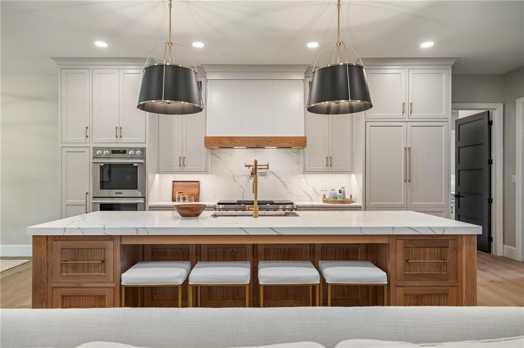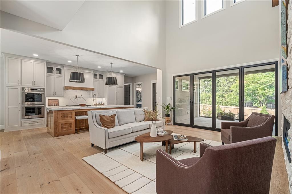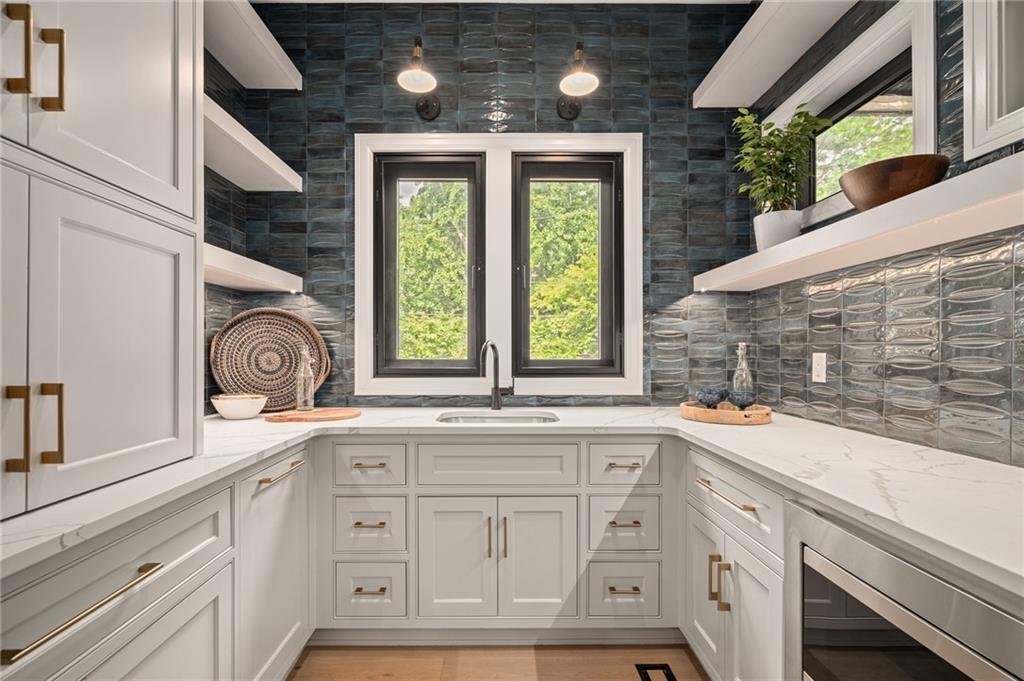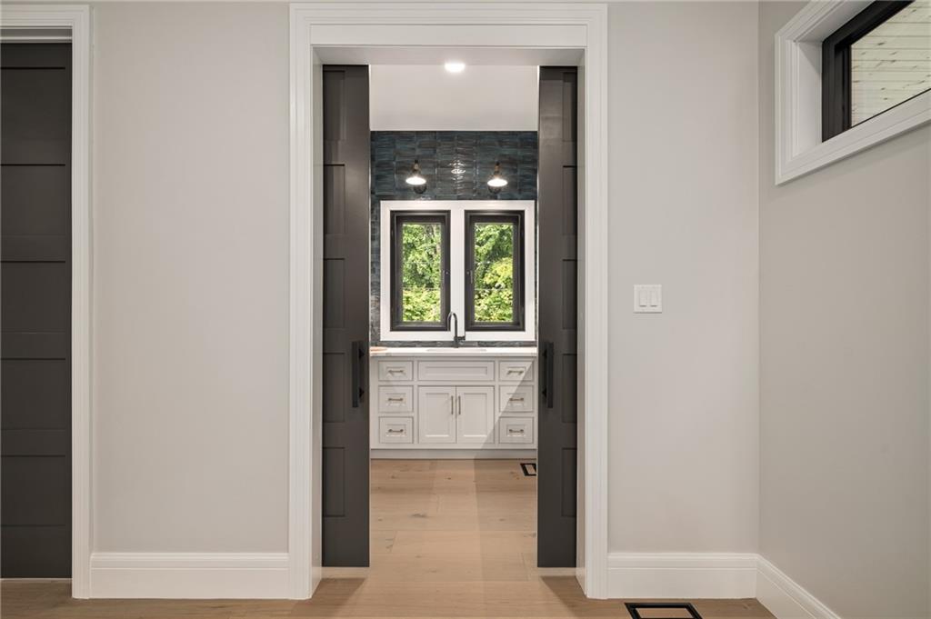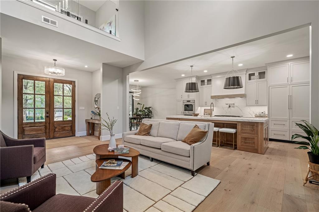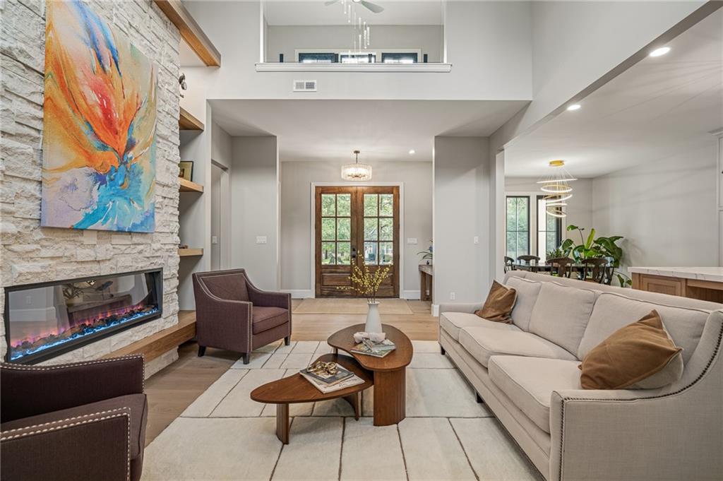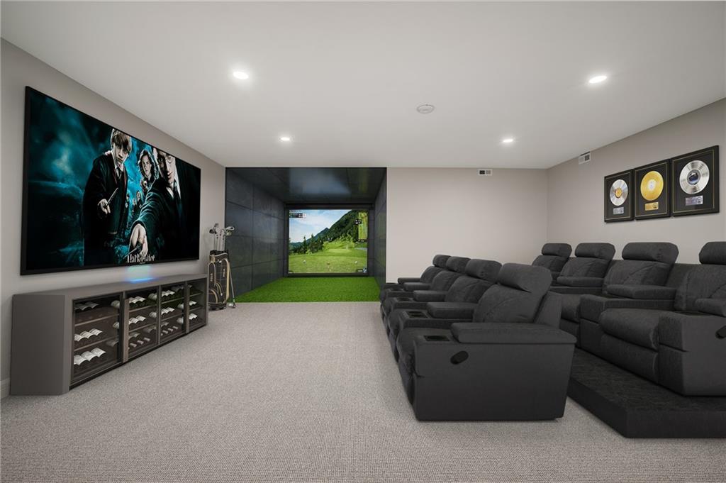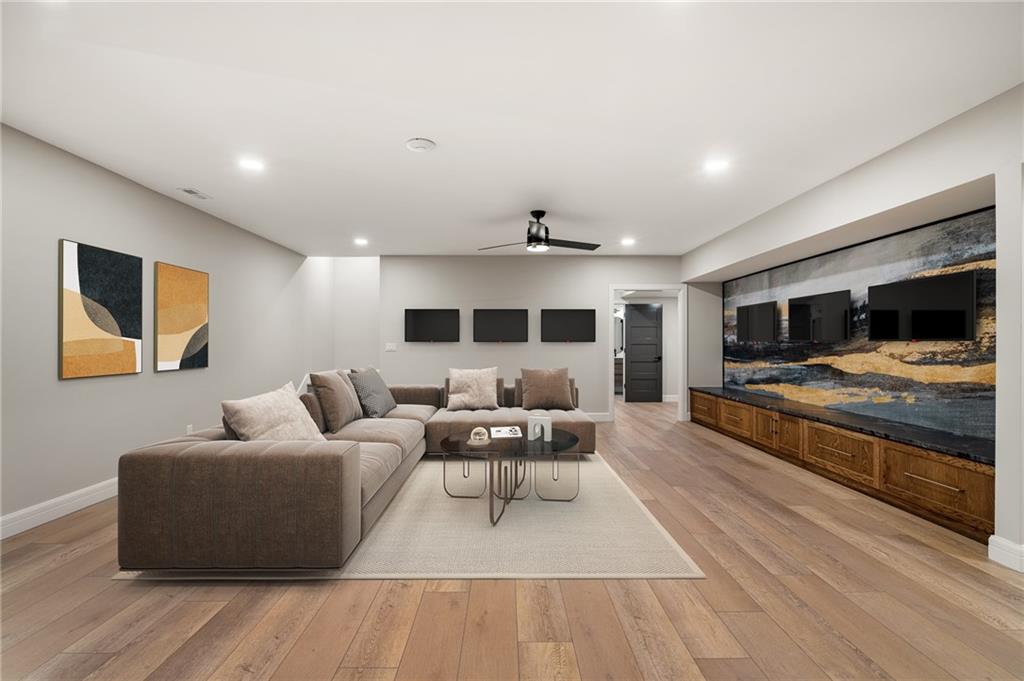 This 6-bed, 4 full plus 2 half bath, luxury home has exceptional quality and exclusive features. It seamlessly blends elegance, comfort, and intelligent design. From the stately front porch with self-watering planters, to the grand double door entrance, every detail reflects timeless sophistication. Inside, you will see the wide, open space with lofty ceilings, engineered white oak floors, and full glass, bifold, accordion doors that open to a covered lanai with a gas fireplace and twin waterfalls creating a seamless indoor-outdoor flow. Ceiling fans cool the warm days; lush landscaping is kept pristine by a full irrigation system. The magnificent Chefs kitchen has high quality, custom cabinetry, quartz counters, statement backsplash, hidden spice and utensil drawers, and a walk-in pantry with coffee bar and microwave. A stylish mudroom serves as a staging space for catered events. The kitchen flows into the dining area and vaulted living room, anchored by a dramatic stone, electric fireplace. A chic powder room adds guest comfort. The main level primary suite offers lanai access and a spa-like bath with jetted tub, walk-in shower, and dual quartz vanities—“hers” has custom storage for styling tools. Upstairs you are greeted by a spacious loft with a great view, three bedrooms, two baths, and a huge flex room that can be a home office, studio, or guest suite. You will fall in love with the whimsical and functional laundry room that gives a nod to Kansas City’s historic Nelly Don and the practicality of spacious storage, a convenient sink, and a huge island for laundry or crafts. The lower level is an entertainer’s dream! It is certainly a high-end mancave, wired for multiple TVs-no game left behind-plus wet bar, and two more bedrooms! It has a secret bonus room as well that can be a home theatre, golf simulator, or home gym. Thoughtfully designed and beautifully executed, this once-in-a-lifetime home delivers the ultimate in comfort, luxury, and lifestyle