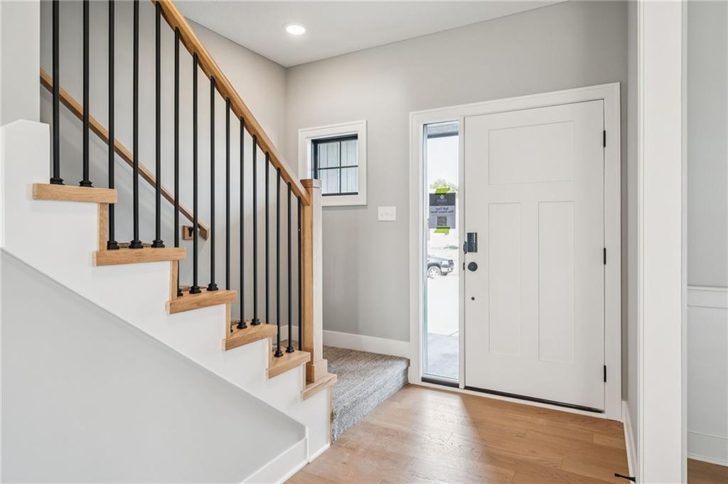 MOVE-IN READY! The Lincoln by Hearthside Homes – Lot 54, Homestead Hills Thoughtfully designed for modern living, The Lincoln combines flexibility, craftsmanship, and style. The main level features beautiful hardwood floors throughout and a versatile flex room—perfect for a home office, playroom, or quiet retreat. The spacious kitchen is the heart of the home, showcasing a large island, quartz countertops, custom cabinetry, and black windows that add a touch of modern elegance. An open layout connects seamlessly to the great room, creating the perfect setting for gatherings and everyday living. Upstairs, the primary suite delivers a true retreat. The spa-inspired bath includes a freestanding soaking tub, tiled shower with heavy-duty glass surround, dual vanities, and a huge walk-in closet that connects directly to the laundry room for added convenience. Three additional bedrooms and a full bath complete the upper level, providing space for family, guests, or hobbies. A nice-sized front porch and covered patio extend the living space outdoors, while the upgraded I-joist floor system ensures quiet, solid floors throughout the home. Every Hearthside home exceeds industry standards with a 12-month builder warranty, independent third-party inspections, a verified video sewer line scope, and professional HVAC duct cleaning—ensuring your new home is delivered in pristine, top-tier condition. Located in Homestead Hills within the Liberty School District, offering access to a pool,
