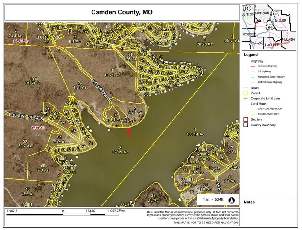 Stunning lakefront lot with amazing views! This beautiful property has been hidden behind the trees for years and is now cleaned up and ready for your dream lake house! Views of the main channel with the protection of Rainey Creek Cove location. 208' lakefront lot with plenty of room to build. Located at the 60 mile marker of the Osage arm. Dock is 22X40 with a 10X30 slip, 4X30 swim platform, and 32' ramp. 14' water depth at the end of the dock. The road frontage is 50' which will allow for a lot split if desired. County requires 25' road frontage per lot. Electrical pole is being put at the property. Buyer to provide meter. Truly amazing property!