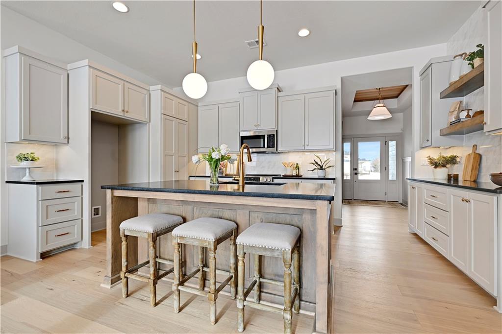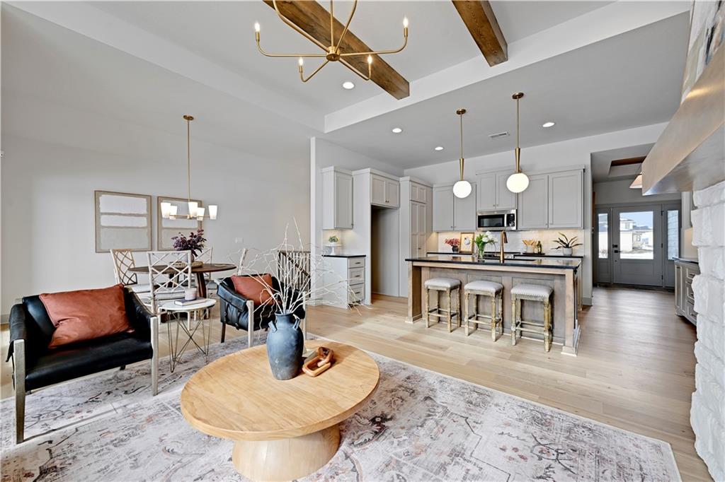 MODEL HOME NOT FOR SALE. The "Sonoma" Reverse by SAB Homes is here! This beautiful Villa has everything you need for your maintenance provided living. As you enter the foyer you are greeted with custom trim at ceiling and wainscotting. Stunning hardwoods that lead you into the Great Room with fireplace. The kitchen island faces the back windows with sink in island for convenience with all your entertaining. Pantry and great counterspace for all your needs. Dining room off the great room with access to covered patio. The Primary En-Suite is on the opposite side of the main level with windows to view back yard, bathroom with double vanity & shower - leads into the walk-in closet. Bedroom 2 and Bathroom 2 is off the entry. Mud hall and laundry is in the hallway behind the kitchen as you walk in from the garage. The lower level has bedroom #3 with walk-in closet with bathroom #3, Rec Room and wet bar next to the walkout-walkup feature that allow perfect access to back yard. Option for a 4th bedroom with optional walk-in closet. Excellent storage space as well. All in the coveted Heritage Ranch, A Lambie-Rieke Community, with Amenities Galore such as state-of-the-art pool, clubhouse, trails, pickleball. play area, half-court basketball, ponds and so much more coming soon! This community provides a wonderful lifestyle and right next to the 1,238 Acre Heritage Park with Dog Park, Sports Parks, Golf, Lake, Trails and so much more! Contact Onsite Agents for Estimated Completion of homes on site, and design selections. Sales Office OPEN 7 Days/Week, located at LOT 65. Renderings &/or images may show features and sq ft that are subject to change. Home is under construction. Welcome Home to Heritage Ranch - one of the last NEW Home Communities in Johnson County! LOT 79. Home is Under Construction with an Estimated Completion NOV 2025. Taxes and sizes are estimated.