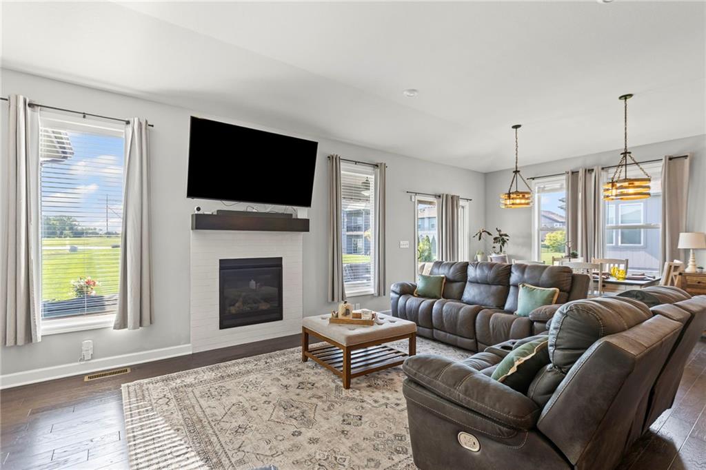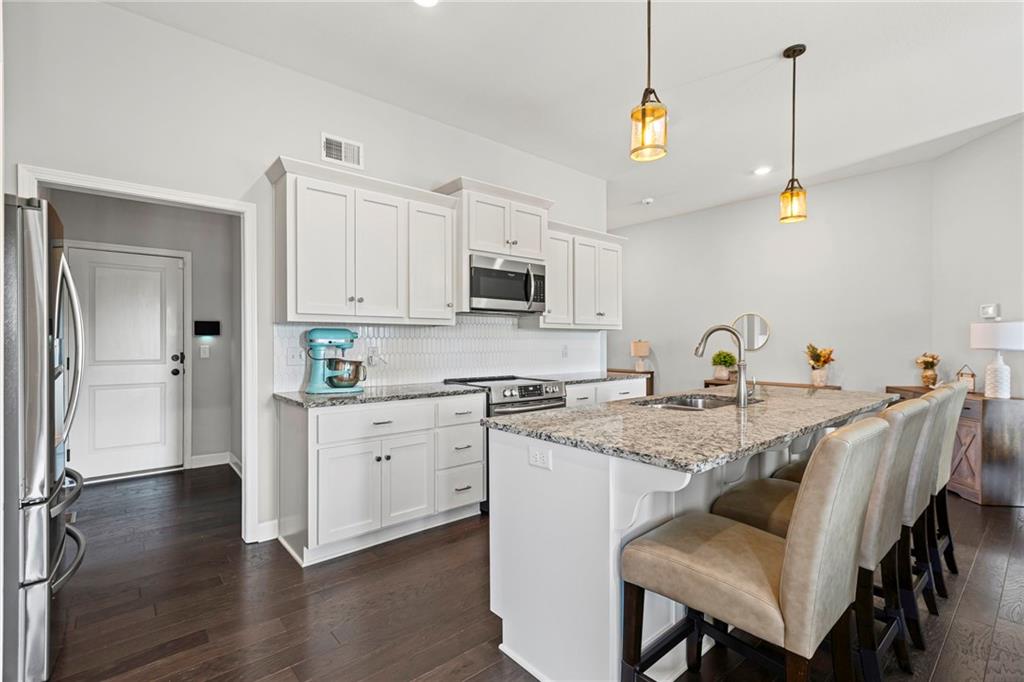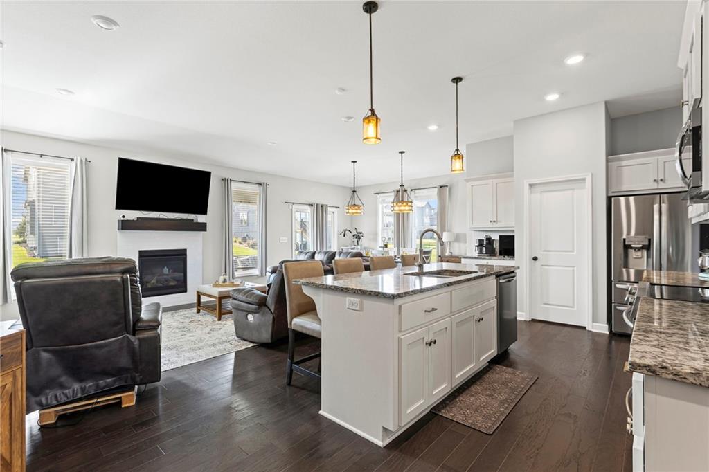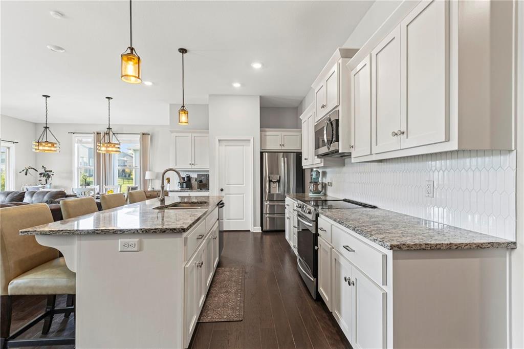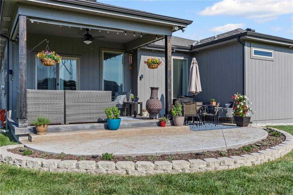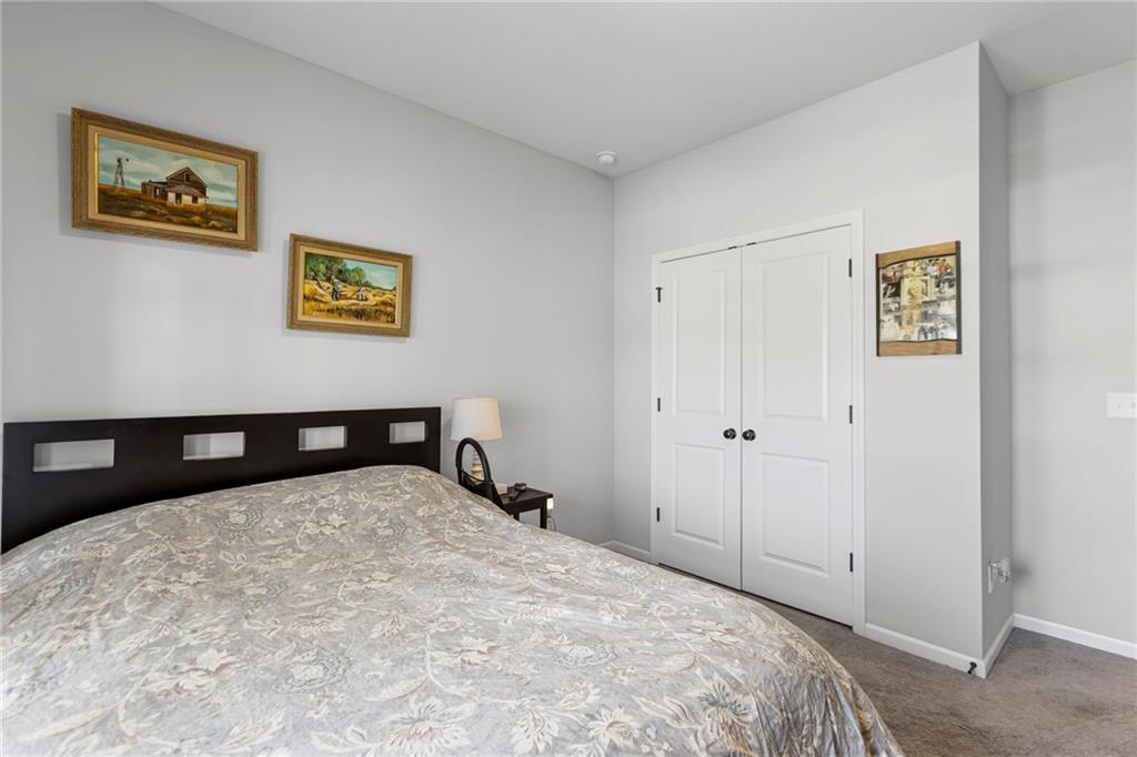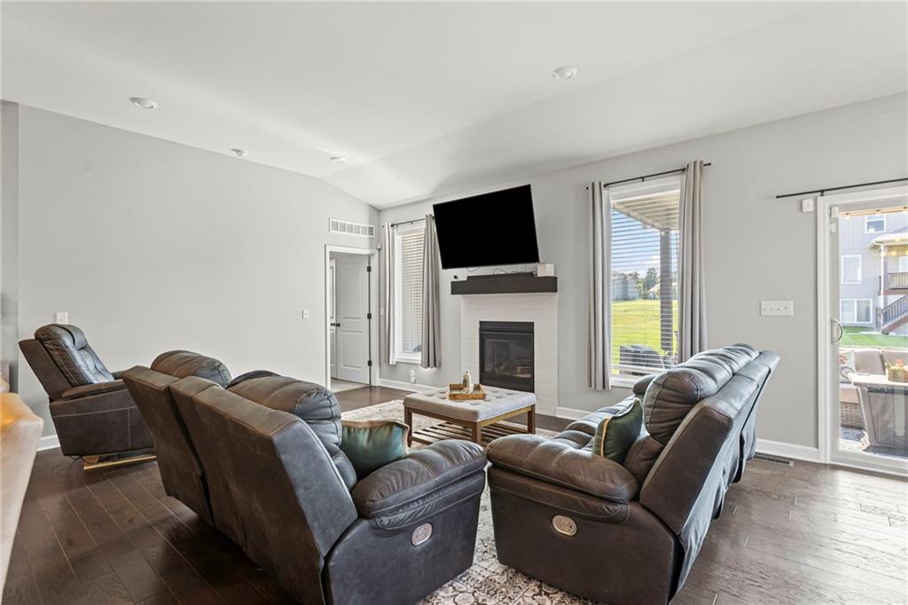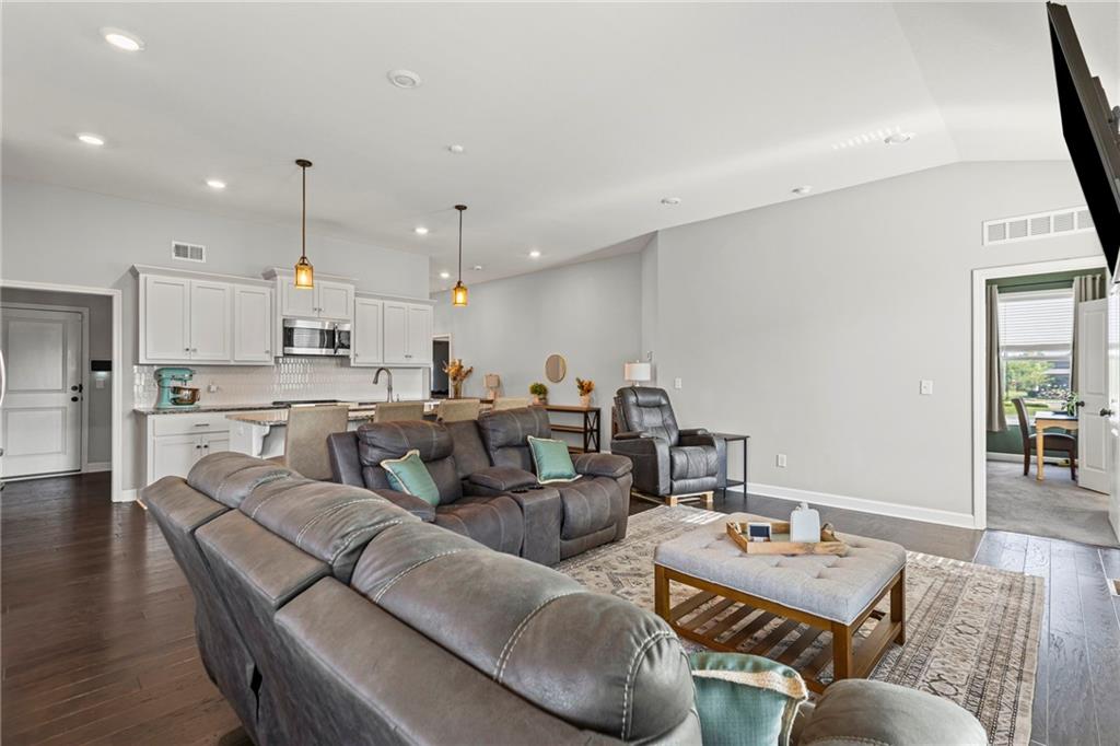 Rarely does a home like this become available in the sought-after Foxwood Ranch community! This stunning 3 bedroom, 2 bathroom villa offers the luxury of maintenance-provided lawn care, fertilizer treatment and snow removal, making it a truly unique find. Step inside and you'll be greeted by an open floor plan with an abundance of natural light streaming through the many windows. This home has been thoughtfully upgraded with high-end features, including a chefs kitchen complete with enamel painted cabinets, a gas range, elegant quartz countertops, and a large walk-in pantry. The main living areas are adorned with beautiful solid wood flooring, and all three bedrooms boast spacious walk-in closets. Full basement ready for you to finish. The attached 3 car garage provides plenty of space for vehicles and storage. Entertain guests or simply relax and enjoy the amazing sunsets from your awesome 14x10 covered patio, which extends to an additional stamped patio for increased outdoor living space. Sprinkler system. This villa combines elegance, convenience, and comfort in one incredible package. Enjoy the amenities provided in this community: clubhouse, state-of-the-art playground and walking trails. Only a few blocks to Wolf Creek Elementary School and Spring Hill High School. 10 minutes to Garmin or I-35.