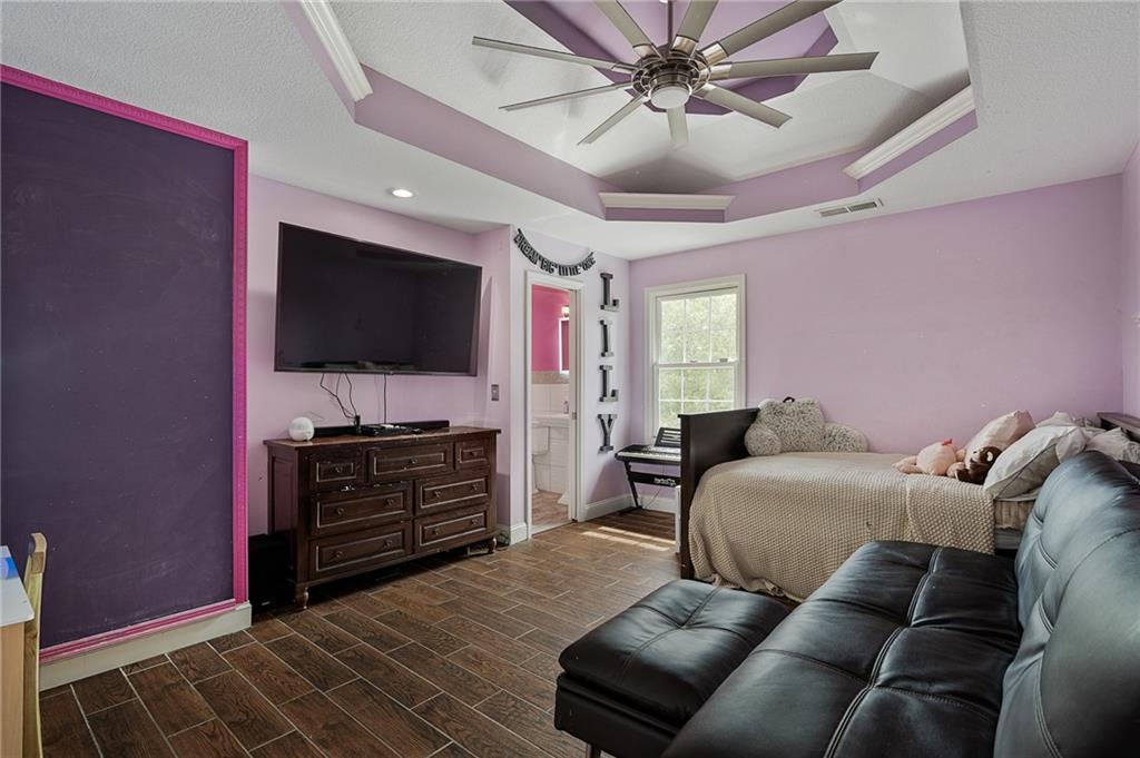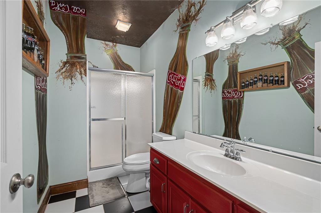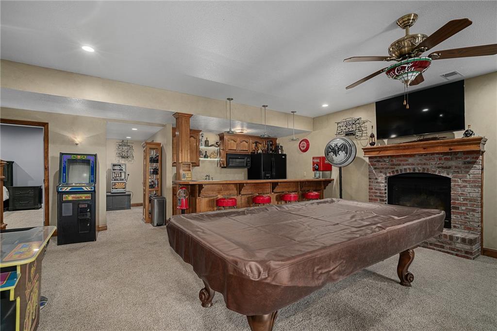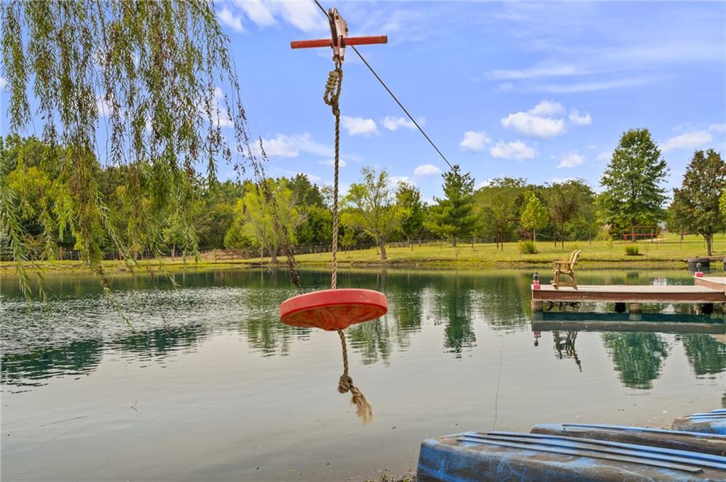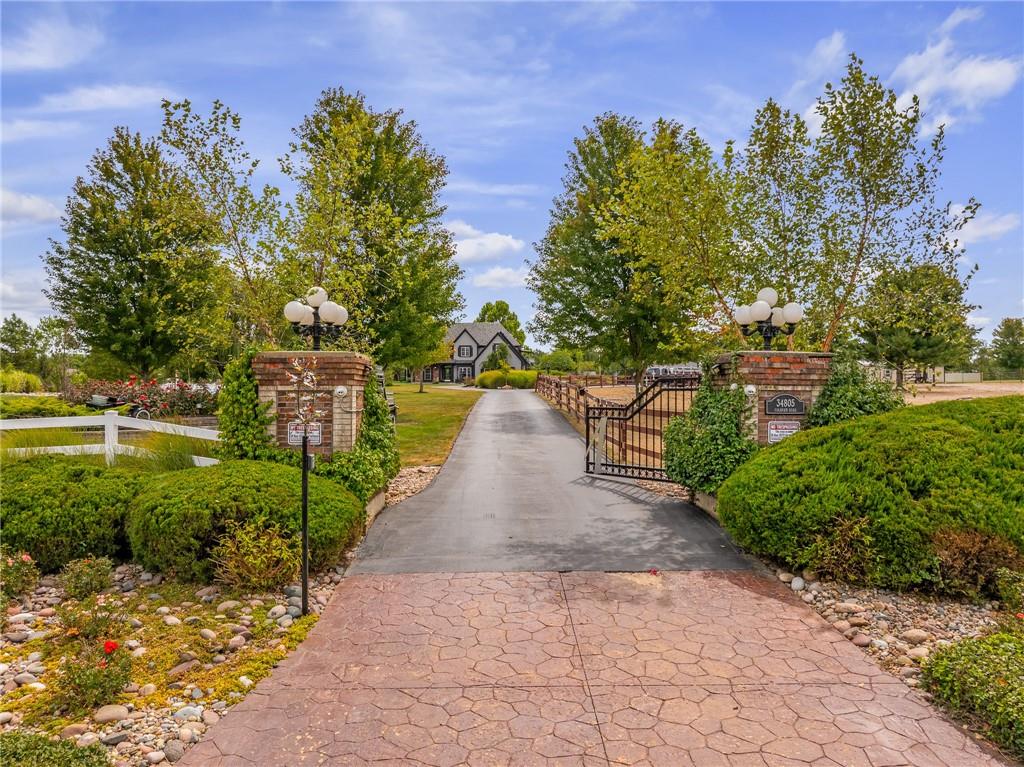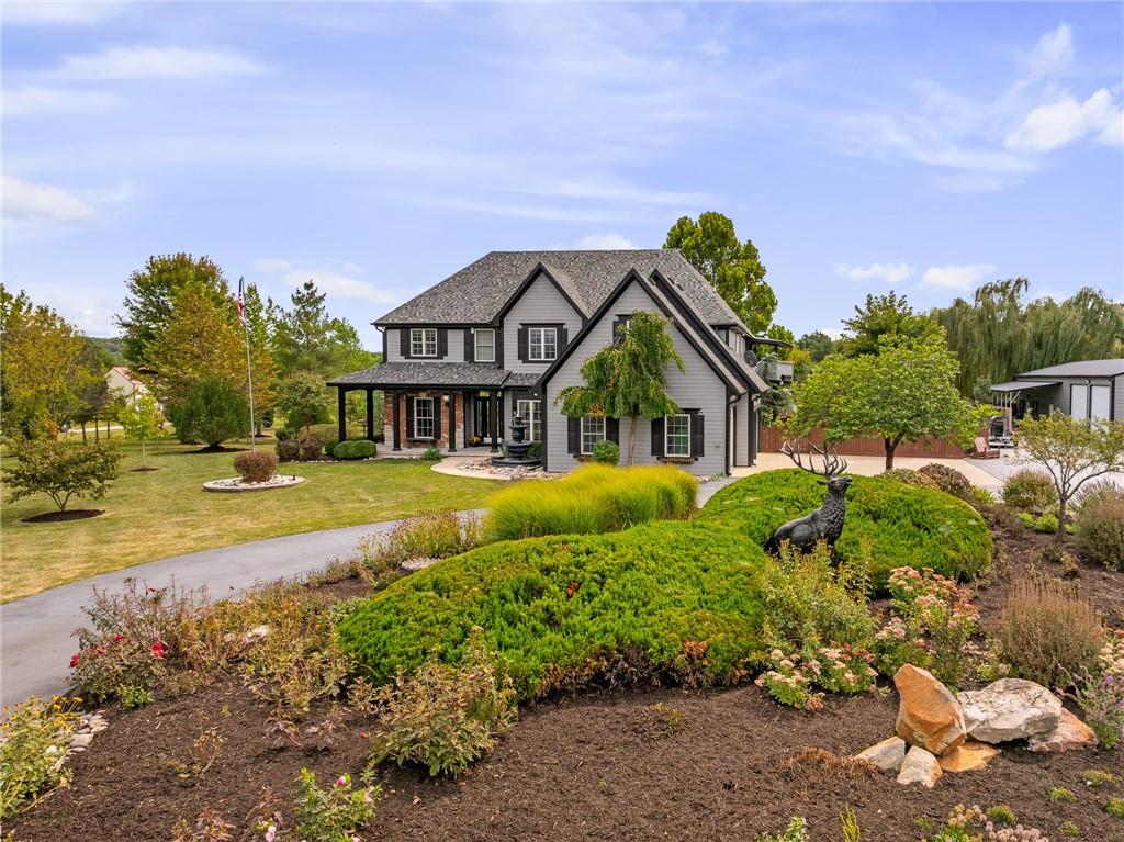 Live, work, and play like never before on this fully fenced, gated 5-acre estate on blacktop in Lone Jack—designed for entertaining, outdoor living, and enjoying the land your way. Whether you're into fishing, paddleboarding, raising chickens, gardening, hosting parties, or running a business from home, this unique property makes it possible. Three scenic ponds set the stage—one with sandy beach, dock, playhouse with hurricane deck, and zip line; another with a 12-foot stone waterfall framed by weeping willows. Outdoor living includes a pool, festive bar, outdoor shower, firepits, fountains, basketball court, and striped parking for nine. A vintage merry-go-round, playground, and wisteria-draped pergola add whimsy, while mature landscaping and unique trees create a lush, park-like setting. Grow and raise what you love: a fenced livestock area with shelters and duck pond supports chickens, goats, or a horse. A large raised garden with drip irrigation and auto-watering is ready for your green thumb. Built in 2006, the two-story home offers comfort and space with hard-surface flooring on the main level, five fireplaces, formal dining, home office, and hearth room kitchen with island seating and Viking six-burner cooktop. French doors open to a fenced dog yard with pergola and hibachi grill—perfect for pets and casual cookouts. Upstairs, four bedrooms each have private baths. The oversized primary suite includes a fireplace, sitting area, walk-in closet, and private covered balcony with mini split—your retreat above it all. The walkout lower level is built for fun and function, featuring a theater, arcade, full bar, non-conforming fifth bedroom, full bath, and access to a saloon-style patio with hot tub and firepit. A newly built outbuilding adds flexibility—with concrete floor, two oversized overhead doors, built-in compressor, and plumbing for future living quarters. Ideal for equipment, hobbies, or home-based business use.