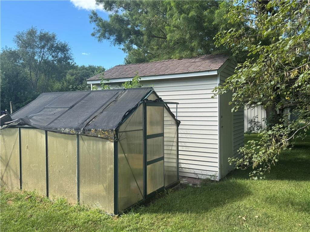 READY FOR SMALLTOWN LIVING! 3 bedroom and 2 Bath one level home is a small town. Master bath has had a recent updo with an updated tub shower and stacking washer dryer. The hall bath has a shower/tub with skylight. Love the outdoors: you will enjoy the Sunroom just off the kitchen (4 patio doors for lots of sun) and large screened porch on the north and newer deck on the front of the house. The large corner lot has a garden space with established asparagus patch and pear and apple trees. You can enjoy the small greenhouse and yard shed that stay and a Cellar in the backyard. There is a detached heated shop/garage with an attached open fronted garage with asphalt drive and added storage area on back. The home has had updated guttering in recent years and skylights Come check out this quite little Nw Missouri town and this lovely home in it.