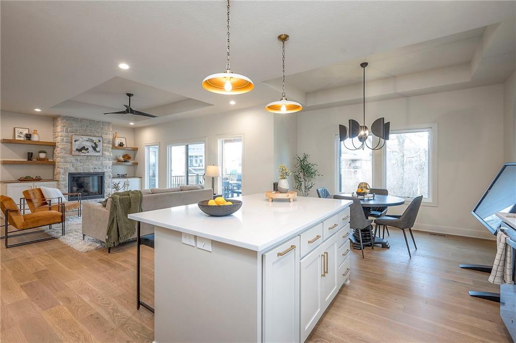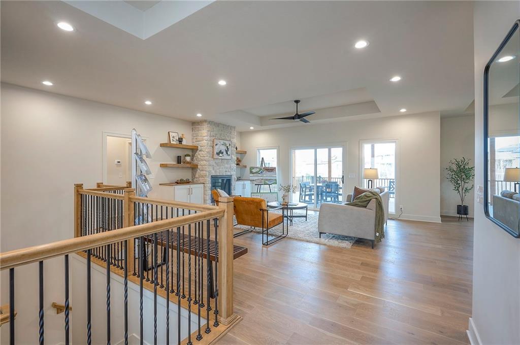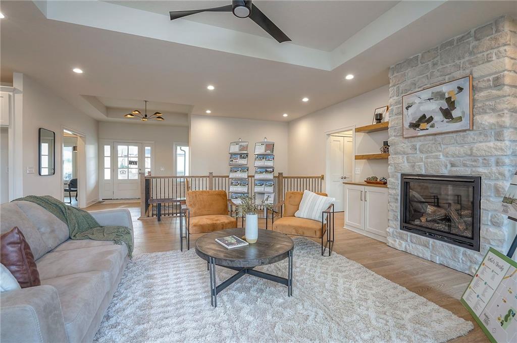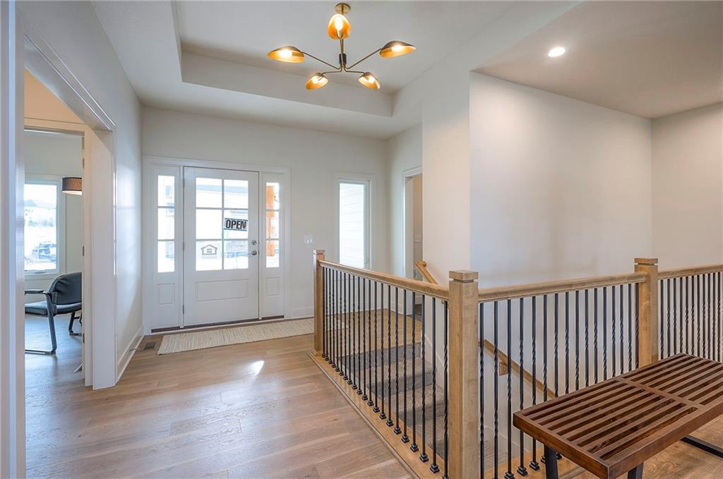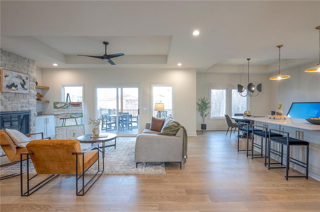 Ready Now! The Addison Reverse Plan by Brian Scott Homes – Lot 99 Boulder Hills | Backing to Trees & Trails |Walk-up/Walk-out Welcome to the Addison, an exceptional reverse 1.5-story home located on coveted Lot 99 in Boulder Hills, offering a rare walk-out/walk-up lot that backs to mature trees and scenic walking trails. This thoughtfully designed 4-bedroom, 3.5 bathroom home is ready now to enjoy your backyard oasis. Discover a spacious, open layout with high-end finishes and custom details inside. The gourmet kitchen is a dream, featuring custom cabinetry, quartz countertops, a large center island, and a walk-in pantry. The adjacent great room showcases a stunning stone fireplace and plenty of space for entertaining. Walk out from the main level to a huge covered deck—perfect for enjoying peaceful, treed views year-round. The front bedroom welcomes natural light through oversized windows, while the primary suite boasts a custom feature wall and direct access to the deck. The spa-like primary bathroom includes dual vanities, a freestanding tub, and a luxurious walk-in shower. You'll love the generous walk-in closet conveniently connected to the laundry room. The oversized garage is a standout feature, measuring an impressive 24.6' x 29.6' with a 6' x 7' bump-out—perfect for your extended truck, workbench, or recreational gear. Downstairs, the walk-out/walk-up lower level offers a large recreation room, two additional spacious bedrooms, and a full bathroom—ideal for guests or family fun. This is the last available home in Boulder Hills backing to the private tree line—don't miss your chance to own in this premier community! Boulder Hills Amenities Include: a beautiful pool with a waterfall, an outdoor kitchen area, walking trails, a playground, a pickleball court, and a community clubhouse. See why Boulder Hills is one of the most desirable neighborhoods around!