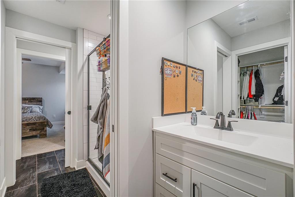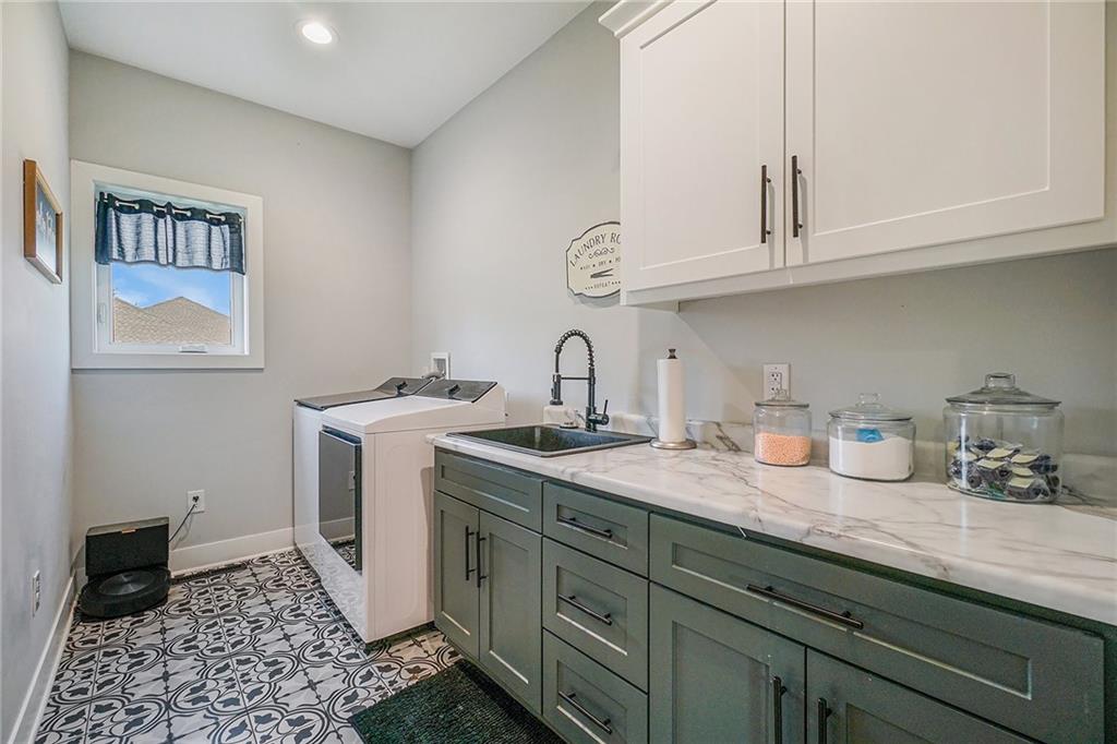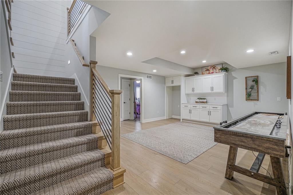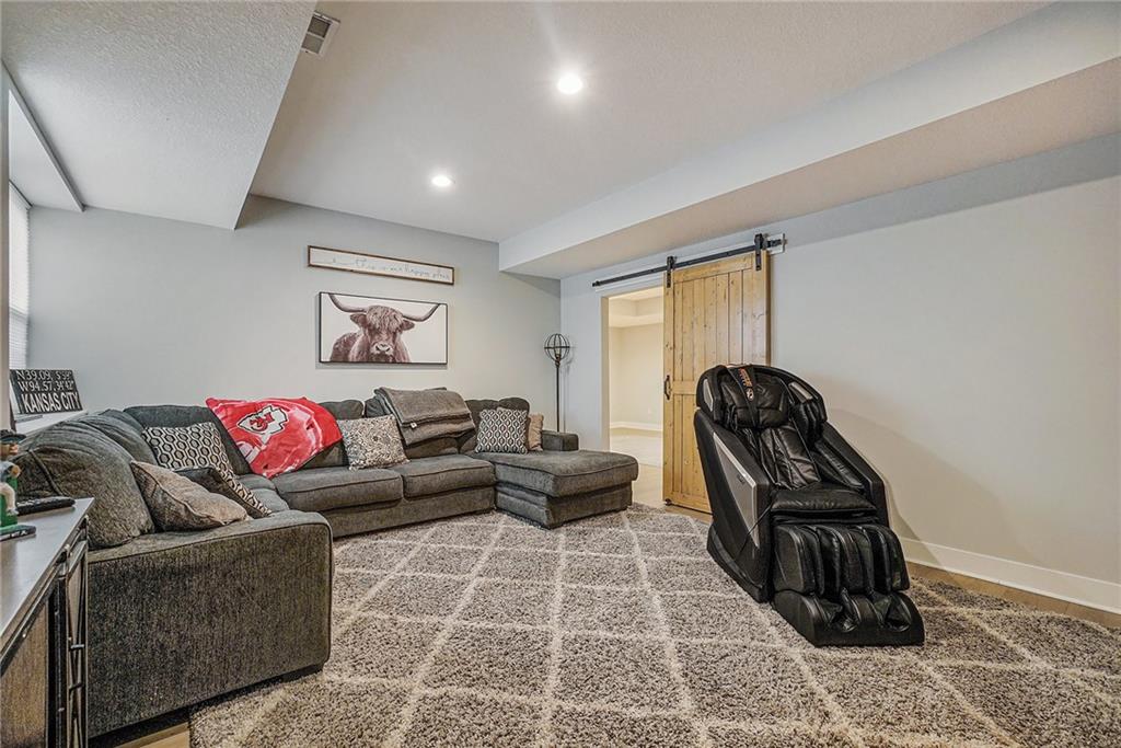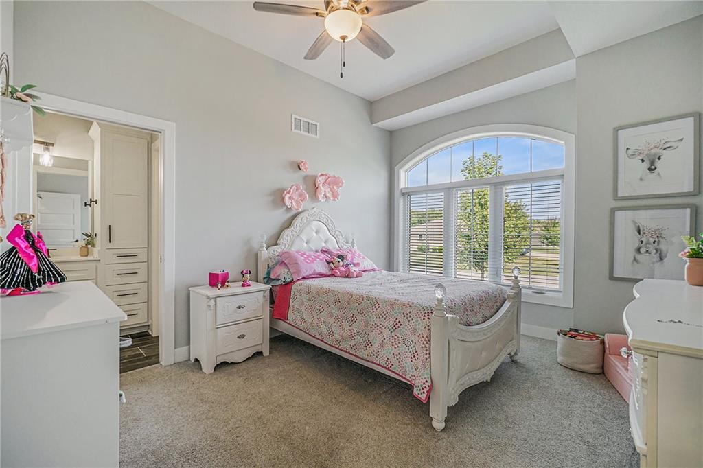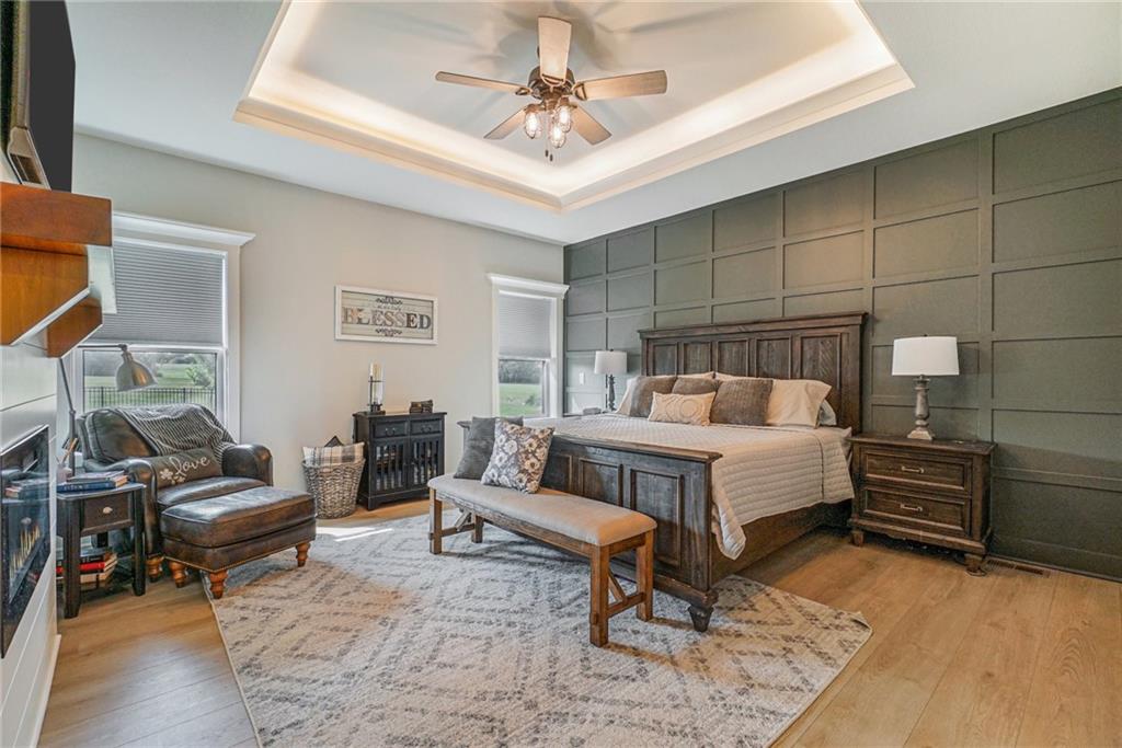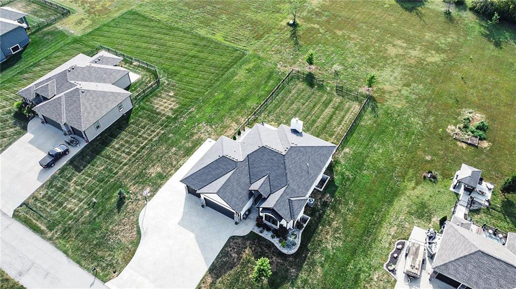 Beautiful 5-bedroom, 4.5-bath reverse 1.5-story home in the popular Shadow Glen of Peculiar. Sitting on 1 acre & backing to open farmland, this tastefully modern home, framed in 2x6 construction, features a fenced portion perfect for kids, pets, or a pool. The oversized 3-car garage with high ceilings includes a tandem bay for storage, a workshop, or even a golf simulator, plus a 40+ ft pad with a 50-amp connection for an RV or trailer. Inside, light, modern tones leading to a spacious open living, kitchen, & dining area. Living room showcases a stacked stone fireplace with custom shelving & cabinets. Chef’s kitchen boasts a grand island, custom cabinetry, gas cooktop, double ovens, farm sink, & a large pantry with beverage fridge. Step outside to a covered deck with a stone fireplace & an expanded patio that connects to the garage & driveway. Main-level primary suite offers a spa-like bath with double vanity, tiled walk-in shower, & laundry access through the walk-in closet. Laundry room equipped with sink, cabinets & counters. A secondary bedroom with private ensuite bath & a convenient half bath complete the main level. Downstairs, enjoy a versatile flex space with a bar and space for a fridge, opening to a large media/theater room. Three generously sized bedrooms with walk-in closets & two full baths complete the lower level. Shadow Glen continues to be a perfect place to escape the city or raise a family; providing a great blend of residents. Large lots allow for privacy but still holds the feeling of community. Quick access to I49/71HWY & desirable Ray-Pec Schools.