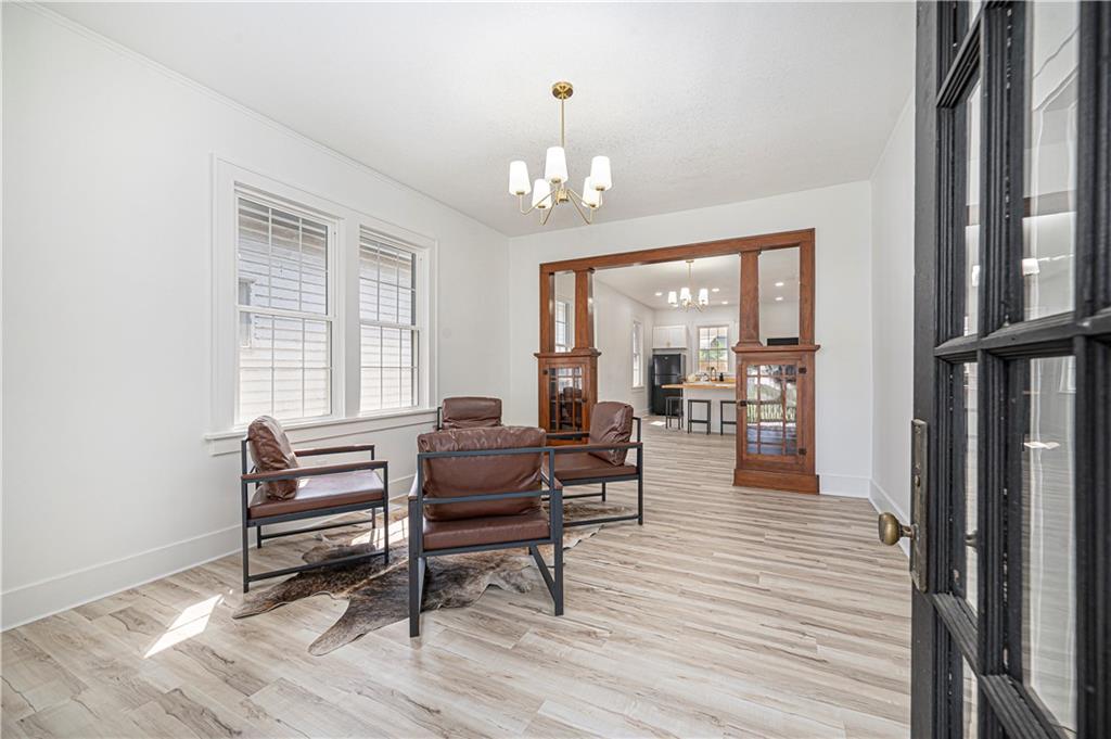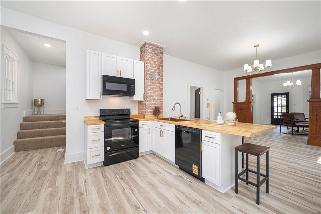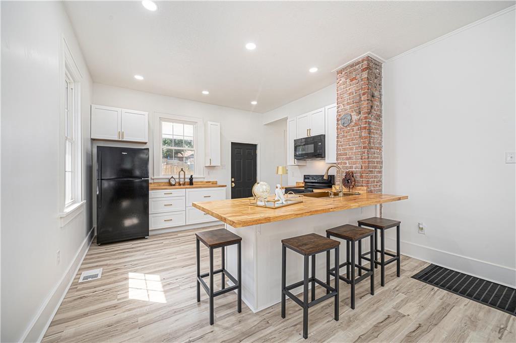Price improvement! Charming 1931 Bungalow, Fully Rebuilt for Today’s Lifestyle! Step into timeless charm with modern convenience in this beautifully rebuilt 3-bedroom, 2-bathroom bungalow. Originally built in 1931, this home has been thoughtfully renovated from top to bottom with today’s buyer in mind. The exterior shines with a new roof, siding, windows, and front porch, highlighted by four stately metal-wrapped columns and the refinished original front door. Inside, you’ll find fresh paint, luxury vinyl plank flooring (scratch- and water-resistant), and restored original trim and built-in woodwork that showcase the home’s character. The open-concept main level flows seamlessly from the living room to the dining area and into the kitchen. Two spacious bedrooms with ceiling fans and high ceilings are on the main floor, along with a full bathroom featuring a vanity with gold accents and a shower/tub combo. The kitchen is a true showpiece with butcher block countertops, new black appliances, crisp white cabinetry, brushed gold hardware, and a bartop with seating for four. An exposed brick accent wall adds a touch of original character. Step out the back door to a cozy porch, privacy-fenced yard, new gravel, and parking for up to four vehicles. Upstairs, discover a spacious primary suite with a walk-in closet and en-suite bathroom complete with double vanities and a shower/tub combo. The refinished basement offers additional living space, perfect for a media room, playroom, or home office, along with laundry hookups. Additional updates include a new HVAC system, hot water heater, and all-new plumbing, giving you peace of mind for years to come. If you’ve been searching for a home that blends historic charm with modern upgrades, this is the one you won’t want to miss!