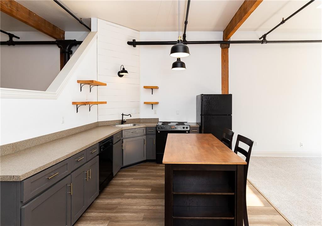 Kitchen featuring black appliances, gray cabinetry, dark wood-style floors, open shelves, and beam ceiling