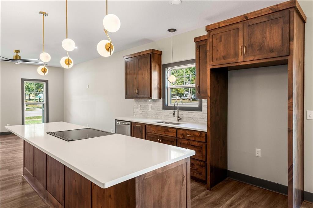 This brand new 3-bedroom, 2-bath home offers one level living and features an open concept floorplan for today's lifestyle. Luxury vinyl plank flooring throughout. Energy efficient led lighting with designer fixtures with brass accents. Kitchen features oversized island with brass faucet, quartz countertops and custom cabinetry. Primary suite off kitchen with access to laundry. Primary bath offers walk in shower. Two nice sized secondary bedrooms Large side entry garage. Patio for relaxing or entertaining. Custom front columns add to the curb appeal of this attractive functional home,