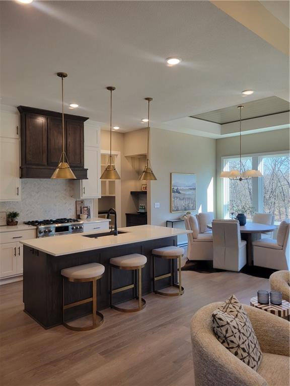 The Gunnison is a beautifully crafted reverse 1.5-story home that balances open living with purposeful design. A charming front porch welcomes you into a striking entryway with soaring ceilings and an open staircase, immediately setting a tone of elegance and light. The great room impresses with dramatic ceiling heights, and a statement fireplace offered in multiple finishes. Designed for both everyday living and entertaining, the space flows seamlessly into the gourmet kitchen and breakfast area. The kitchen showcases a large island, walk-in pantry, and a dedicated coffee bar, while the adjacent covered deck extends your living space outdoors. The main-level primary suite is a true retreat, offering private access to the covered deck and a spa-inspired bath with customizable layouts. A generous walk-in closet connects directly to the laundry room for unmatched convenience. A secondary bedroom and full bath on the opposite side of the home provide a private haven for guests. The lower level is ideal for gathering and entertaining, featuring a spacious rec room with room for a pool table, the option for a full wet bar, and walkout access to a covered patio. Two additional bedrooms, a full bath, and ample storage areas complete this level.