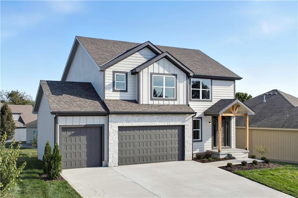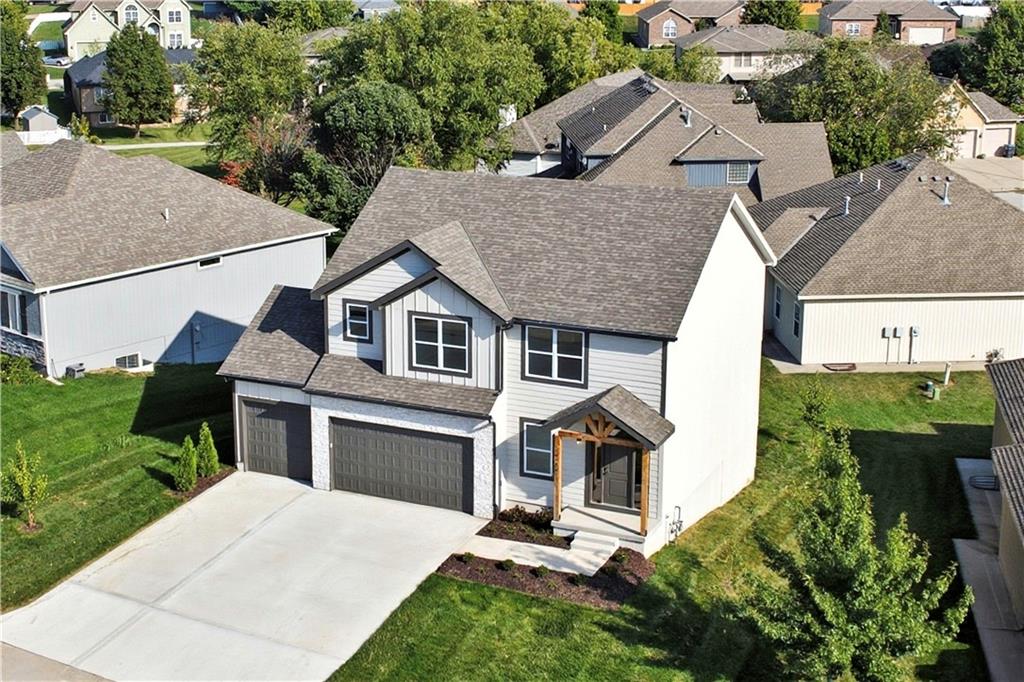 “The Carlyle", the latest innovative floorplan from Dave Richards Homebuilding, INC. The main level features a private office, open concept kitchen / family / dining area and a conveniently located half bath. You'll love the ample storage space in the U-Shaped kitchen design, which also allows for a sink with window overlooking the backyard! An island and walk in pantry complete the kitchen, which opens to the large dining area and big family room with fireplace and wall of windows offering lots of natural light. Upstairs you'll find four spacious bedrooms, including the owner's suite which features dual walk-in closets & a spacious bathroom with dual vanities. The large second full bath upstairs also boasts two vanities and shower/tub combo to accommodate your needs. Three other generously sized bedrooms finish out the upper level-- one with its own walk in closet. The walk in laundry room is also featured on the bedroom level, making that household chore as convenient as possible! Large Yard features an irrigation system, make lawn care much easier. Four Pillars offers walking trails, is serviced by the award winning Grain Valley School District, included the coveted Prairie Branch Elementary School. You're also within walking distance of Grounds Park-- which offers miles of walking/biking trails and a community lake. Exceptional quiet location, yet just minutes from the Adam's Dairy Shopping/retail corridor and easy access to I-70 for quick commuting around town. Beautiful home, fabulous community!