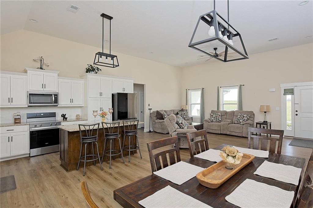 Like new inside and out! Enter this nearly new home and step into an expansive open living area with soaring 12' ceilings. The kitchen features stainless steel appliances, granite countertops, two pantry spaces and a large island. 9' ceilings are throughout the rest of the home. The spacious primary suite includes a long double vanity area, large shower and generous walk-in closet. Two more substantial-sized bedrooms share a hall bath. An oversized two-car garage provides additional storage for vehicles and more. This great ranch home is situated on 4 acres on the outskirts of Kingsville--just minutes away from Holden and only 15 minutes to Pleasant Hill. Enjoy modern living with views of fields from your front porch and back patio. This is a great opportunity to live in a new, contemporary home while enjoying the peacefulness of country living. This is a "must see" property!