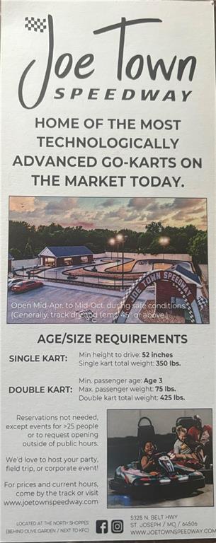 Location! Location! Location! N. Belt Hwy near N. Shoppes (high traffic) hotels, retail, restaurants, businesses & residential neighborhood. Joe Town Speedway is a recreational go cart speedway directly behind Cheddars & Olive Garden off if the N. Belt Hwy. This turnkey property includes all go carts, equipment, signage. The ticket stand is 18? x 18?. The kart garage is 48x 30 with 10"ceilings. The tool storage is 10ftx10ft.