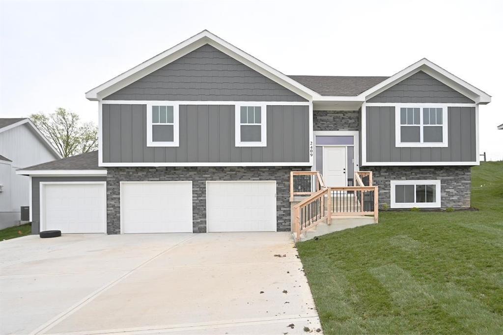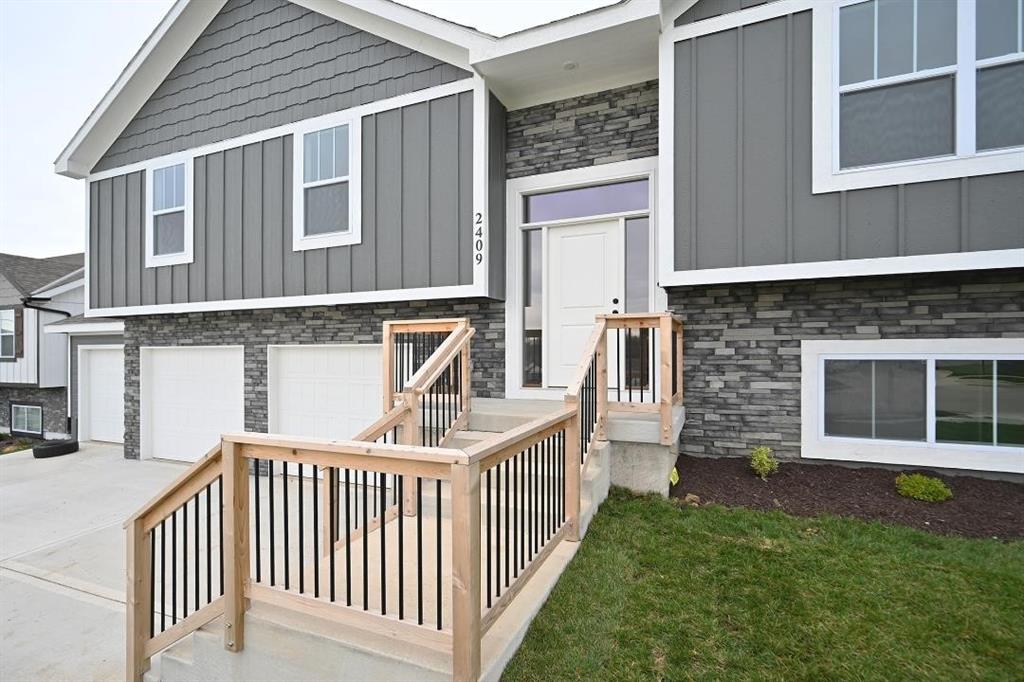 Stunning Custom Home with Modern Features and Inviting Spaces Welcome to your dream home! This exquisite property showcases an open floor plan, ideal for both entertaining and everyday living. The elegant kitchen boasts pristine white granite countertops, custom cabinets, and stainless steel appliances, all seamlessly flowing into the spacious living area centered around a beautiful fireplace. Step outside to discover a covered deck complete with a fan and light, perfect for enjoying serene views of the adjacent pasture. The rich feel of this home is accentuated by LVP throughout and vaulted ceilings enhancing the sense of space and light. The laundry room features stylish tile, while two generously-sized guest bedrooms offer plush carpeting, ceiling fans, and trey ceilings, creating a comfortable retreat for family and friends. The guest bath is tastefully designed, highlighting a tiled tub and a marble vanity that exudes luxury. Retreat to the master bedroom, a good-sized haven with carpet, a ceiling fan, and sophisticated trey ceilings. The walk-in master closet provides ample storage, while the en-suite master bath features elegant tile flooring, a double vanity with sleek black faucets, and a spacious tiled shower. The lower level invites you to enjoy a large fourth bedroom, complete with carpeting and a ceiling fan, alongside a substantial family room perfect for movie nights. The additional full bath boasts a tiled floor and a shower for convenience. Completing this remarkable home is an oversized three-car garage, providing plenty of space for vehicles and storage. The front of the house is adorned with beautiful stone, adding to the curb appeal with shutters to boost the look. Don’t miss the opportunity to make this luxurious yet inviting home your own! SIMULATED PHOTO'S NEW ONES COMING SOON - THE POND IS STOCKED FOR FISHING