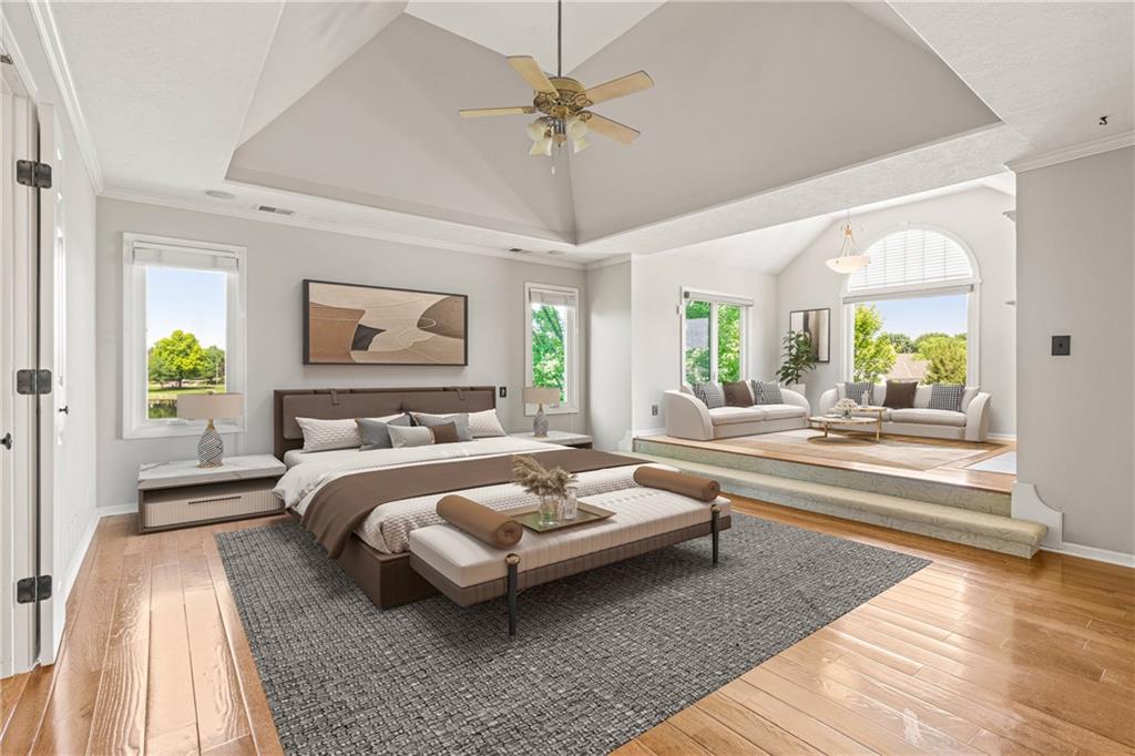 Location unlike any other in Lionsgate! This beautiful 2-story home backs to the neighborhood pool, tennis & basketball courts, playground, and overlooks the picturesque neighborhood lake—offering stunning views from the kitchen, breakfast nook, hearth room, and primary bedroom.Blue Valley's award-winning Lakewood Elementary and Middle Schools are just a safe, 10-minute walk away through quiet neighborhood streets.The kitchen is a chef’s dream with leathered granite and quartzite countertops, a custom-designed island, tile backsplash, slide-out shelving, and top-tier appliances—including a Wolf 4-burner gas cooktop with 24" griddle, Best downdraft hood, Café French-door refrigerator, and Monogram dishwasher.The cozy hearth room features a real stone fireplace with an Amish-made barn beam mantel from the 1880s. The spacious primary suite offers a gas fireplace, luxurious bath with jetted tub, double vanity, and an enormous double-sided walk-in closet.The finished basement is perfect for entertaining with a home theater featuring a drop-down screen, projection system, surround sound, and gaming hookups—ideal for family movie nights or watching big games. Plus, a hidden man-cave or she-shed with built-ins, drawers, and a workbench is tucked inside the oversized storage room.Most windows are energy-efficient, triple-pane premium Thermal King windows. An Andersen sliding glass door was recently added in the basement. The home is virtually soundproof and weatherproof. Step outside to your private backyard retreat featuring a full outdoor kitchen with natural gas grill and Brentwood countertops, a double-sided stone fireplace with water features, flagstone patio, Hot Springs Spa, and a stunning tankless waterfall for tranquil ambiance. Lush landscaping and mature trees surround the property. High-efficiency HVAC and water heaters, plus an extended home warranty through AB May, offer peace of mind. A true resort-style haven you’ll be proud to call home!