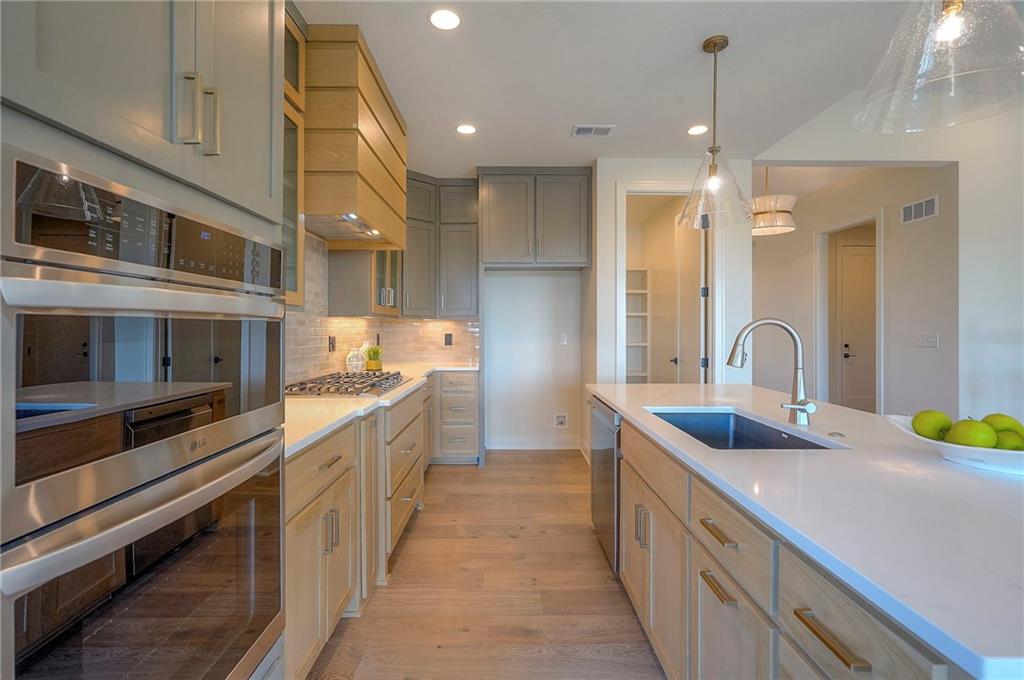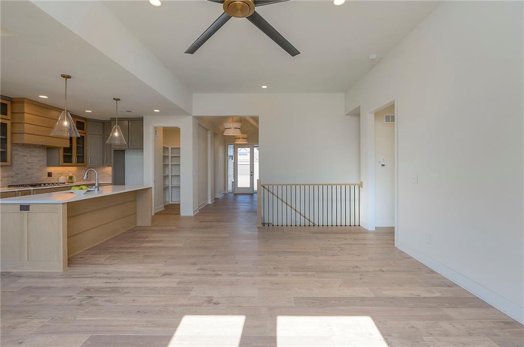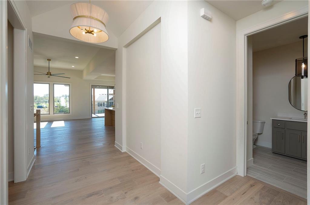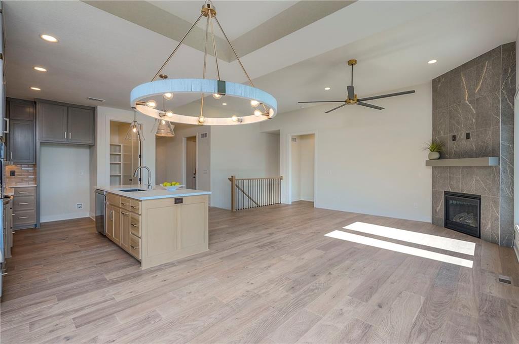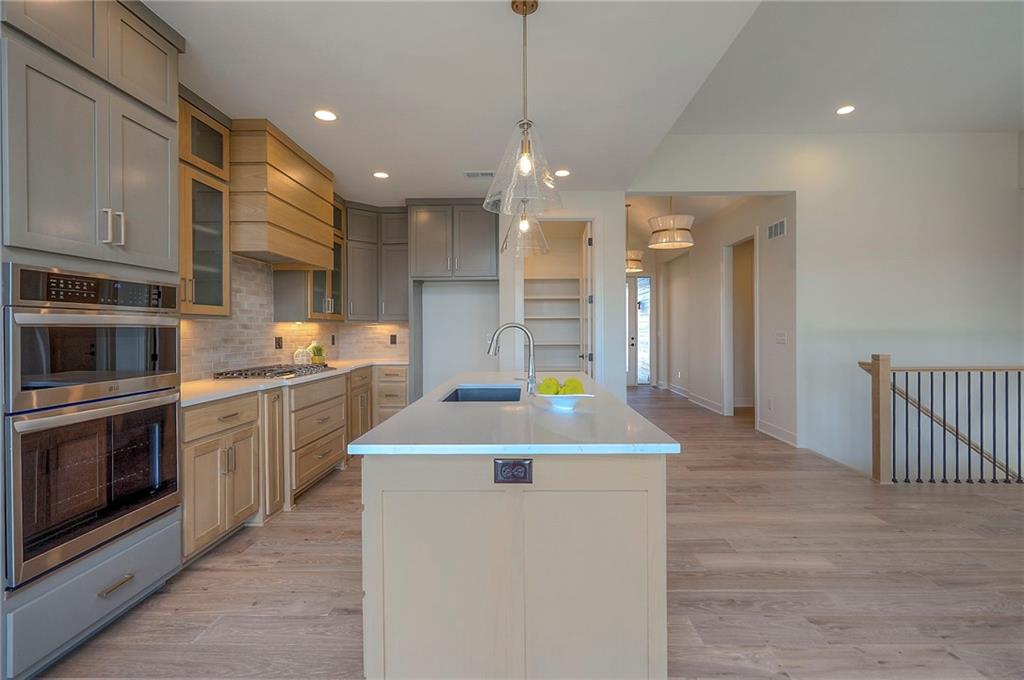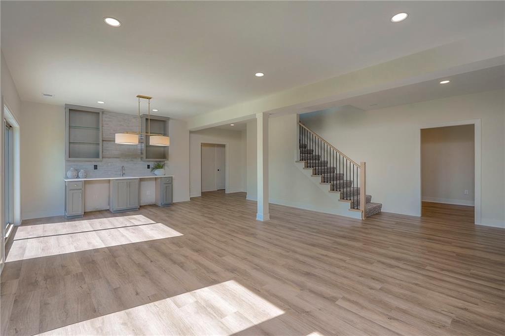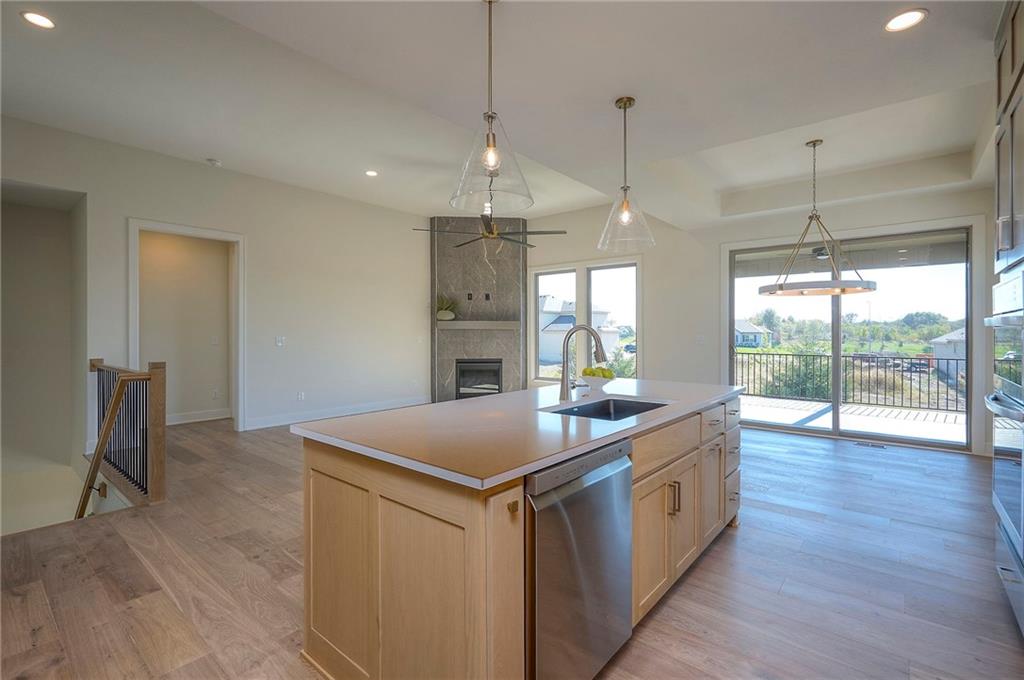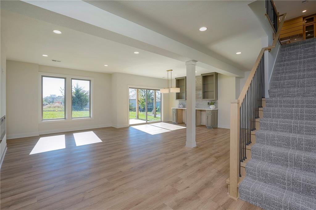 Picture perfect and ready to move in Whitney Reverse plan by L & G Homes. Open concept plan includes hardwood floors and tile throughout the entire first floor. Kitchen boasts large eating island, walk-in pantry, custom cabinetry with pullout spice cabinets, solid surfaces and stainless appliances. Master suite includes hardwood floors, custom trimmed walk-in closet, oversized master shower, double vanities and direct access to the laundry room. Additional first floor bedroom with access to a full bath. Walkout lower level has luxury vinyl plank flooring throughout. Lower level has family room, fireplace, wet bar that accommodates 2 beverage refrigerators, 2 additional bedrooms, full bath and a bonus room that could be utilized as an office or craft room. Enjoy the covered deck and lower level patio. Home includes 8 foot interior doors on the main floor, spacious garage, and lawn irrigation. Home backs to community greenspace area and walking trails. Home is located in Woodland Trails, an outdoor lifestyle master planned community featuring miles and miles of paved walking trails, resort style pool, playground, sports field and fishing pond with fishing dock. Don't miss this opportunity to make this beautiful house your new home!