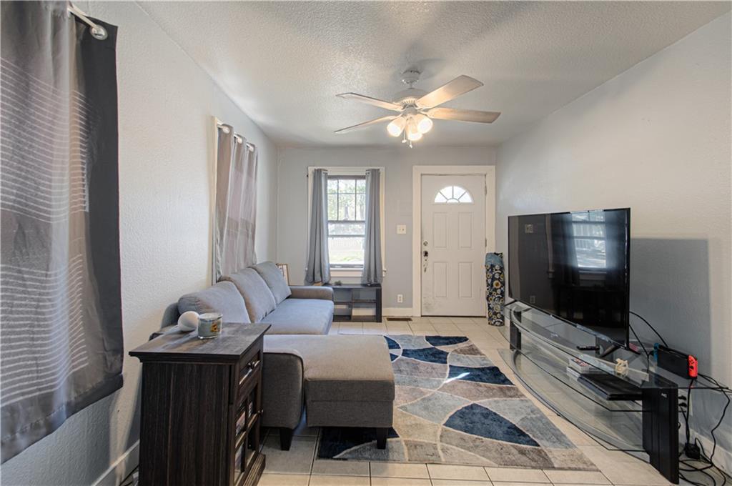 Living room with light tile patterned floors, ceiling fan, and a textured ceiling