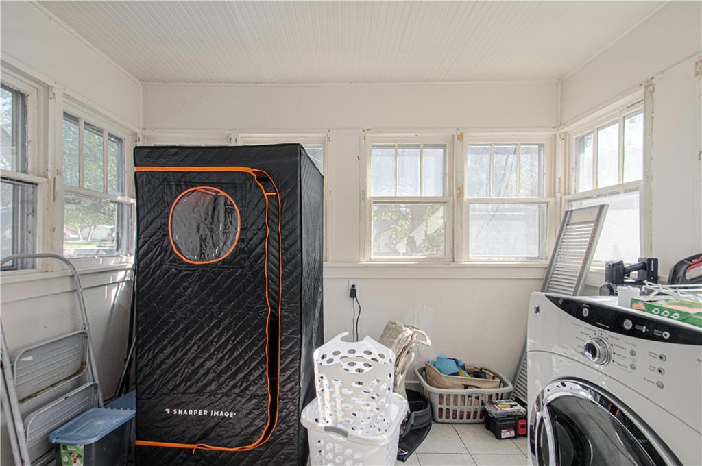 Laundry area with washer / dryer, light tile patterned flooring, and a sunroom