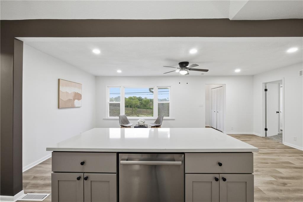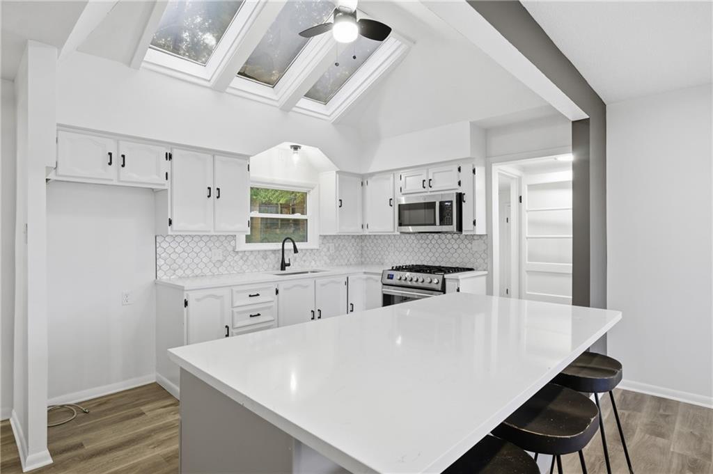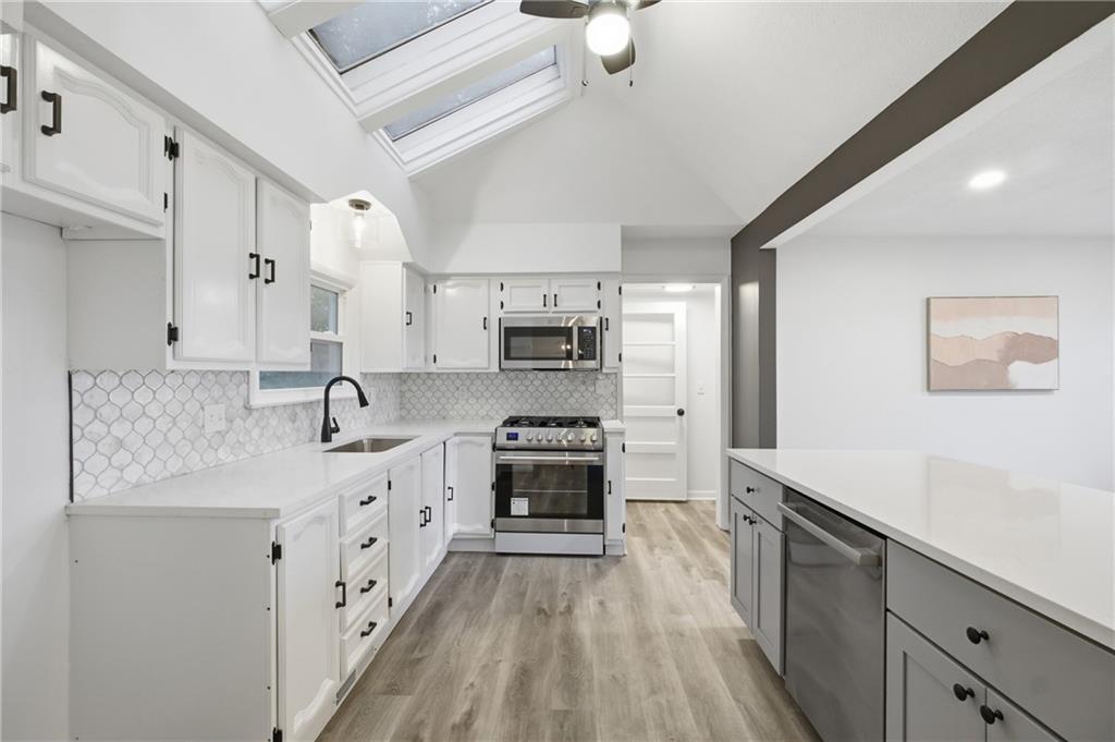 This beautifully renovated ranch in Kansas City combines fresh, modern design with everyday comfort. Each bedroom features its own attached full bathroom, offering convenience and privacy. The heart of the home is the bright, modern kitchen — complete with brand-new stainless steel appliances. Skylights fill the space with natural light, and the kitchen sink overlooks the spacious backyard — a perfect view while you cook or unwind. The open concept main living space features an oversized picture window with a peaceful view of open sky, grassland, and trees- a rare find in this part of the city. Sitting proudly on a corner lot with nearly half an acre, there’s plenty of room to garden, play, or entertain outdoors. Inside, you’ll appreciate the main-floor laundry room, a primary suite with a walk-in closet, and an attached 1-car garage. The partial basement allows access for utilities, shelter, and extra storage. Located less than five minutes from Arrowhead and Kauffman Stadium, this home offers quick access to some of Kansas City’s best game-day experiences while still providing the feel of a residential neighborhood.