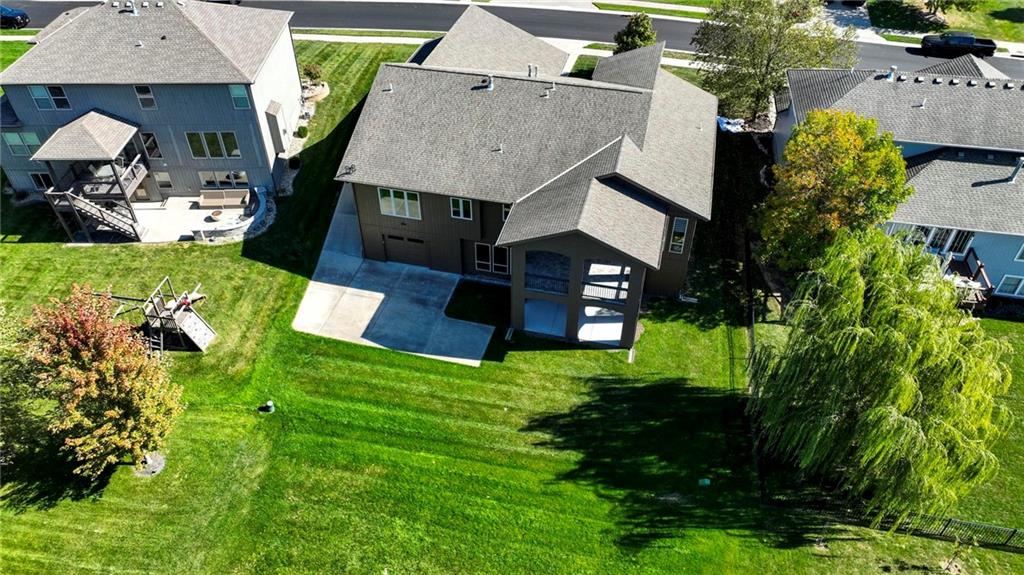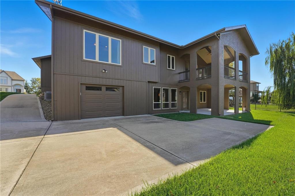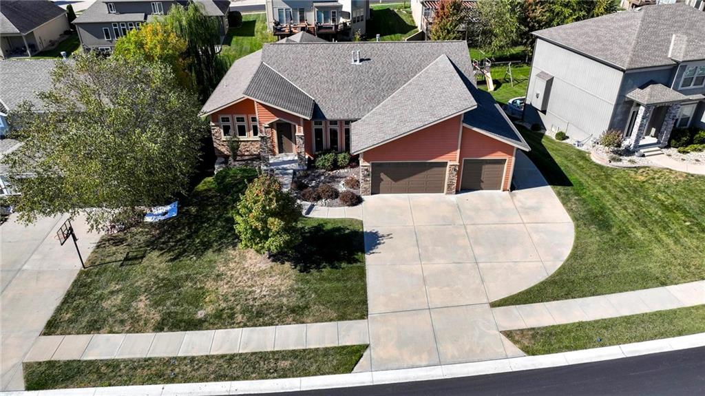 Exceptional custom home designed with entertaining in mind. Stunning walnut floors from the gracious entry, through the great room, kitchen & breakfast room. Great room has vaulted ceiling, gas fireplace in stone accent wall, built-ins & floating shelves. Kitchen has large island, top of the line appliances including built-in Frigidaire Professional refrigerator/freezer, cooktop with vented hood, dbl oven, microwave & dishwasher. Pantry is 5x16 with built in desk under window, tons of shelf space. Breakfast nook is ideal for banquet, full glass door out to Lanai, vaulted ceiling, ceiling fan. Bonus main level family room has 19' bar w/custom cabinets, granite counters, stone walls behind bar, 2nd 15' long serving bar with tons of storage, granite countertop & mid century design. Family room has 15' vaulted ceiling with tongue & groove ceiling & beams. A beautiful den space, or room for baby grand piano, under the beautiful fixture plus additional dining space surrounded by windows & door out to large covered Lanai with tile floor. The primary suite is large with vaulted ceiling & luxury bath with separate vanities, very large tiled shower, dream 10x18 walk-in closet with large dresser island, walks through to laundry. Staircase to lower level with custom glass panel railing, large windows flooding the stairway with natural light. Large family room with wet bar area with tiled floor. 1 guest suite with bath & large walk-in closet, 2 additional bedrooms have walk-in closets, each with private vanity spaces, share shower. 1 bedroom has a secret passageway through built-in bookcase, to 8x9 storm area/storage under front porch! New covered patio off lower level family room is 20x13. Car lovers, a bonus 4th garage, has driveway from main level, is 22'd x 19'w. The main level 3 car garage is oversized, 31'wide, with 11' ceiling, 2 car side is 24'deep, 1 car side 29'deep with 9' wide door. North Shore is Cass County, Lee's Summit Schools.