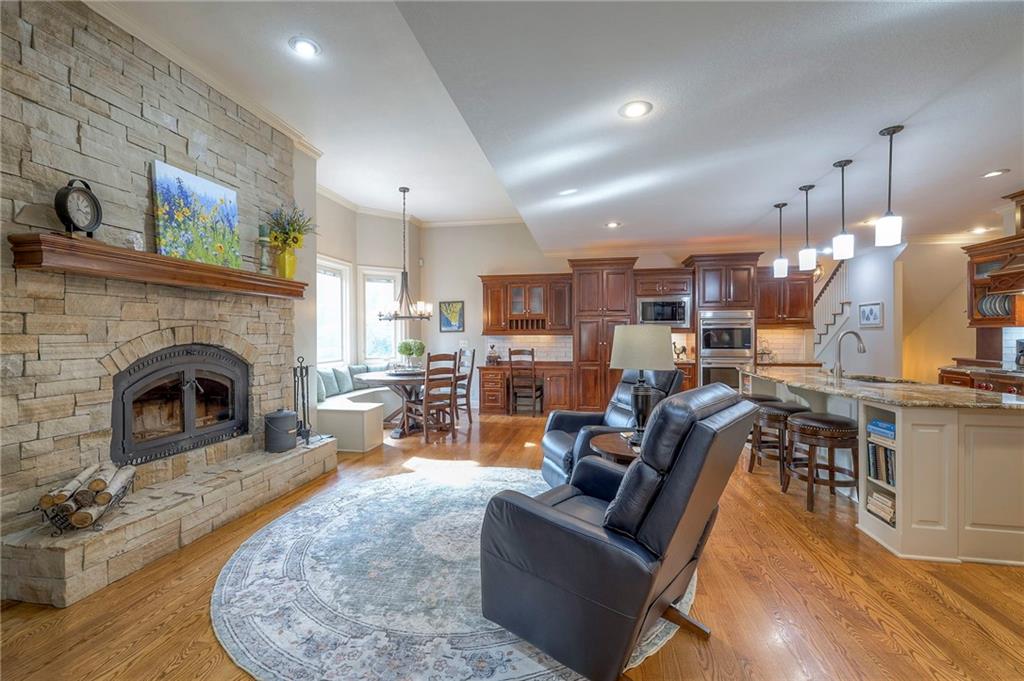 Welcome home to this stunning custom-built 1.5-story residence offering over 6,400 sq. ft. of beautifully designed living space in one of Overland Park’s most desirable neighborhoods. Step through the grand double-door entry into a welcoming foyer that sets the tone for what’s ahead. The oversized formal dining room is ideal for holiday gatherings and entertaining. The main-level living room impresses with its tall ceilings, elegant fireplace, built-in bookshelves, and incredible natural light—it’s a space you simply have to see in person. The gourmet kitchen is fabulous, featuring an oversized hearth room, a Wolf gas cooktop, a beverage fridge, a large kitchen island with seating, abundant cabinetry, and ample counter space—perfect for everyday living or hosting friends and family. The laundry room is conveniently located on the main level and offers plenty of extra space for functionality. The primary suite is a retreat of its own, complete with tray-vaulted ceilings, gorgeous hardwood floors, and a newly remodeled spa-like bathroom featuring a freestanding soaking tub, walk-in sauna, walk-in shower, and an expansive closet. Upstairs, you’ll find three spacious secondary bedrooms, each with fantastic closet space, plus a bonus loft area ideal for a reading nook, study space, or playroom. The finished lower level is an entertainer’s dream—boasting a large rec room with fireplace, second kitchen and bar area, room for a pool table, kids’ play area, and a dedicated exercise room. The home also features a suspended garage, providing an abundance of extra storage space, and the walk-up/walk-out design adds both light and convenience. Step outside to a fully fenced backyard featuring black metal fencing, a composite deck, and a large patio—the perfect setting for outdoor relaxation or entertaining. This home truly has it all—incredible design, comfort, and craftsmanship—and must be seen in person to be fully appreciated!