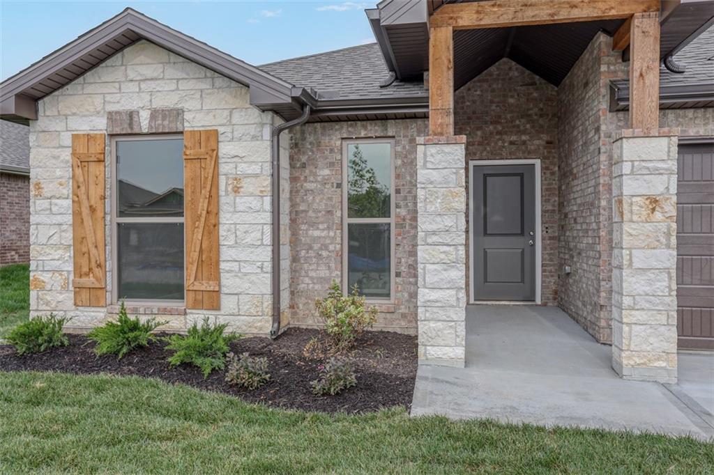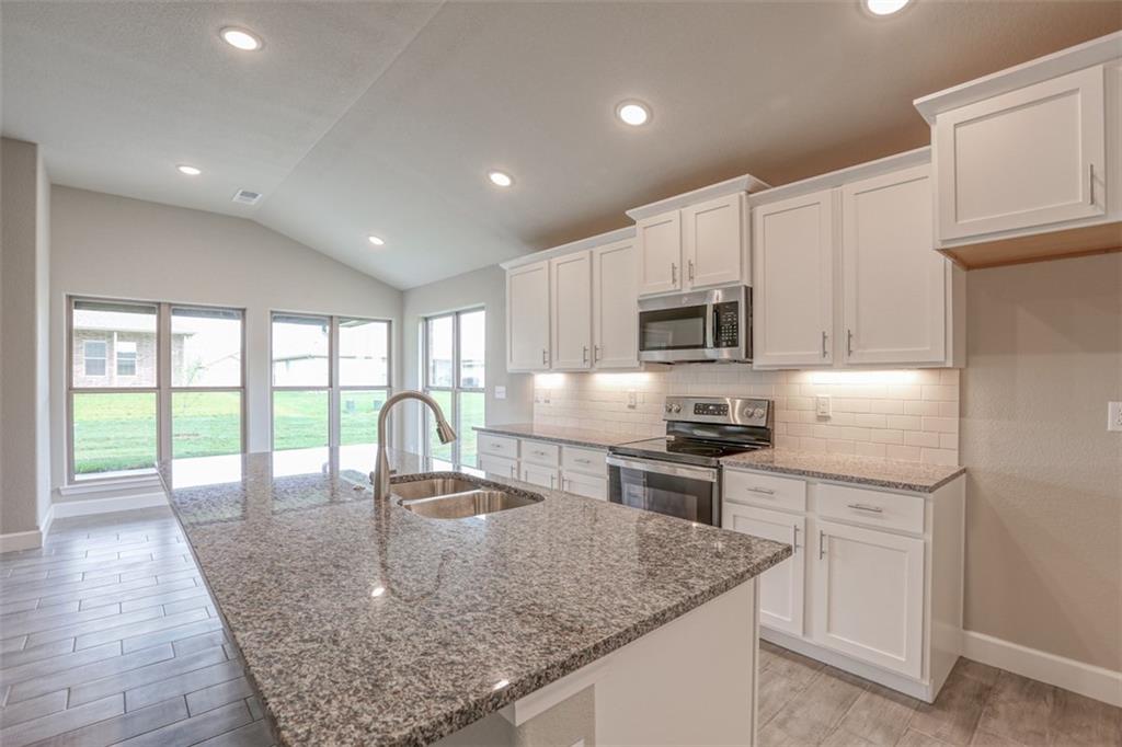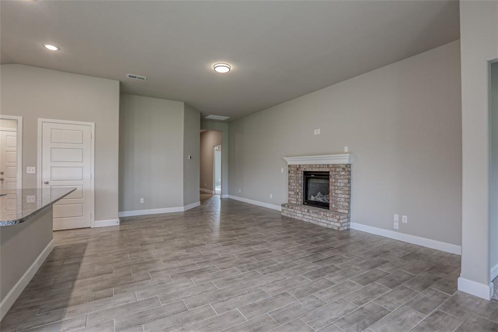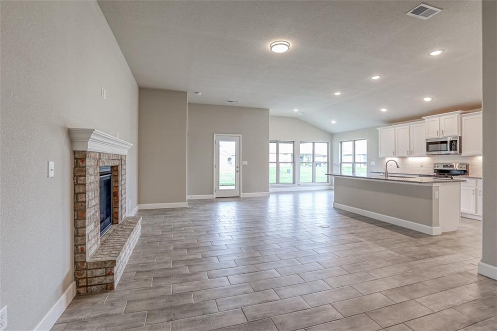 This traditional ranch-style home showcases a timeless exterior with cedar-accented details, stone accents, and a welcoming front tower. Inside, the open-concept layout connects the kitchen, dining, and living areas for seamless flow and comfort. The kitchen features a spacious center island, while the living area includes a cozy fireplace and direct access to a large back patio — perfect for entertaining or relaxing outdoors. Photos are a representation of the Christine floor plan. Selections may vary from this home, and plans are subject to minor changes.
