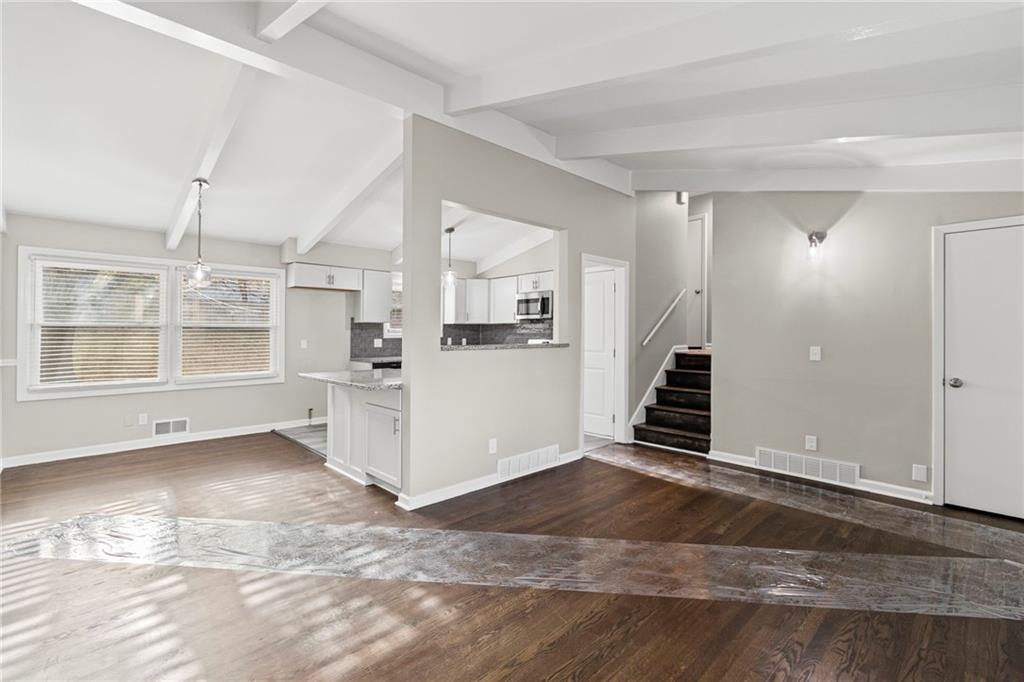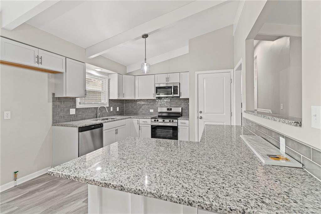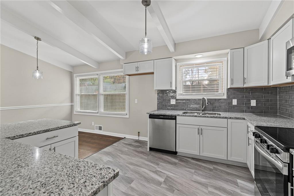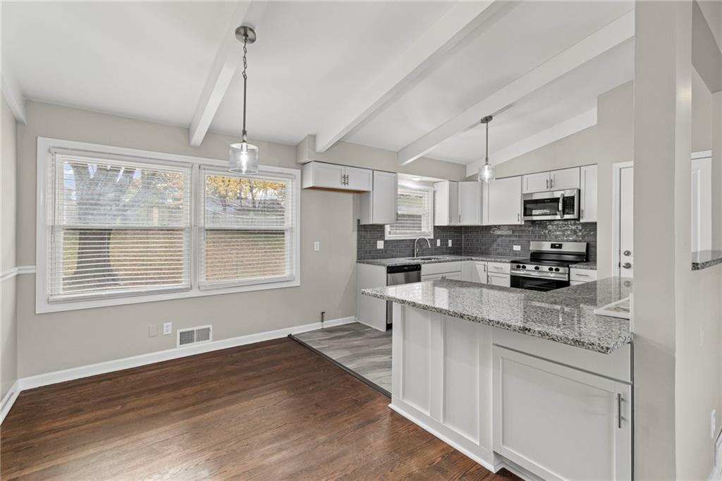 **1% BUY DOWN AVAILABLE AT NO COST CALL LISTING AGENT FOR MORE DETAILS** MOVE IN READY! Total remodel! Fresh paint in and out. You'll love the warmth of hardwood floors and the character of wood-beamed vaulted ceilings. The updated kitchen features timeless white cabinetry, granite countertops, a modern tile backsplash and new stainless-steel appliances. BONUS room off dinning room that could be 4th bedroom with new bathroom. Both bathrooms have been fully revamped for a fresh, modern feel. The finished basement expands your living space with a large recreation room that’s perfect for guests, kids, or movie nights. 6' privacy fence in large back yard. Great Gladstone location. Walk to school, park w/playground, basketball & tennis.