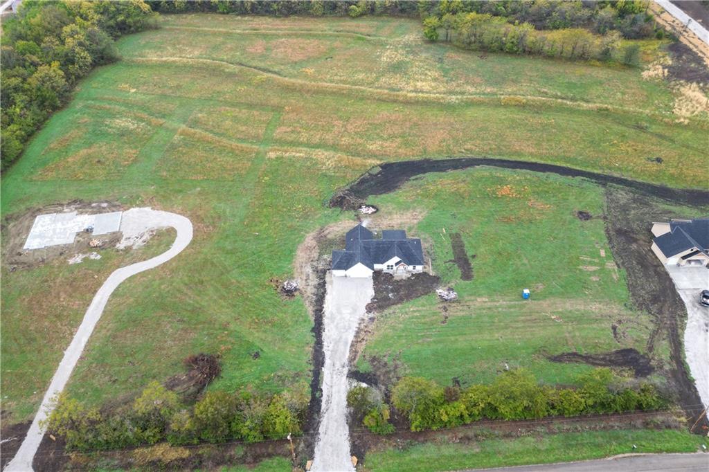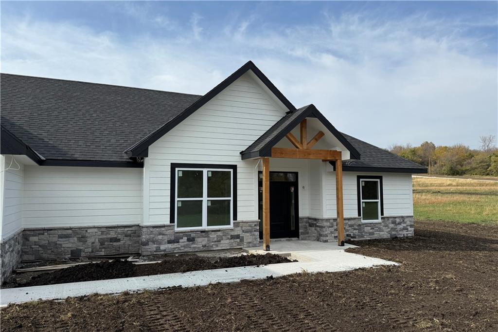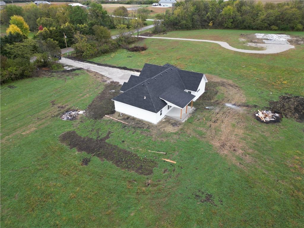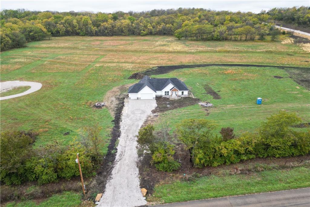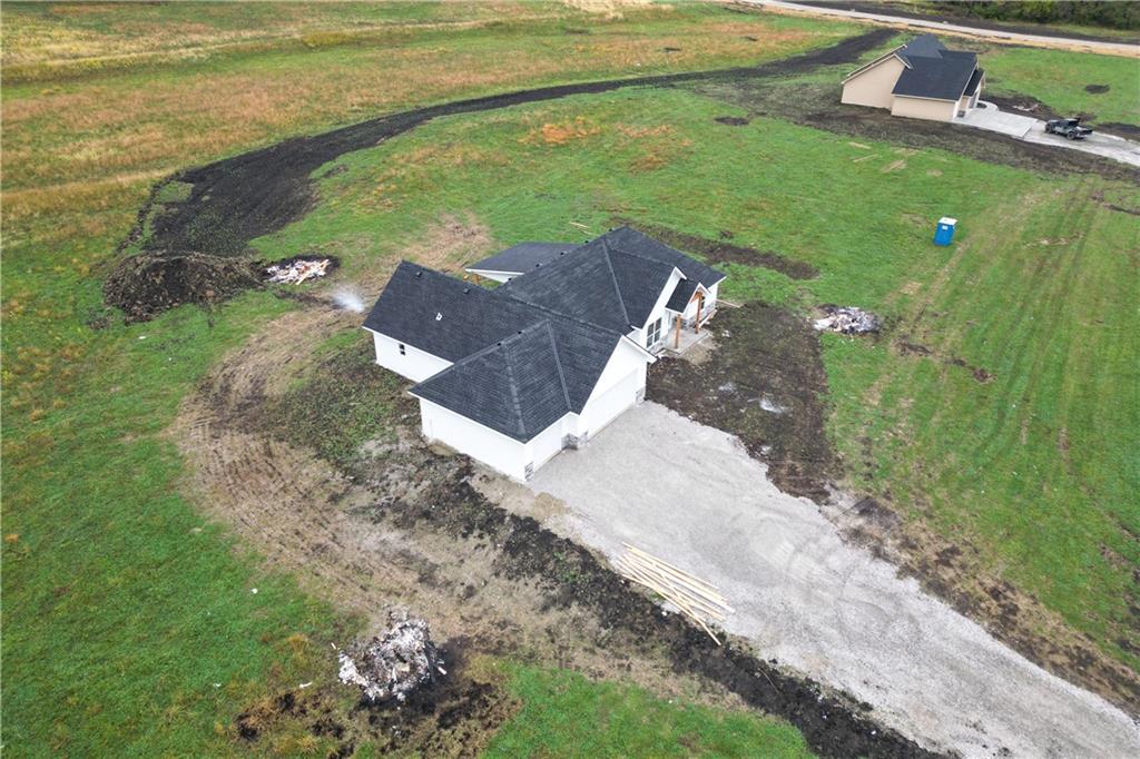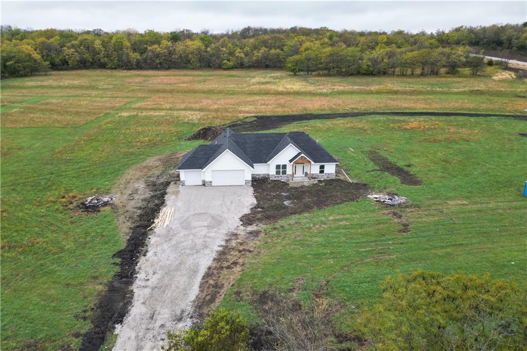 Brand-New Ranch on 5.03 Acres – Ready Mid-December! Experience the perfect blend of peaceful country living and modern comfort in this brand-new ranch home, nestled on 5.03 acres just 1.5 miles off Hwy 50, right next to Powell Gardens. Step inside to a spacious Great Room featuring a vaulted ceiling, electric fireplace, and abundant natural light. The kitchen shines with granite countertops, a center island, ample cabinetry, and a walk-in pantry—ideal for everyday living or entertaining. Off the pantry is a built-in storm shelter for peace of mind! Your primary suite offers a touch of luxury with a tray ceiling, double vanities, walk-in shower, and private commode room. The huge walk-in closet connects directly to the laundry room for added convenience. Additional bedrooms and a full bath with a tub/shower combo complete the layout. You'll love the covered back patio overlooking gorgeous acreage views—perfect for your morning coffee or evening unwind. Located on a chip-and-seal access road, this home combines rural tranquility with quick highway access—making it a dream spot for commuters!
